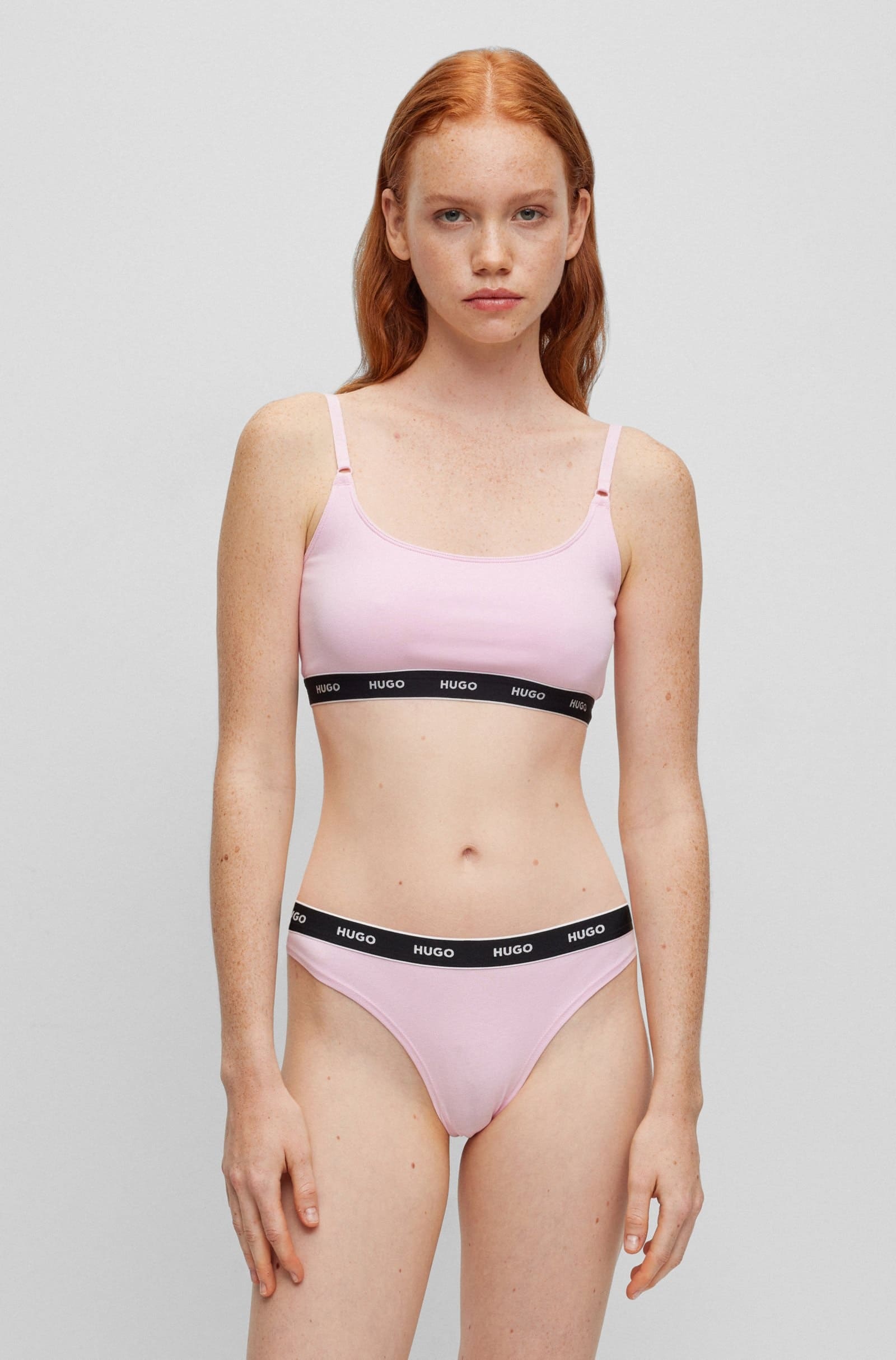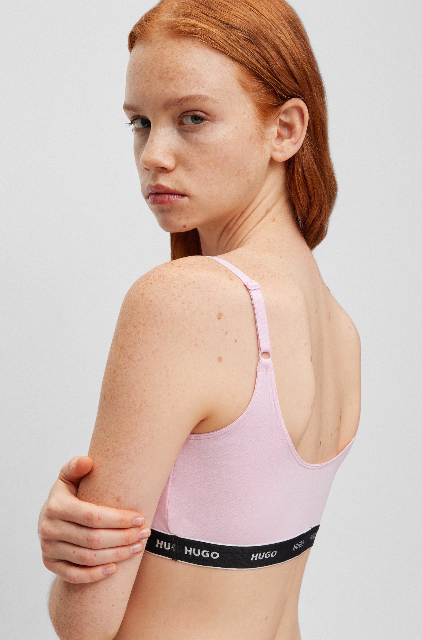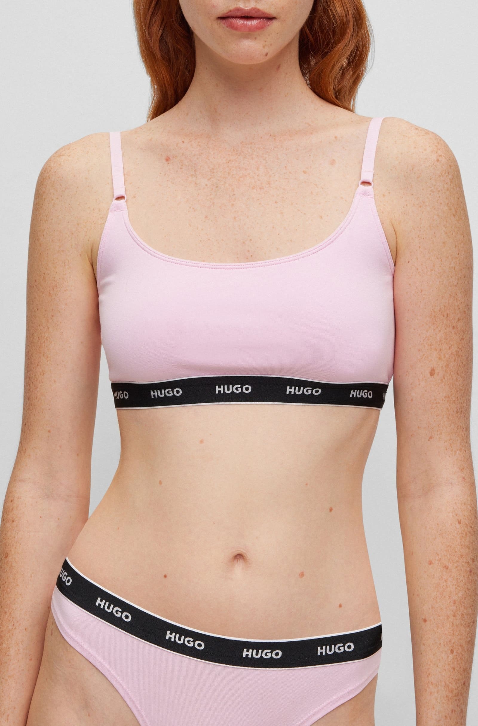 Два бюстгальтери з еластичного джерсі з подвійними передніми шарами та регульованими бретелями. Ці прості моделі з малюнком оздоблені фірмовими ремінцями.