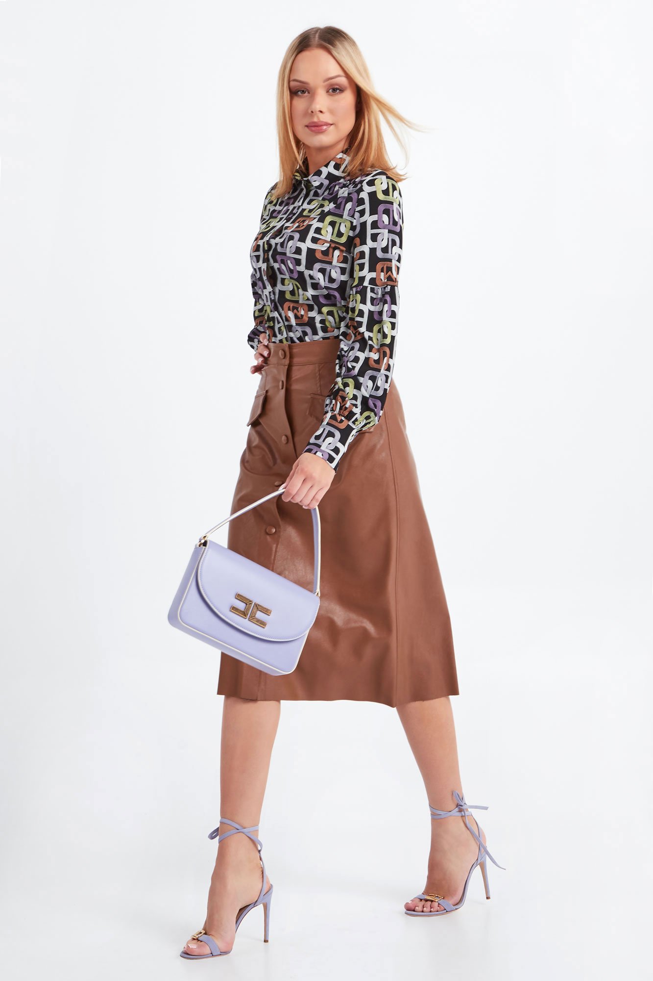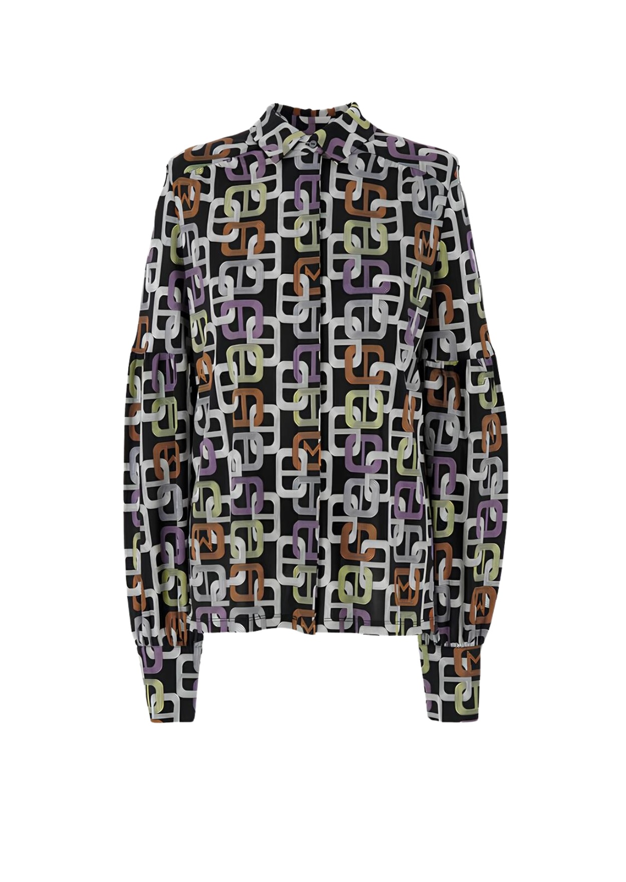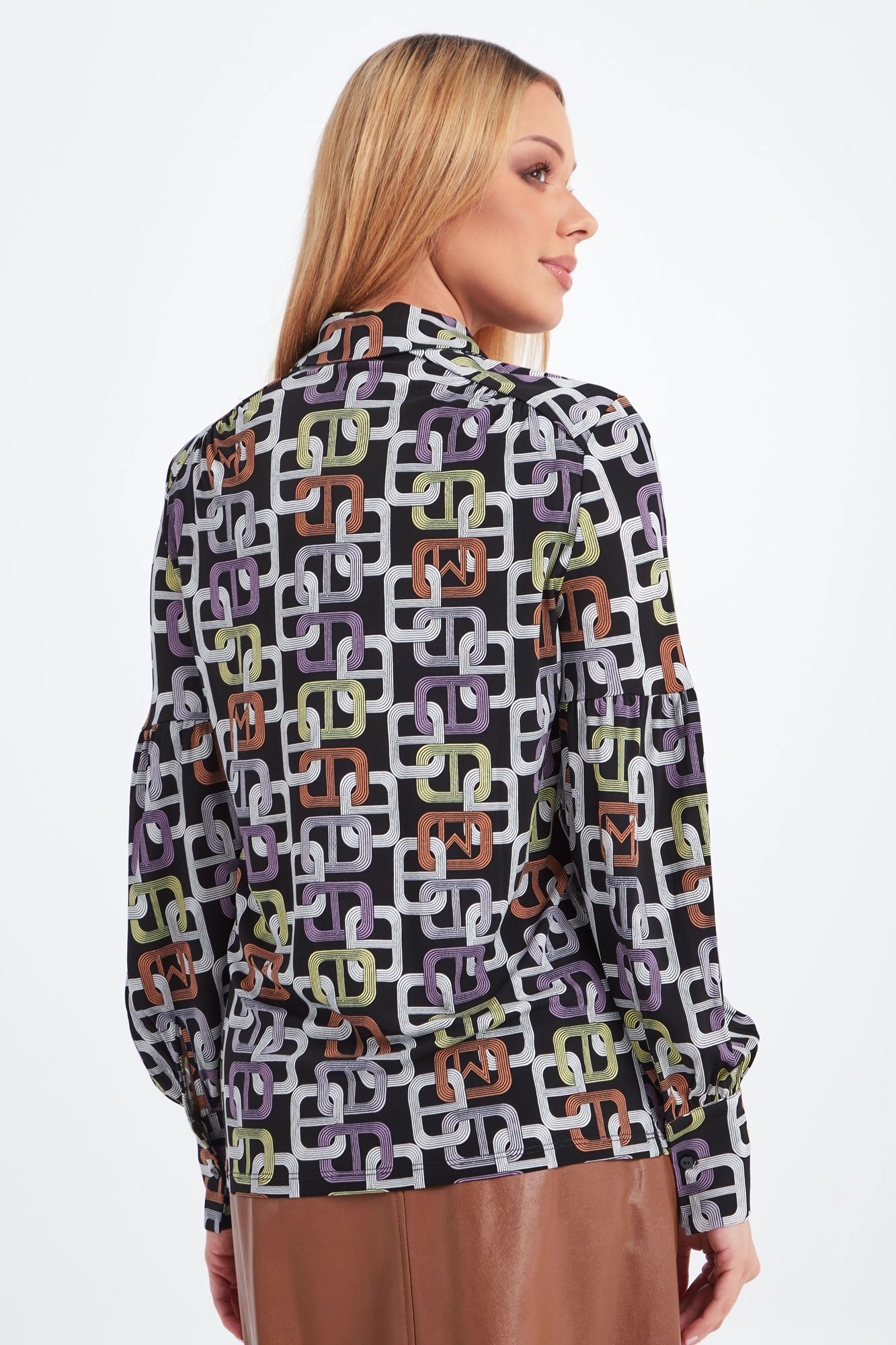 Блуза з довгими рукавами, виготовлена з віскози, з монограмним принтом, вільного крою. Модель із сорочковим коміром лаконічними рукавами-ліхтариками.