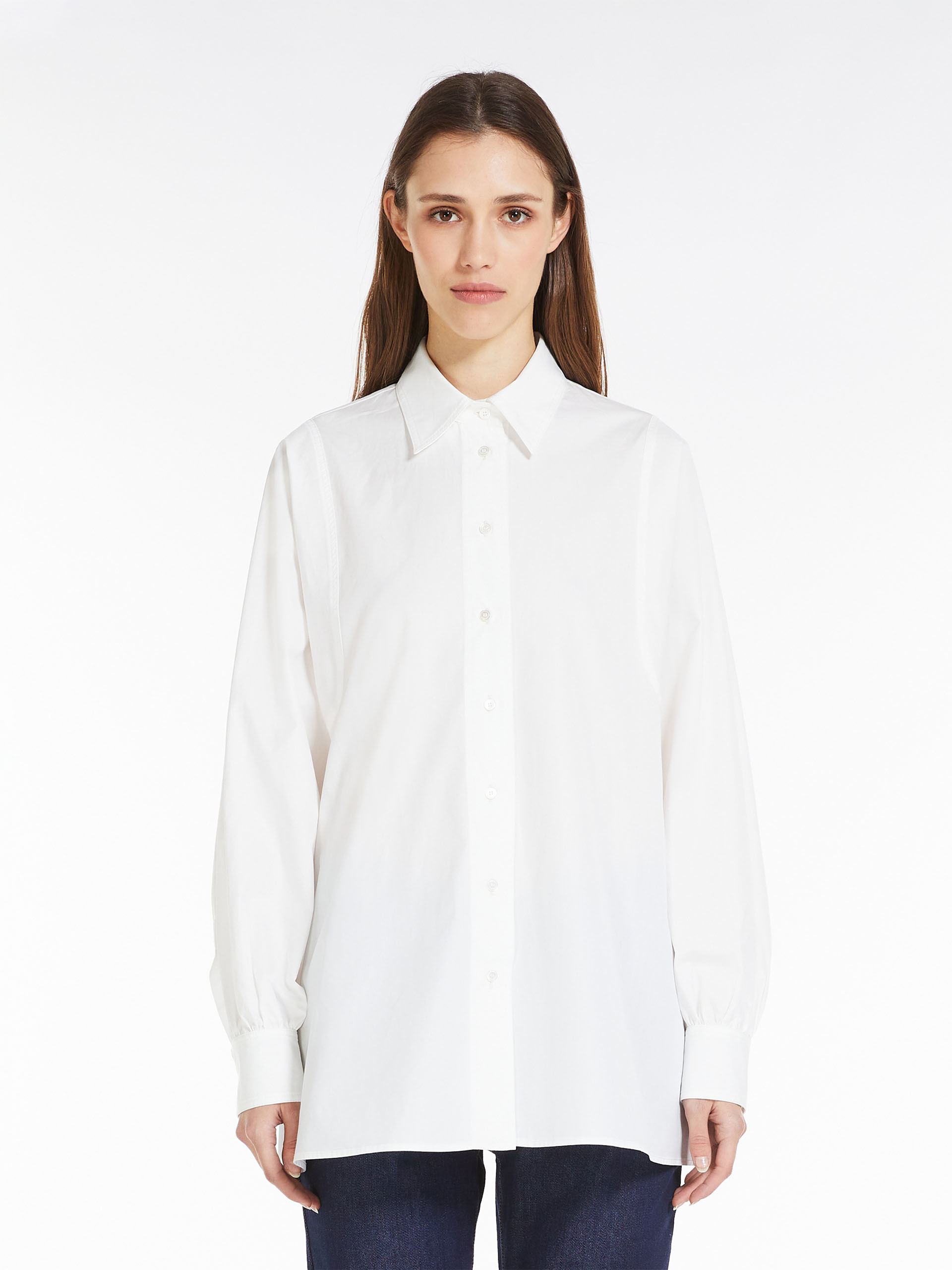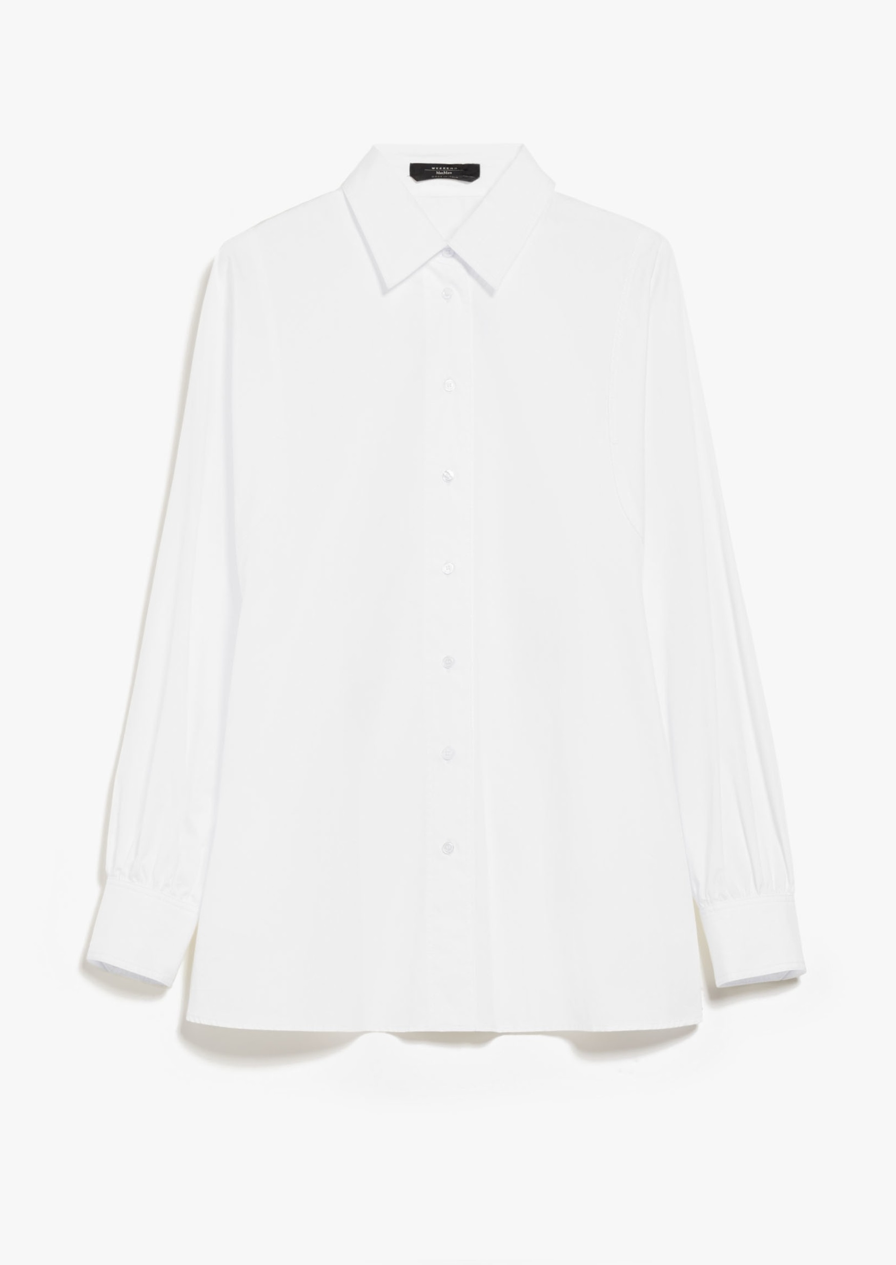 Довга сорочка з м’якої бавовни та класичним дизайном у смужку. Модель доповнена загостреним коміром, довгими рукавами зі злегка присбираними манжетами та помітною застібкою на ґудзику спереду. Зручна модель прямого крою з бічними розрізами.