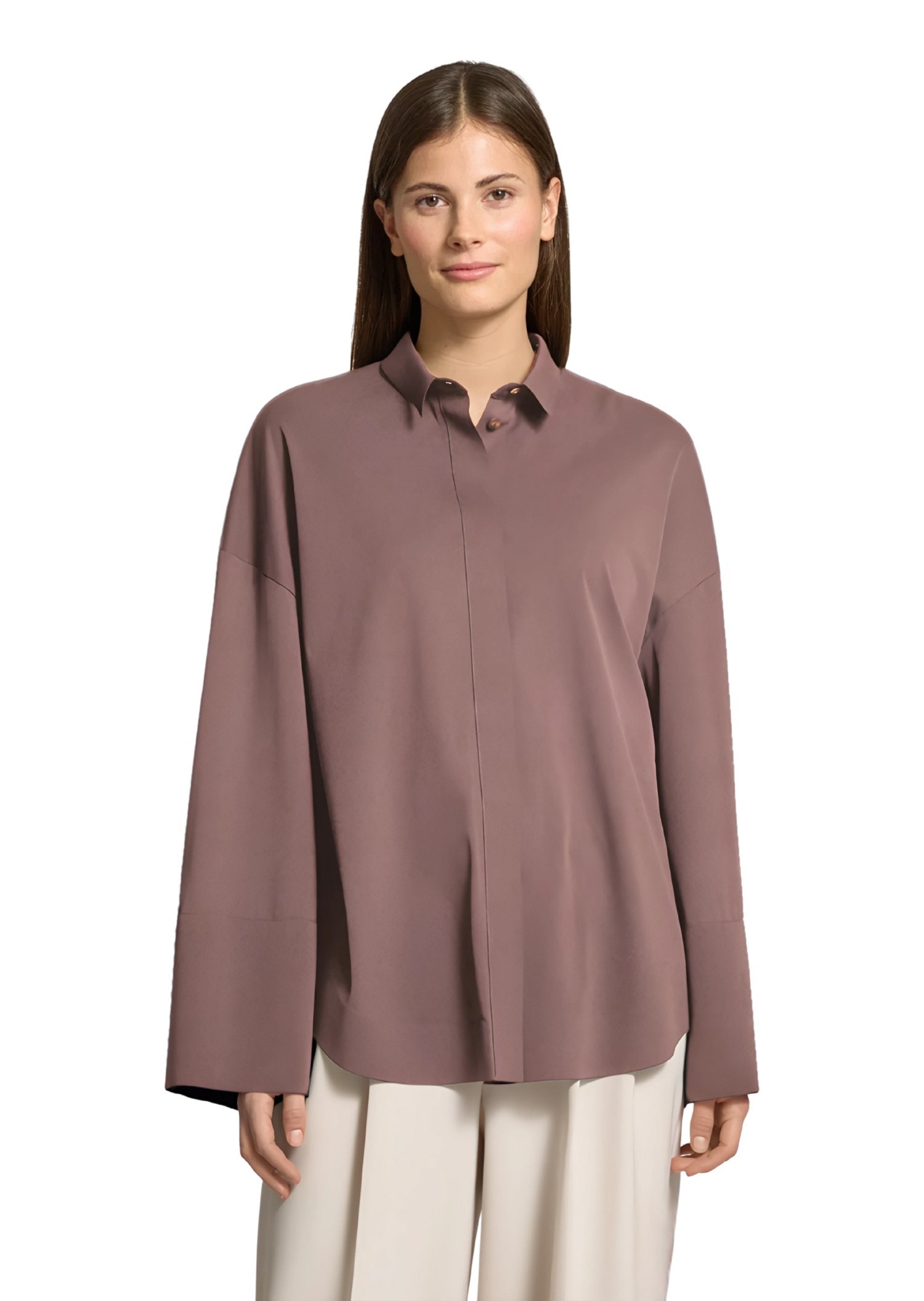 Блуза вільного крою із гострим сорочковим коміром, довгими рукавами та прихованою застібкою на ґудзики. Вишукана модель дозволить створити елегантний образ.