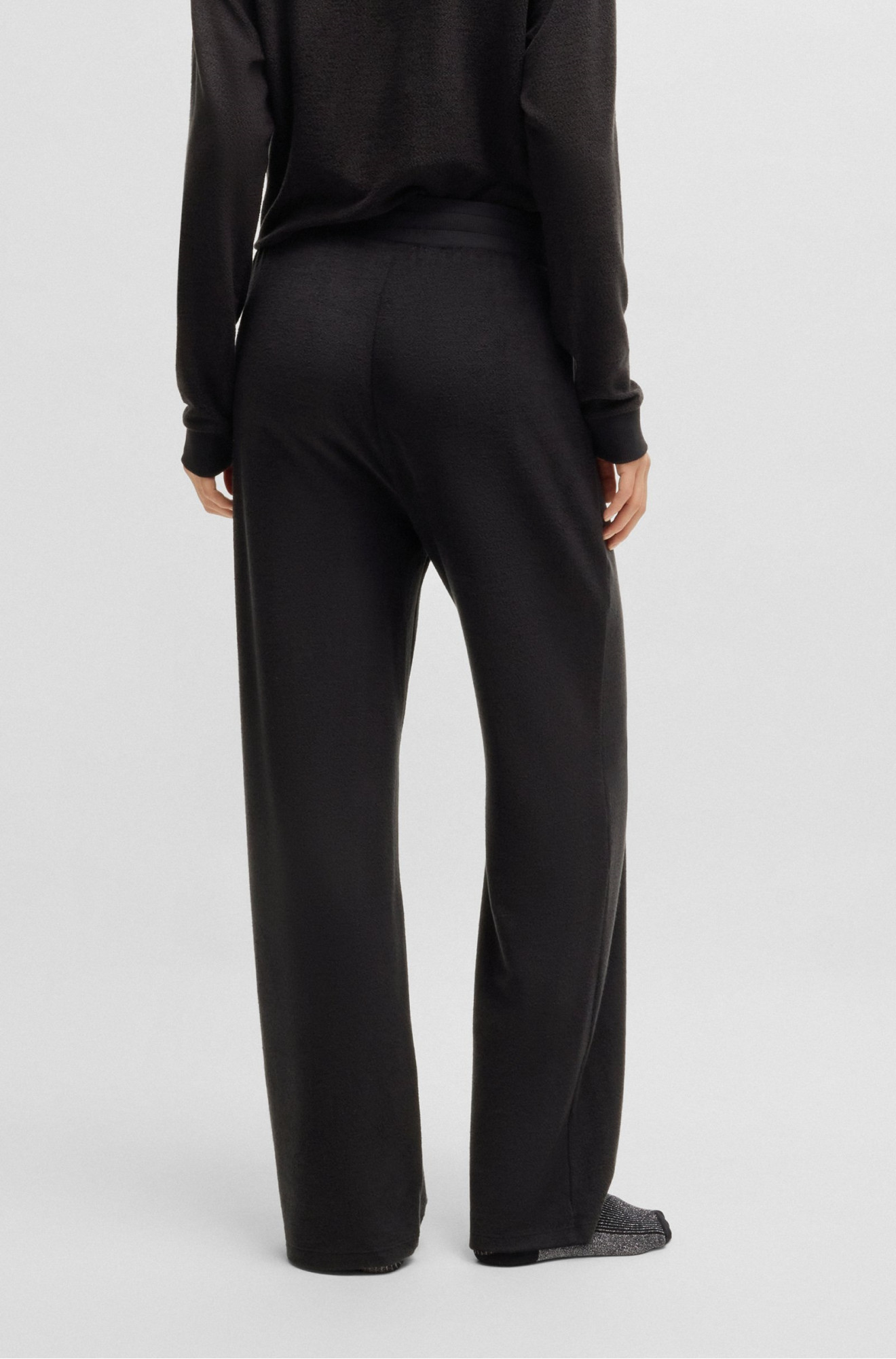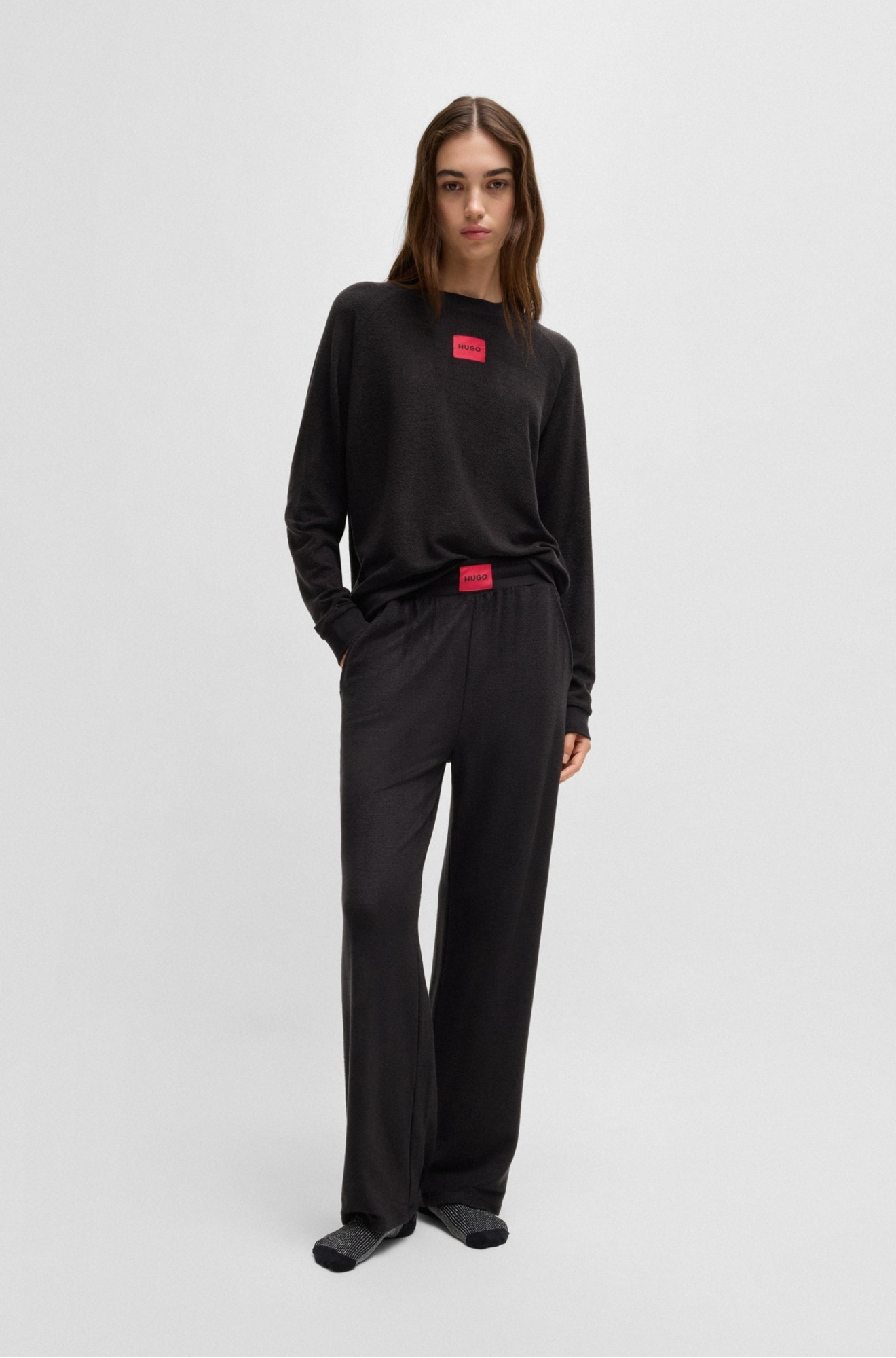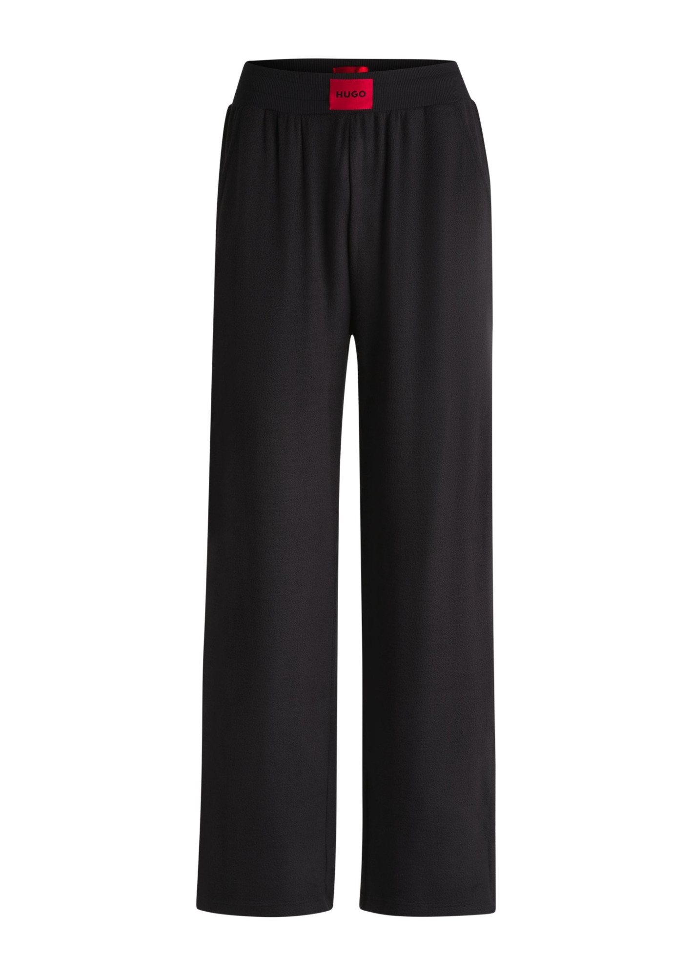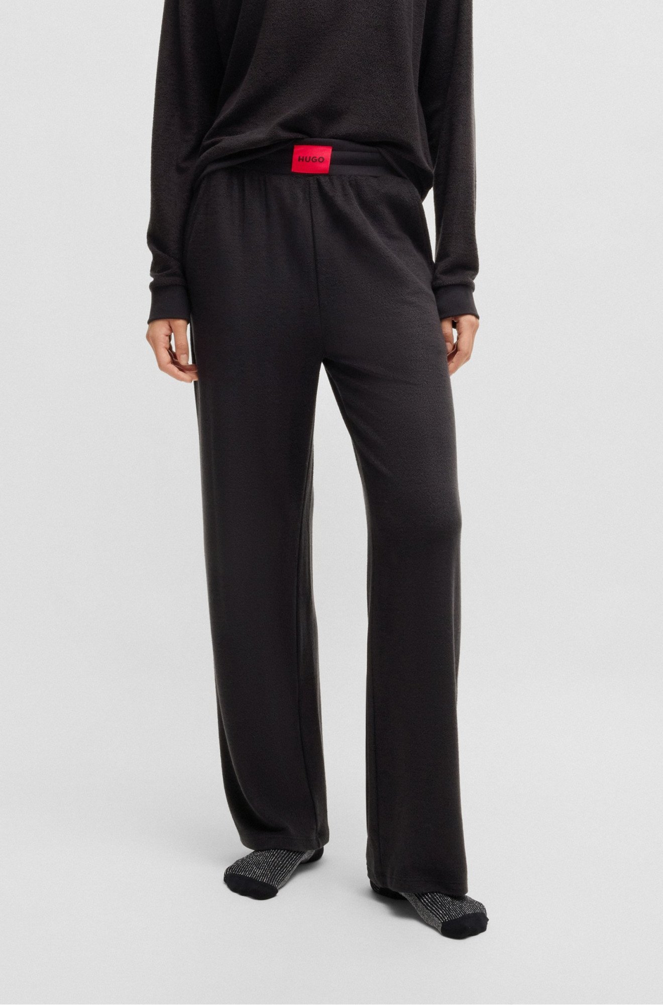Жіночі штани з високою посадкою від HUGO. Однотонна модель у чорному кольорі, прикрашена контрастним логотипом. Зручні штани з вільним кроєм та прорізними кишенями. На талії – резинка. Ідеальний домашній одяг на кожен день.