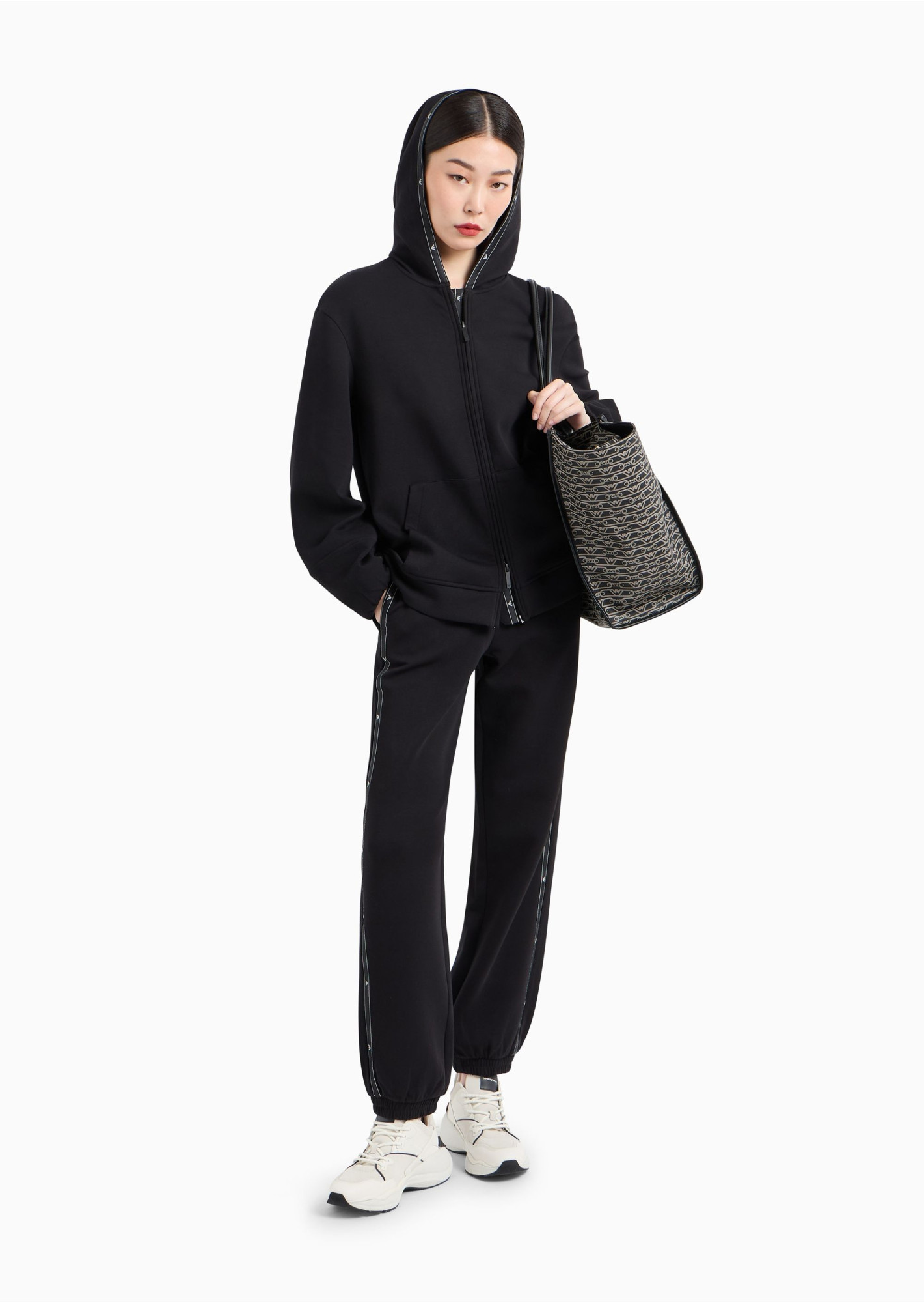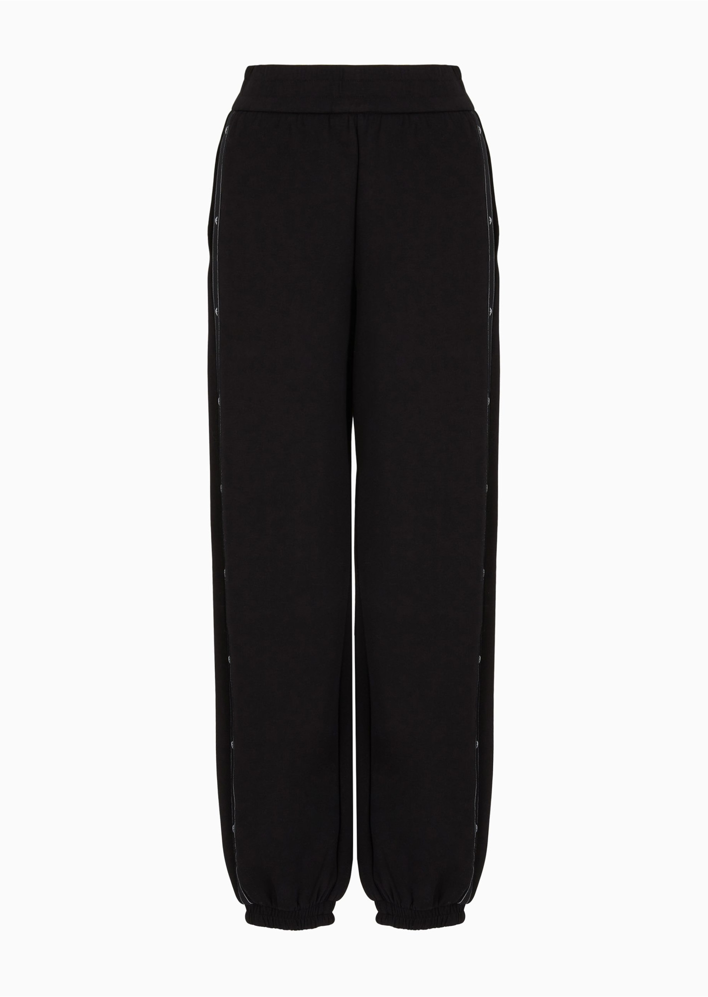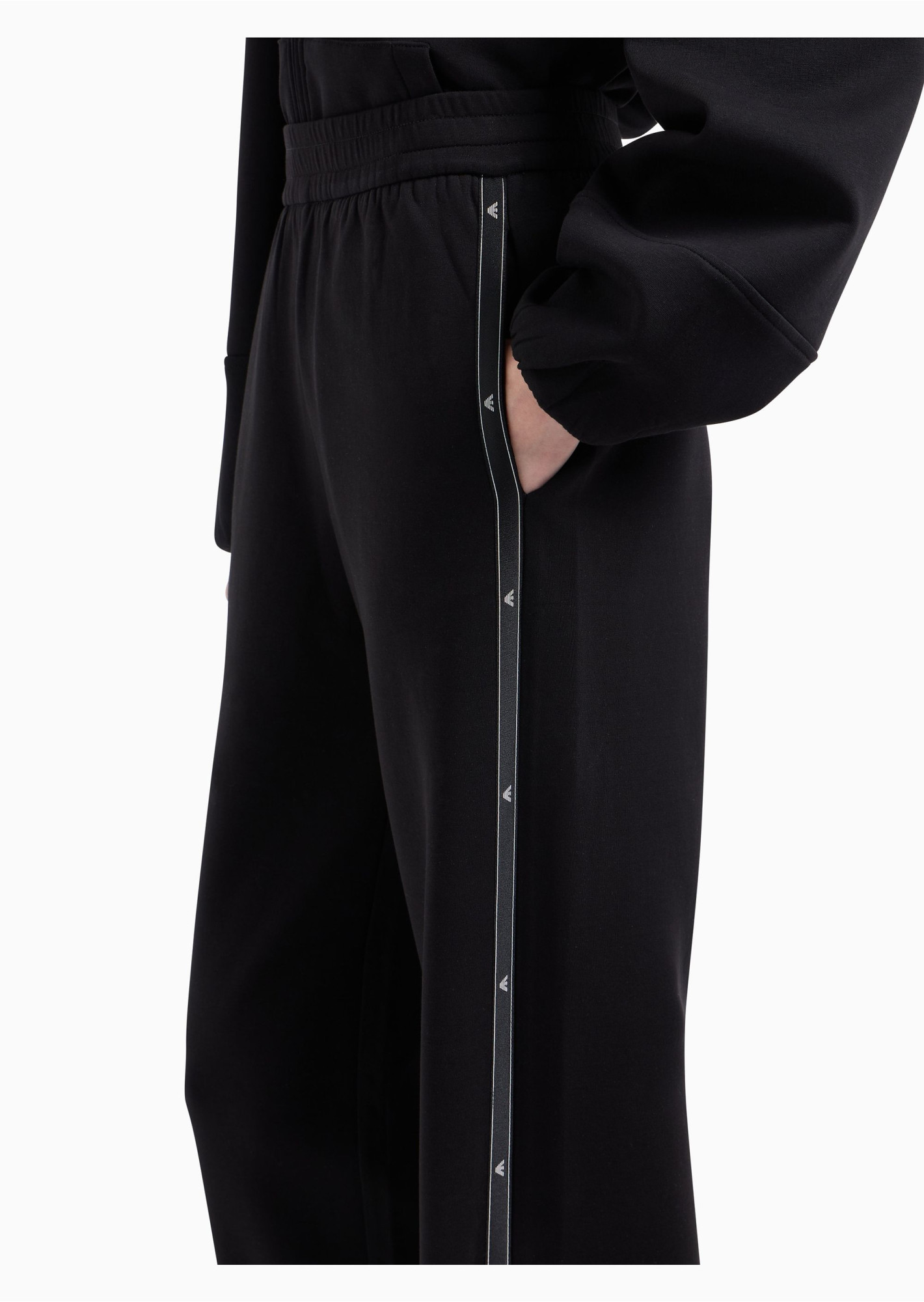 Затишні джогери з бавовни з подвійним джерсі. Виріб доповнений стрічкою з логотипом та мікроорлами, які прикрашають бічну частину штанини. Знаменитий орел, який завжди був відмітним знаком Emporio Armani, підносить виріб, призначений для повсякденного носіння.