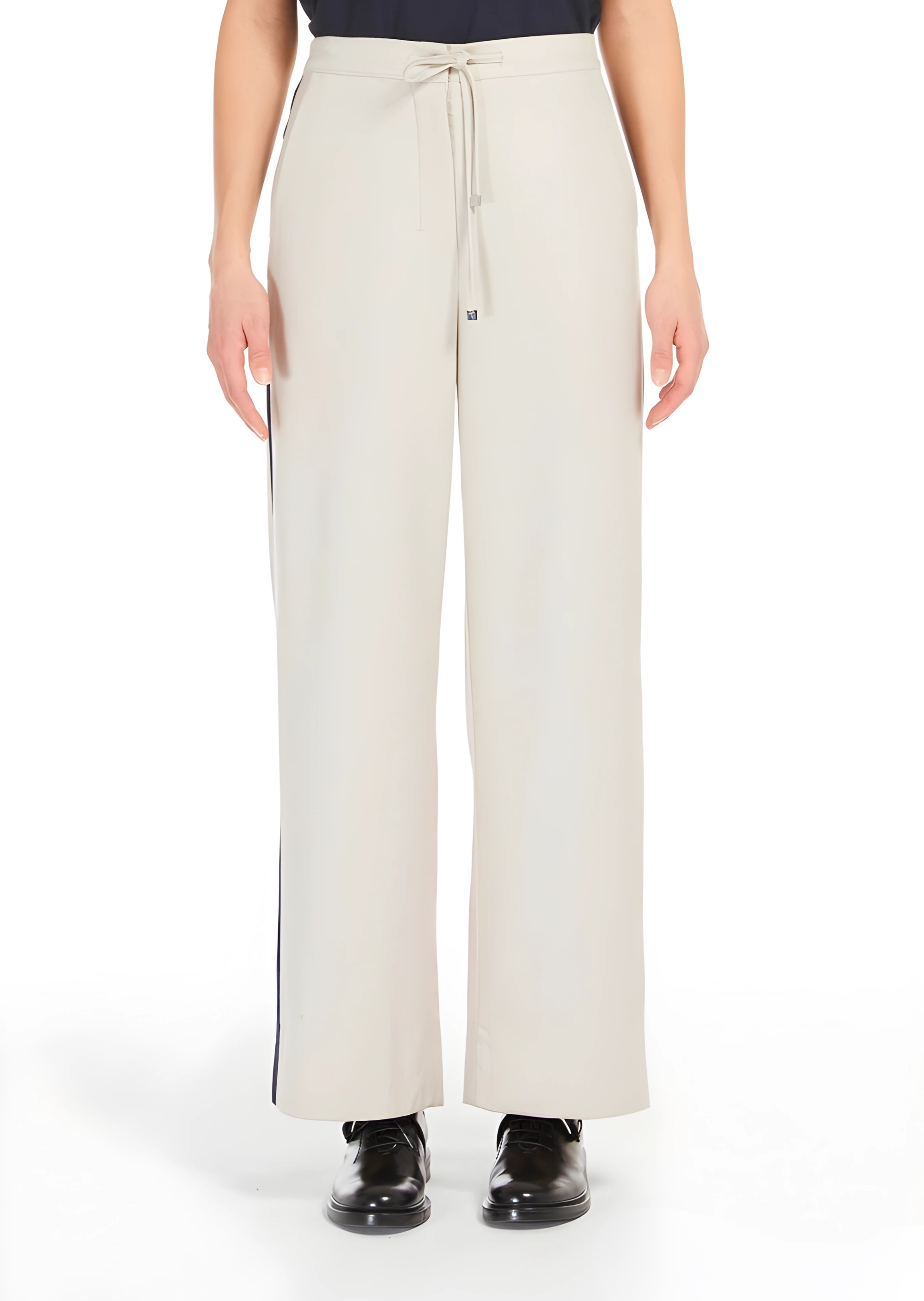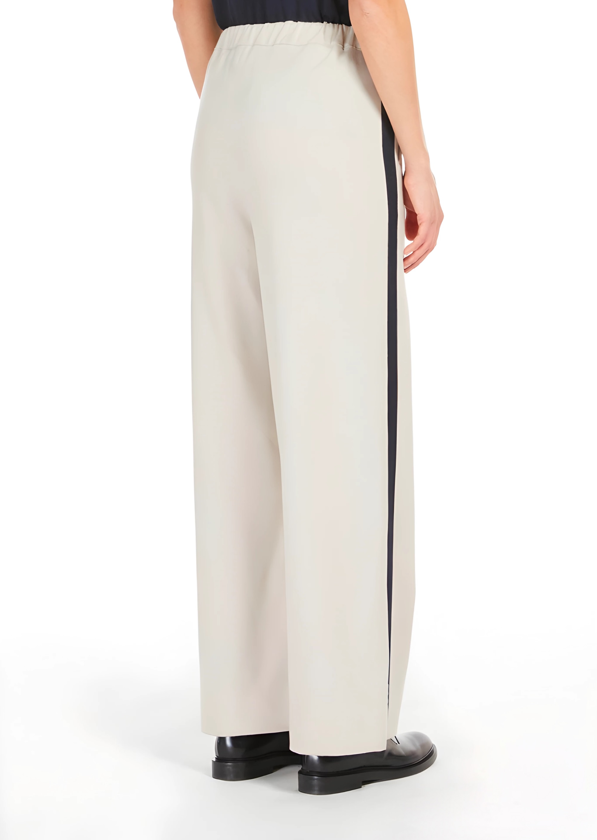 Штани вільного крою з теплої та мякої еластичної вовняної фланелі. Модель має еластичну талію ззаду, кишені з боків і регульовану куліску спереду. Оздоблення контрастними бічними смугами з усіх боків. Потайна блискавка та застібка на гачок.