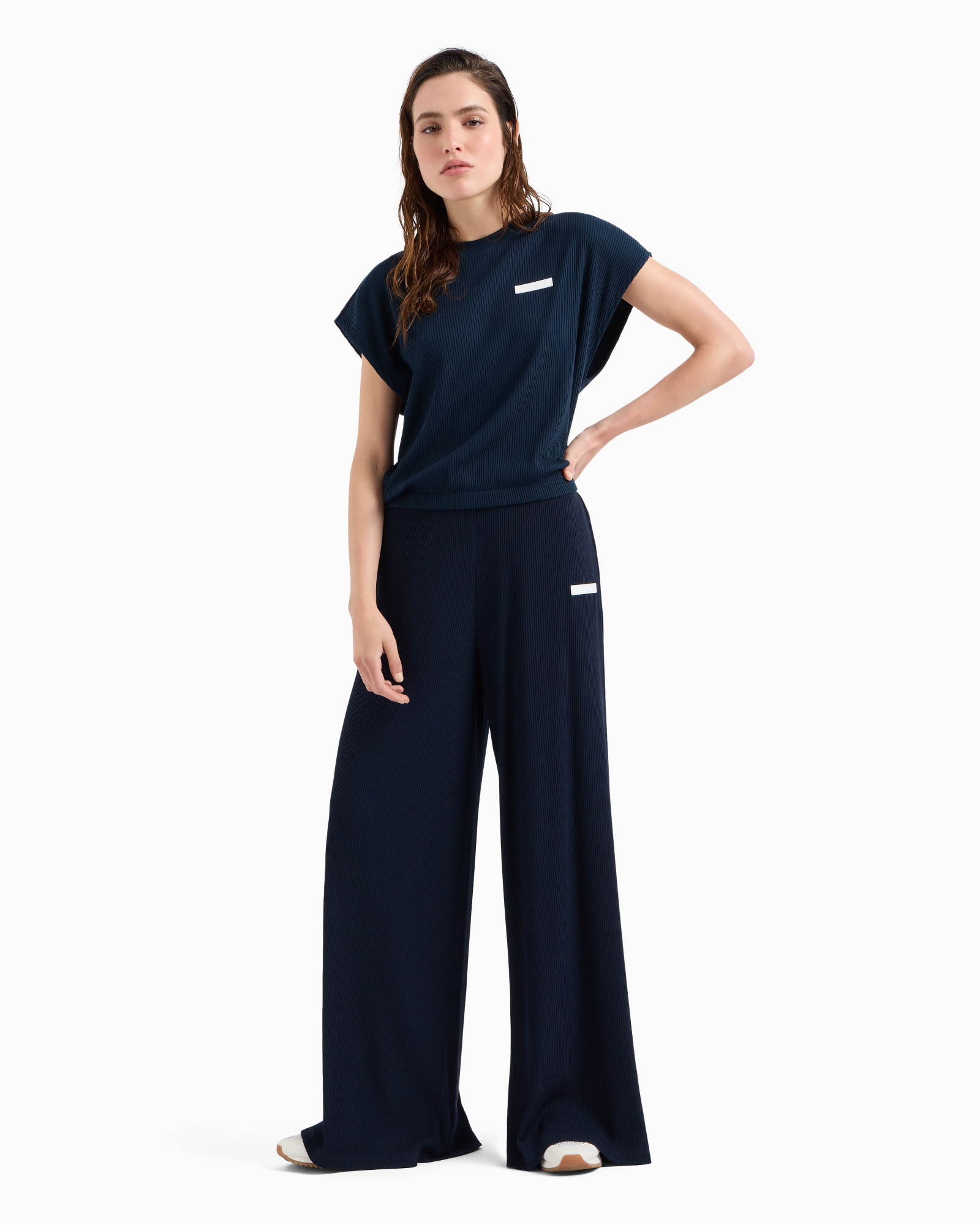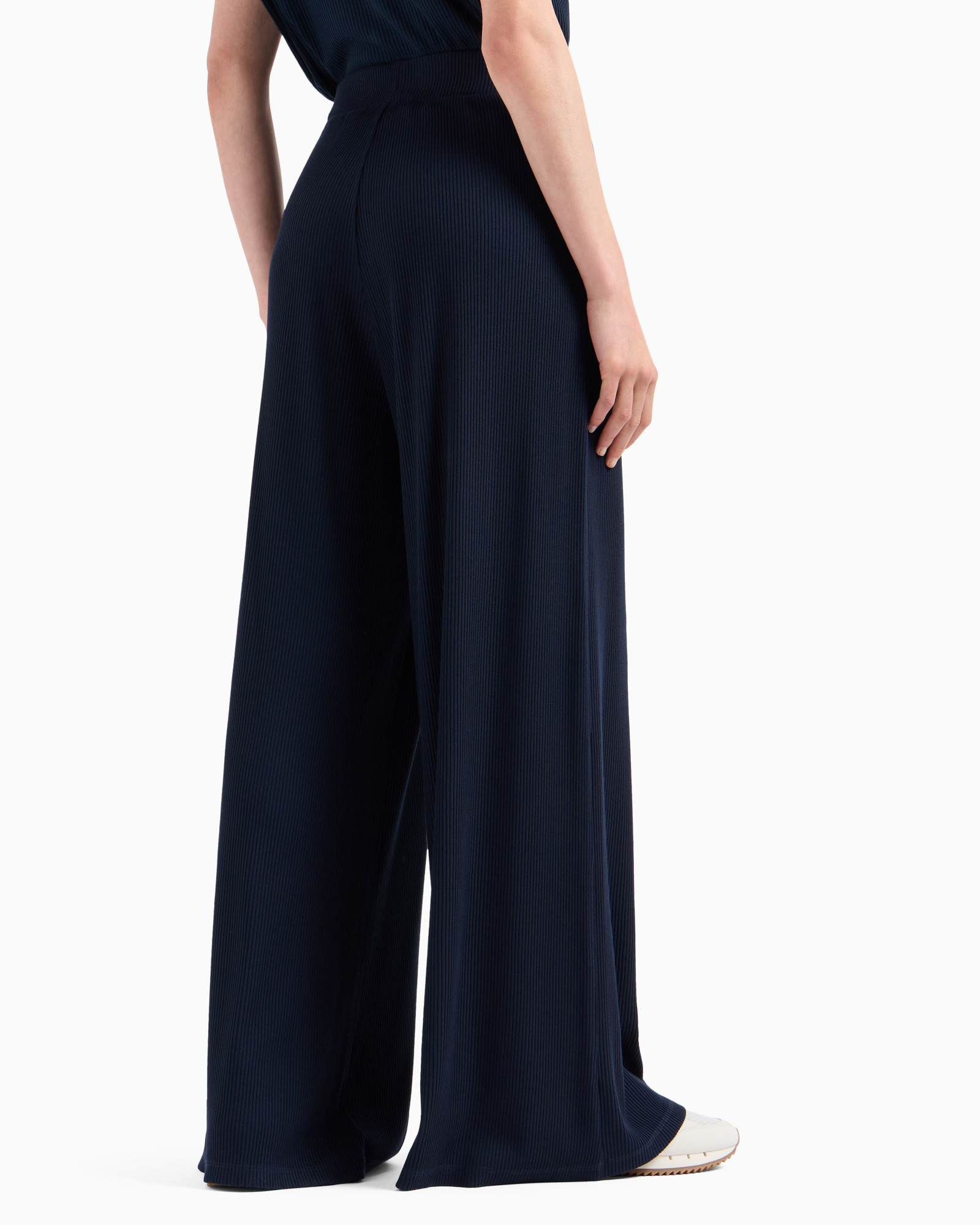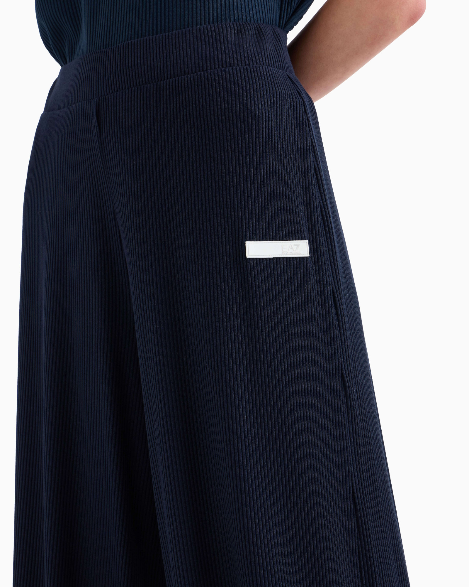Жіночі спортивні штани-палаццо з колекції Emporio Armani EA7. Ультрасучасна модель з широкими штанинами та еластичним поясом, виготовлена з високоякісної суміші матеріалів. Брюки для жінок, які під час спорту і відпочинку цінують стиль і комфорт.