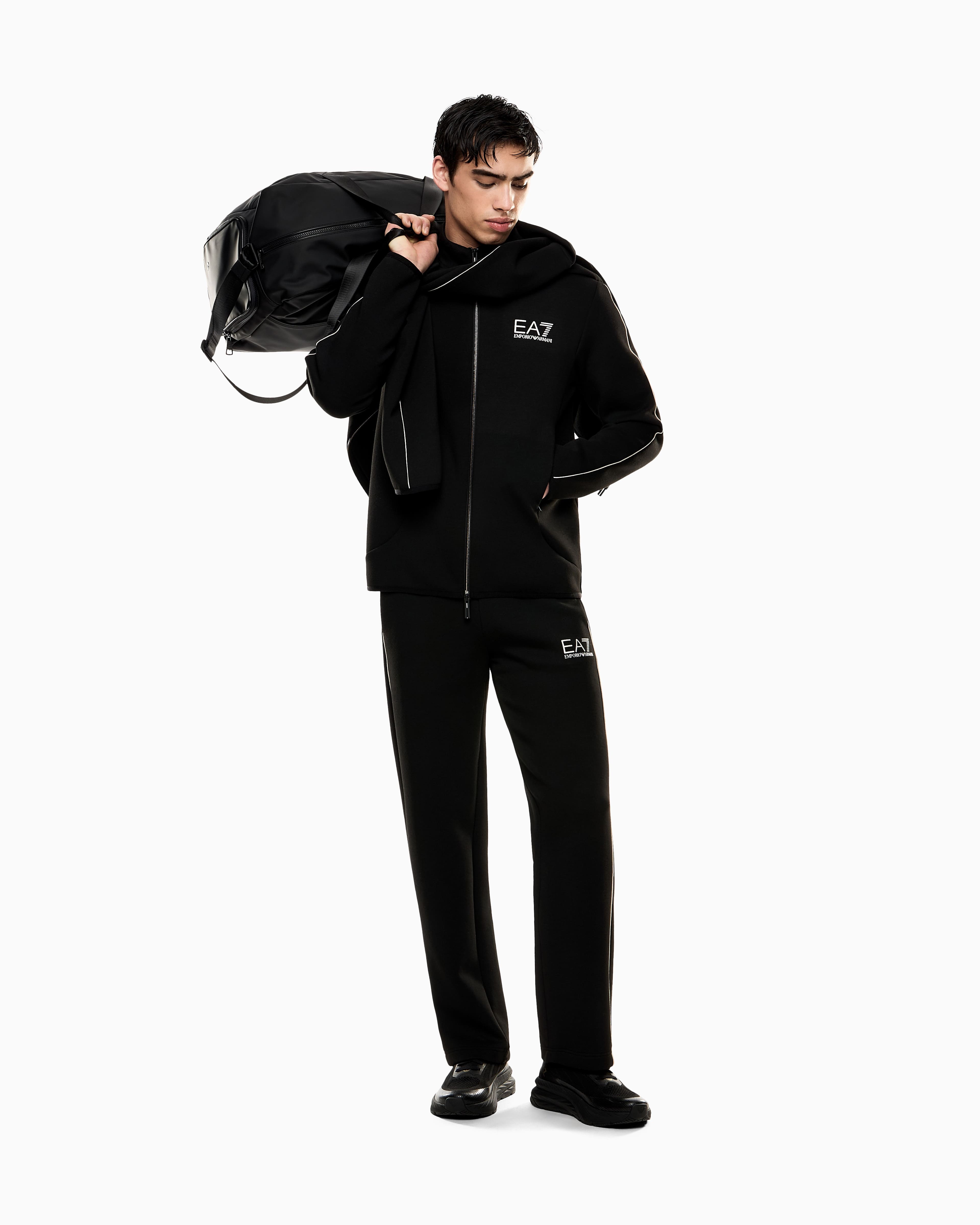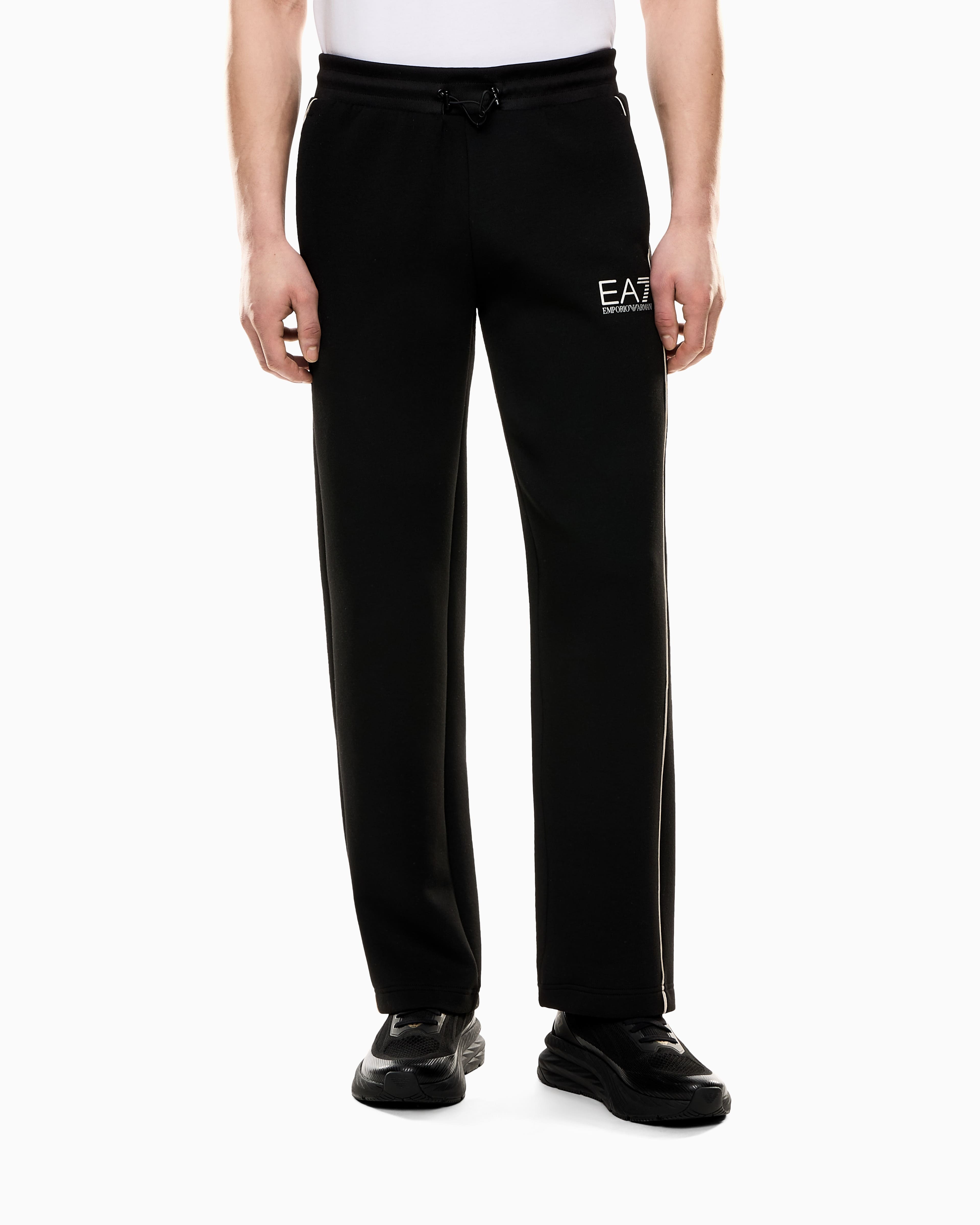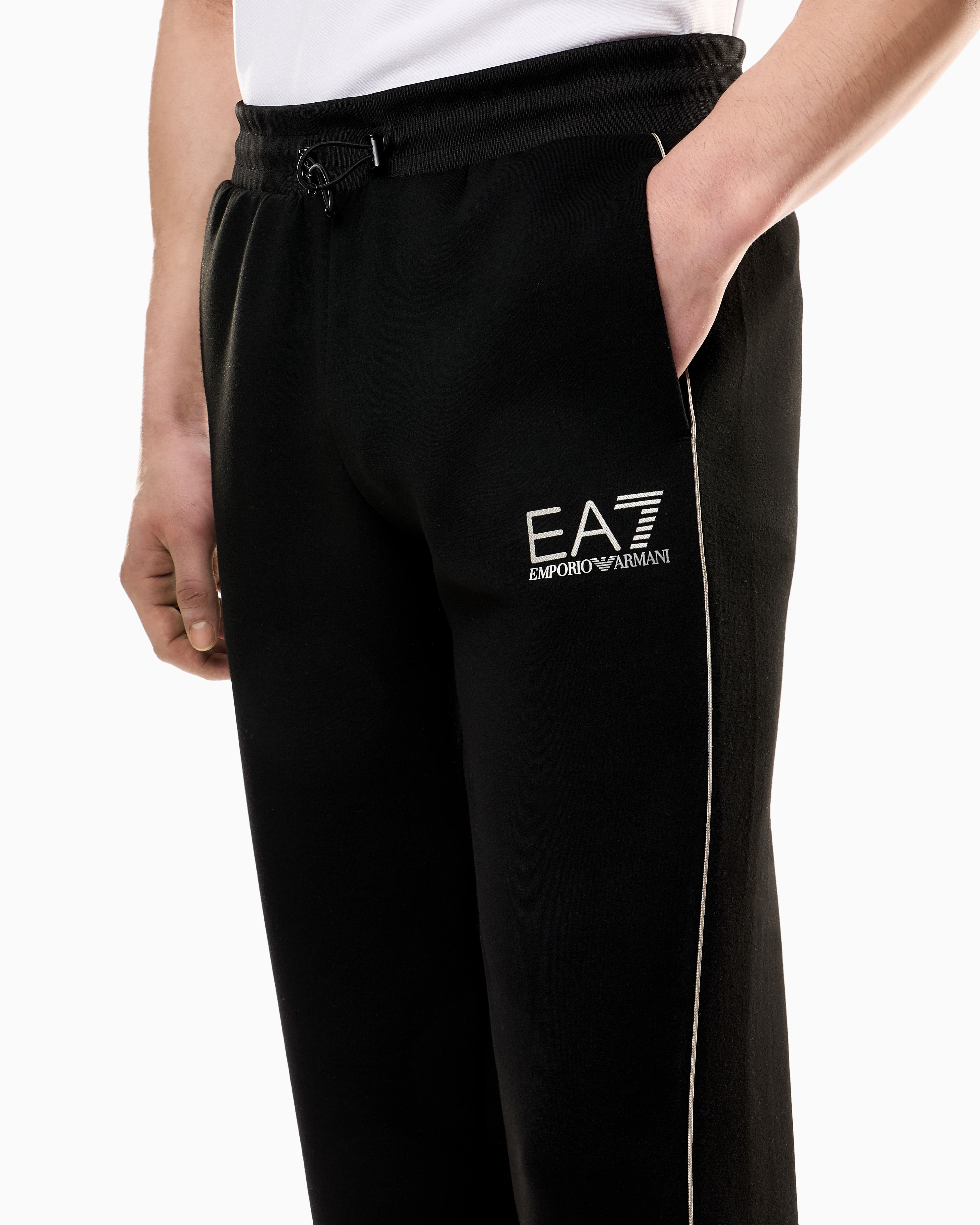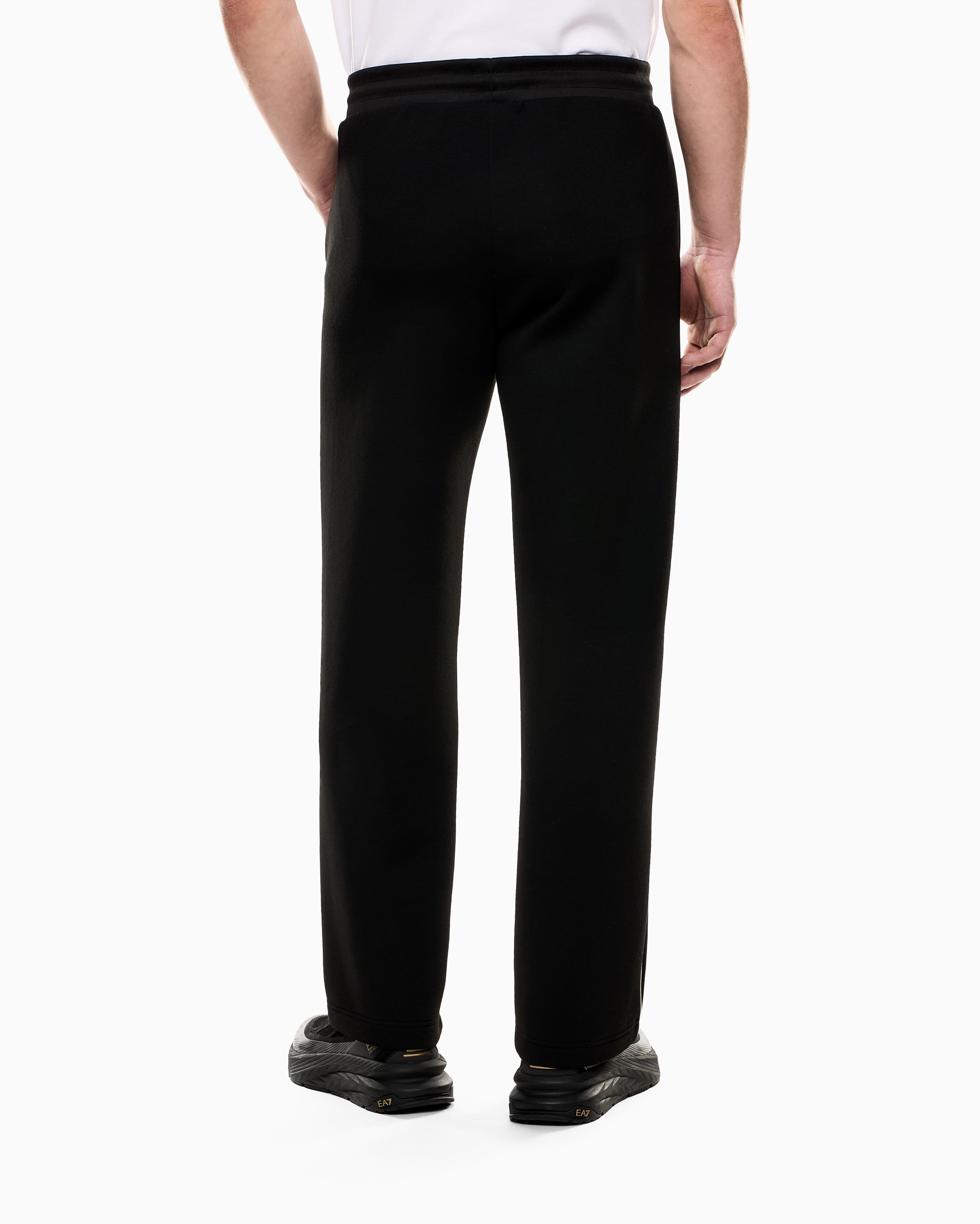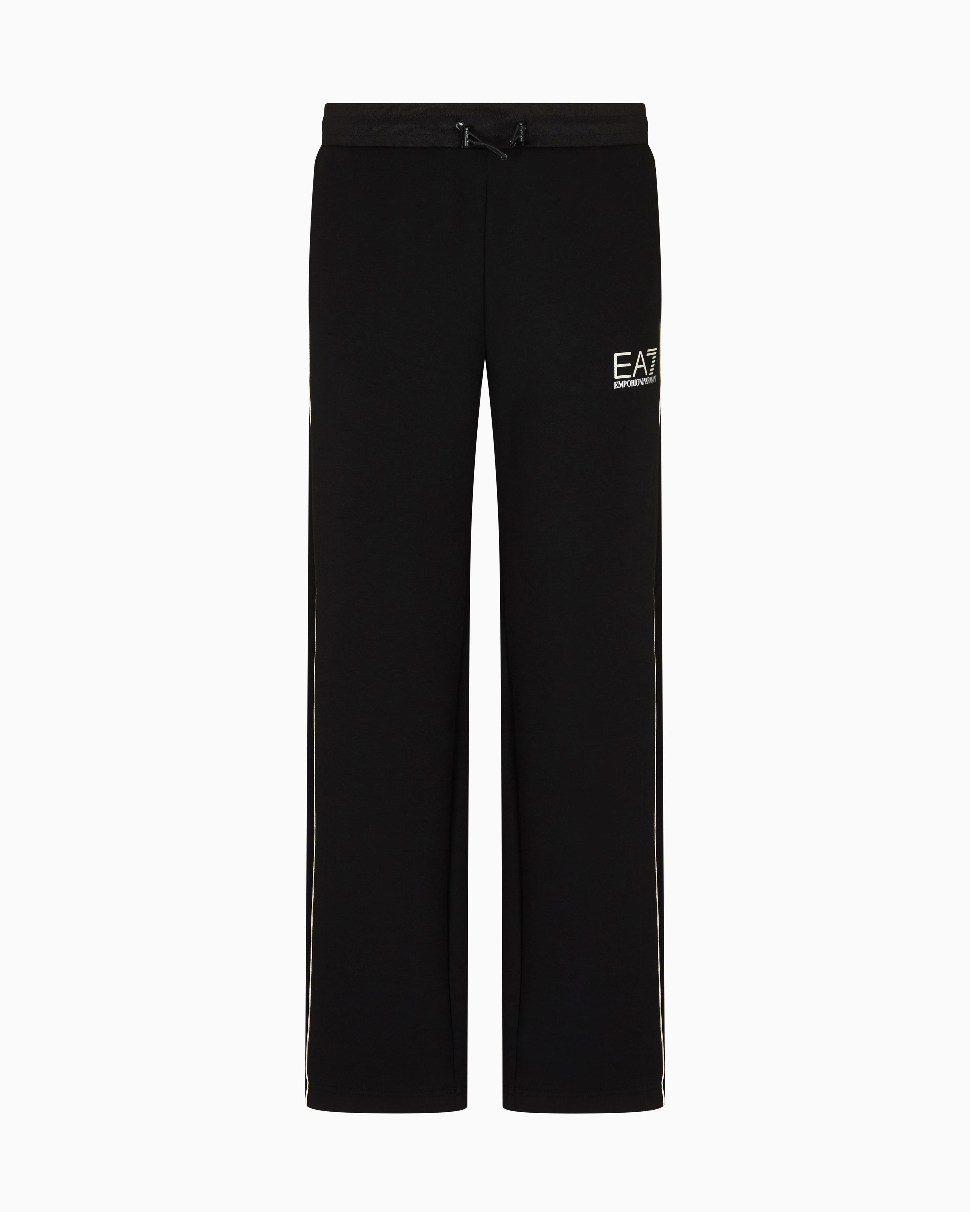 Штани EA7 Emporio Armani із суміші віскози з еластаном вирізняються лаконічним силуетом і комфортною посадкою. Вузький крій підкреслює сучасну лінію, еластичний пояс на кулісці забезпечує зручність, а бічні кишені додають функціональності. Контрастна обробка надає динаміки, а фірмова нашивка із золотистим логотипом на чорному тлі акцентує належність до лінії Gold Label. Поєднуються з худі, футболками чи легкими куртками, формуючи елегантний і спортивний образ у преміальному ключі.