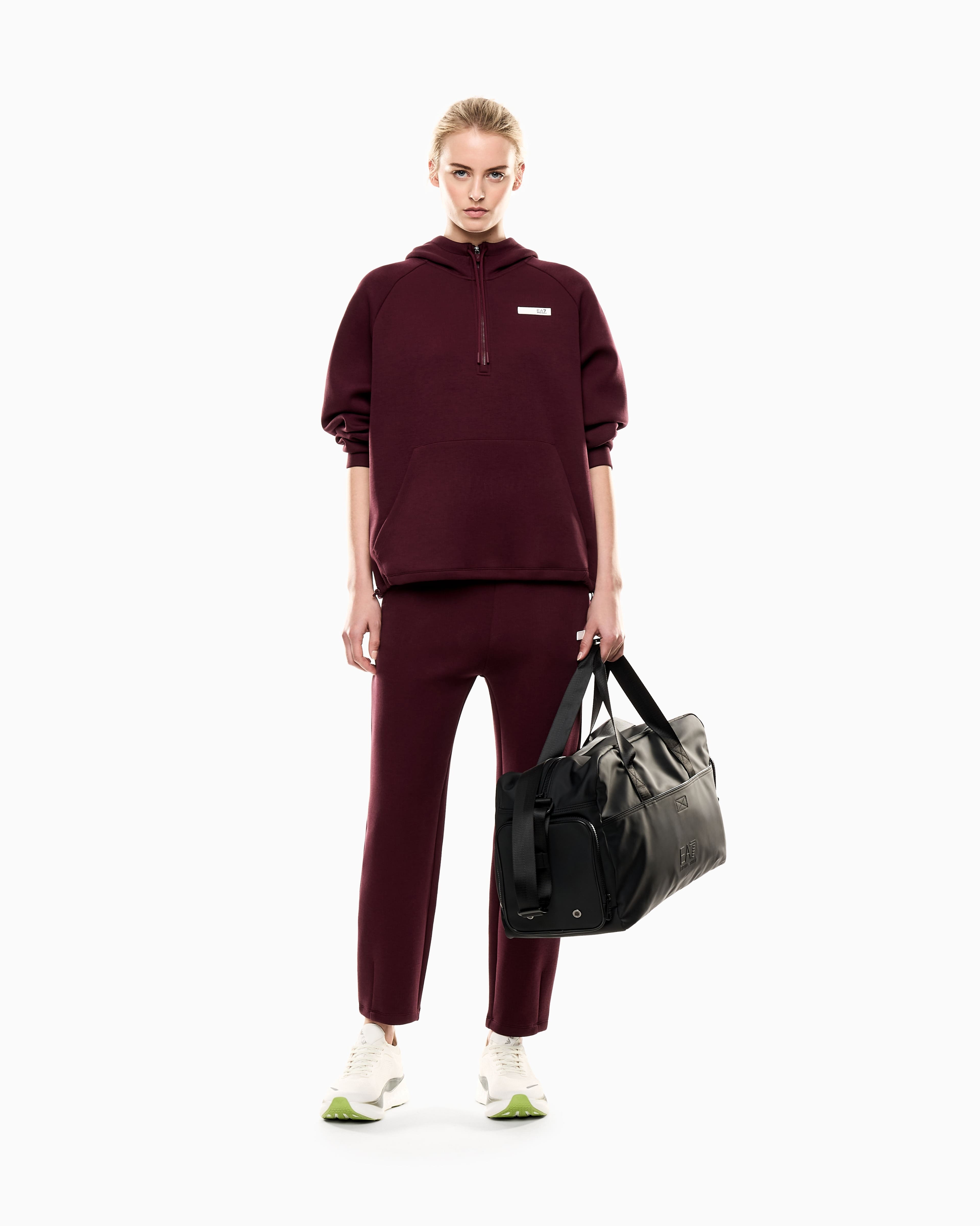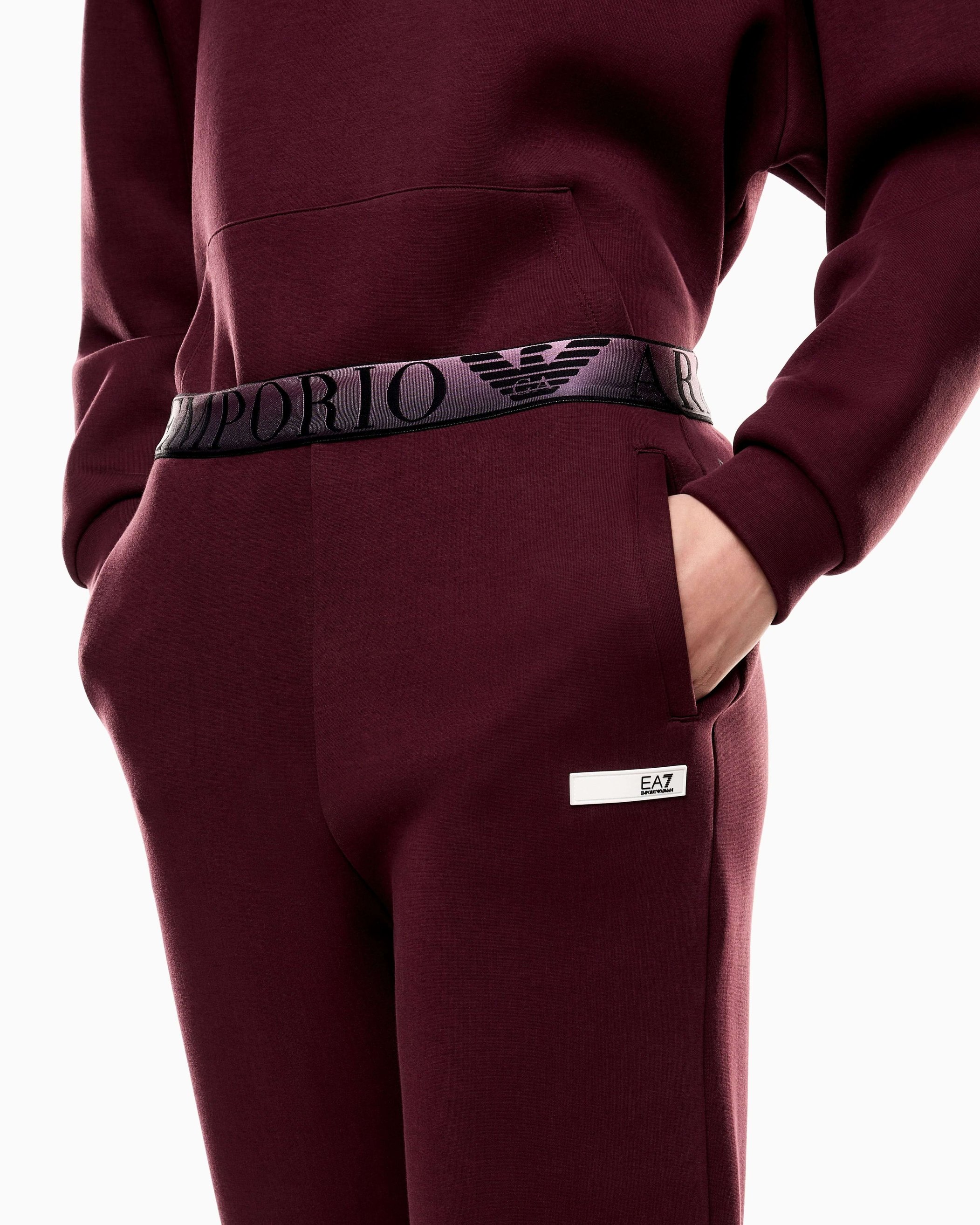 Штани EA7 Emporio Armani з лаконічними лініями виконані з інноваційного матеріалу Natural VENTUS7, що поєднує натуральні та синтетичні волокна. Тканина регулює температуру тіла та виводить вологу у вигляді пари, а бавовняні волокна забезпечують м’якість і комфорт. Еластичний пояс зі стрічкою-логотипом підкреслює спортивний характер, бічні кишені додають практичності, гумовий логотип завершує фірмовий акцент. Поєднуються з футболками, топами чи худі, формуючи жіночний і динамічний образ для спорту та повсякденного відпочинку.