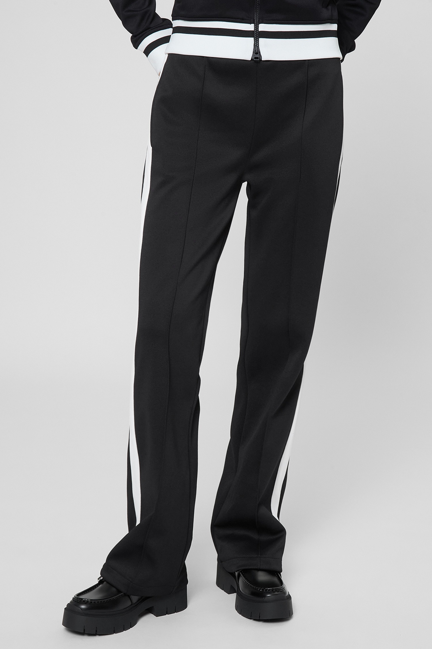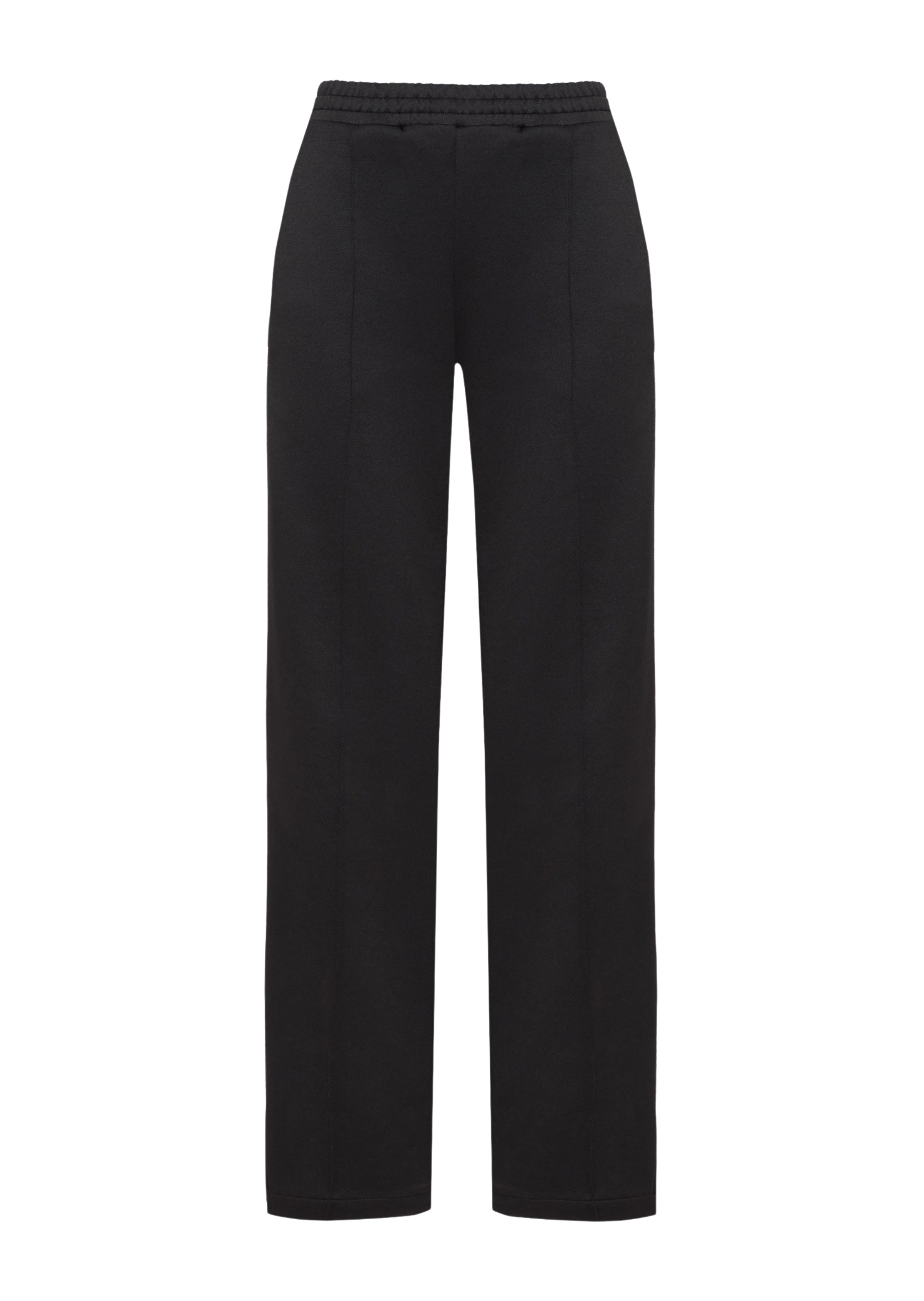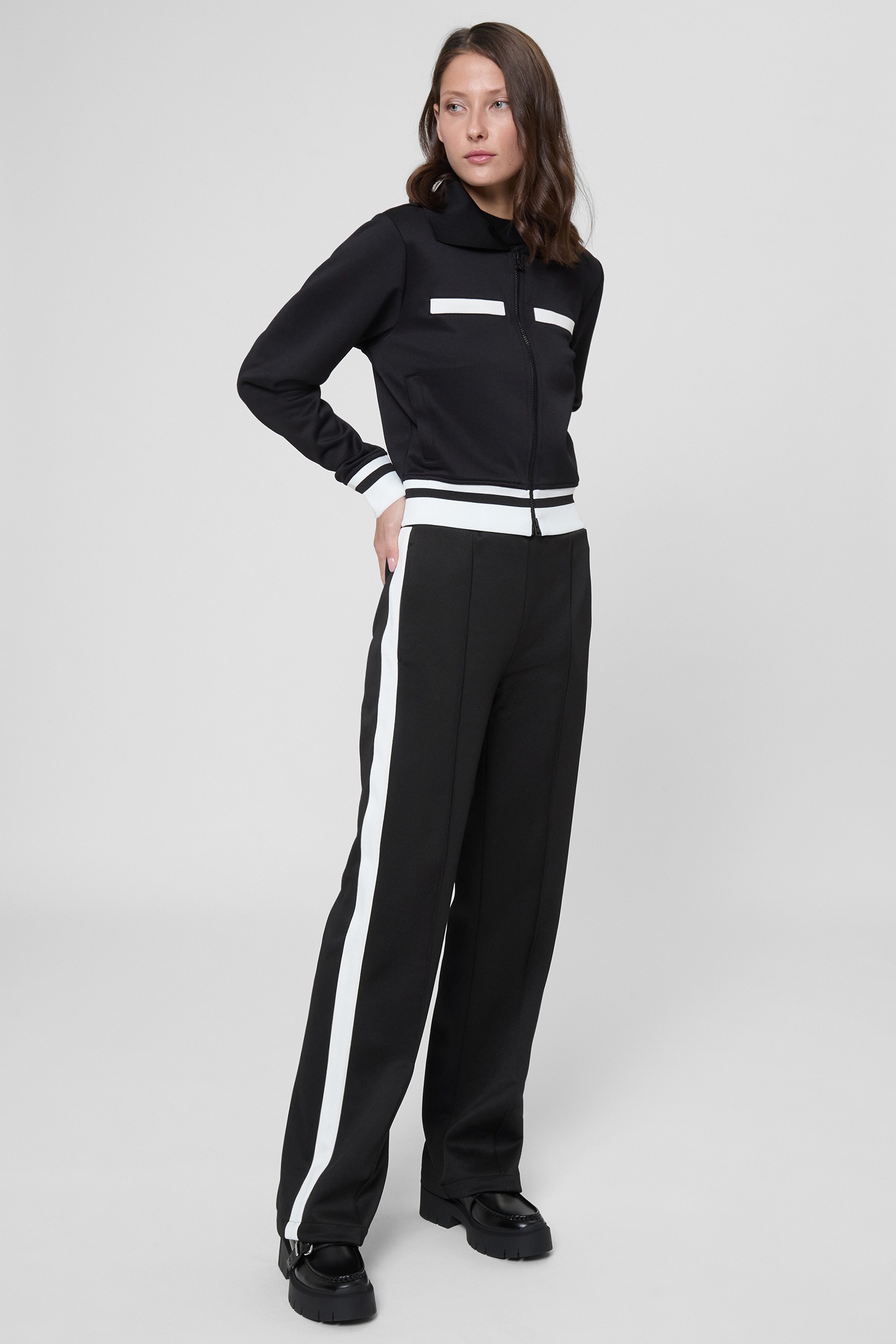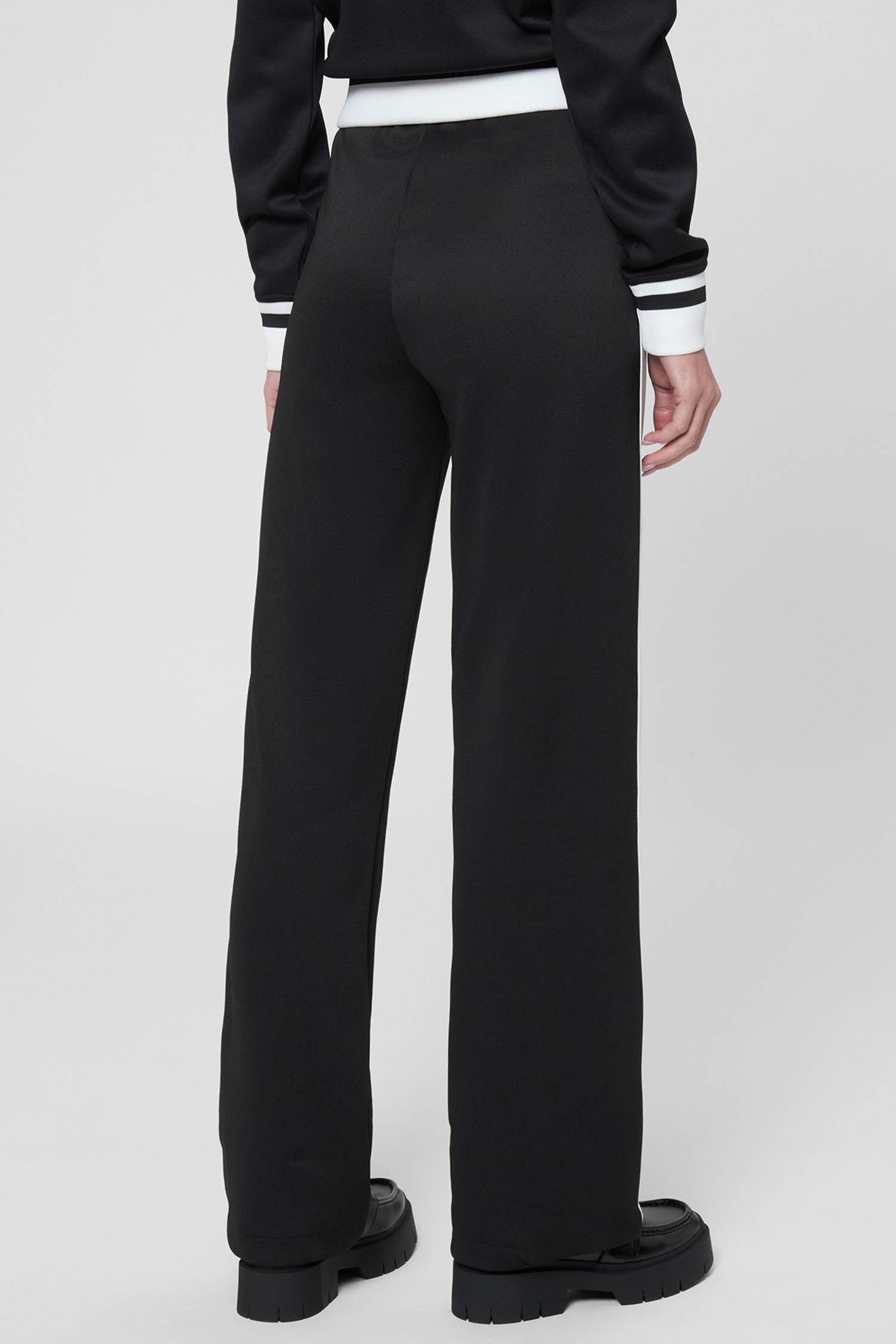 Штани HUGO чорного кольору виготовлені з м’якого трикотажу зі складом із поліестеру, бавовни та легкого еластану, даруючи відчуття комфорту та свободи рухів. Висока талія з внутрішнім шнурком забезпечує ідеальну посадку й комфорт при активному носінні. Бічні кишені поєднують місце для essentials і лаконічну лінію силуету. Лампаси додають стильного акценту, формуючи сучасний графічний образ. Штани HUGO стають продуманою базою міського гардероба, де комфорт зустрічається з виразною естетикою.