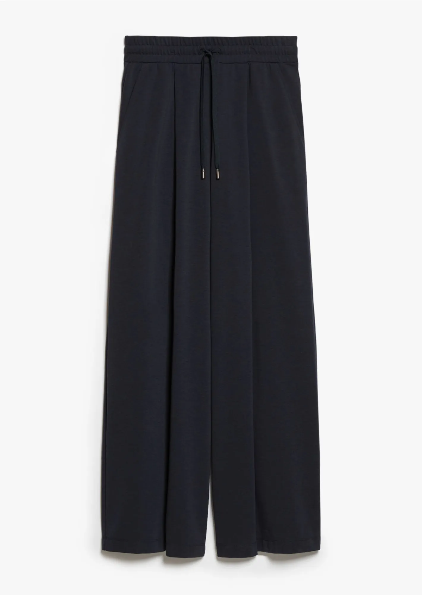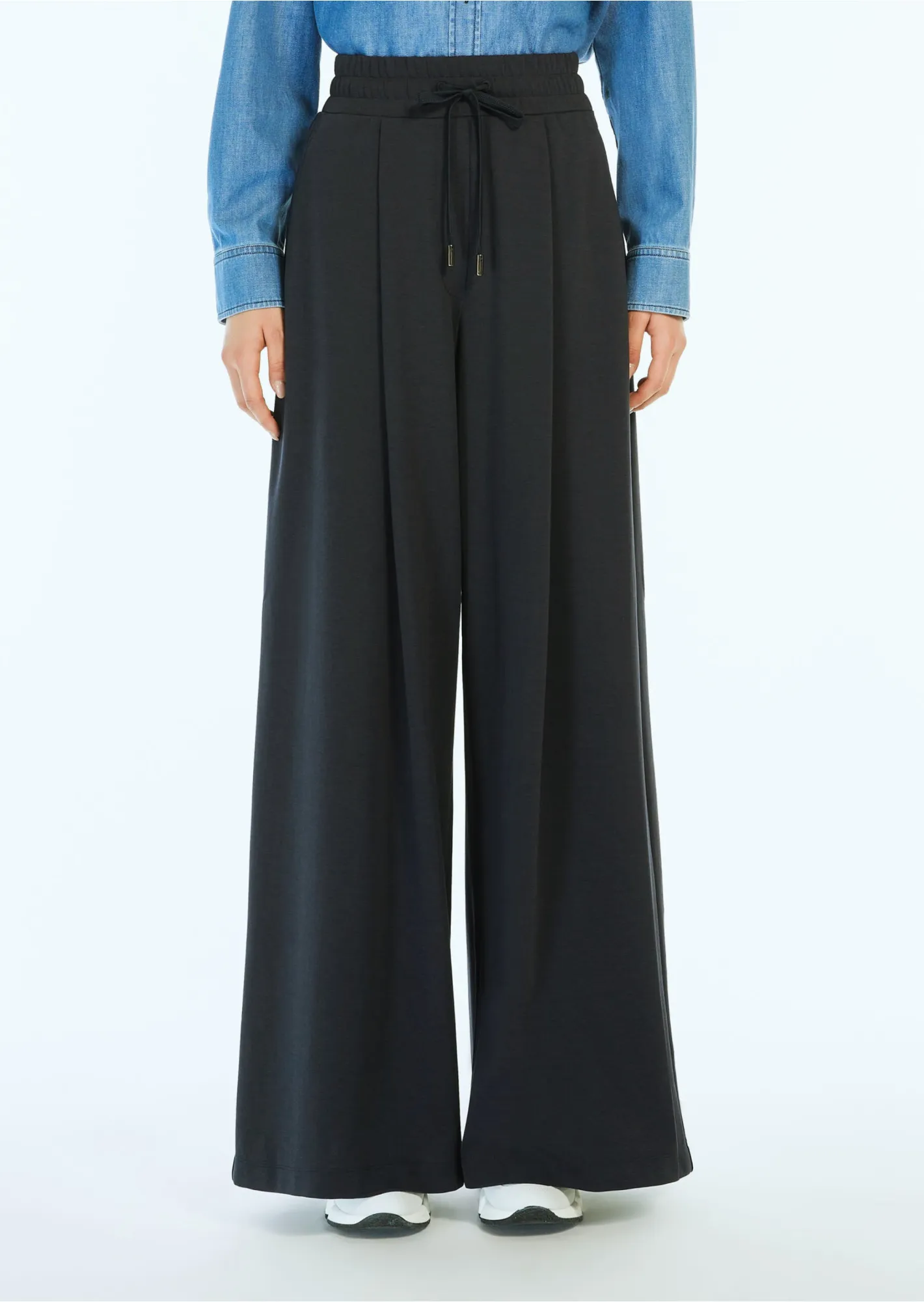 Штани, виповнені з мякого бавовняного джерсі-ліоцелу, з широкими штанинами та глибокими складками спереду. Еластичний пояс, регульований шнурком, та бічні кишені у швах.