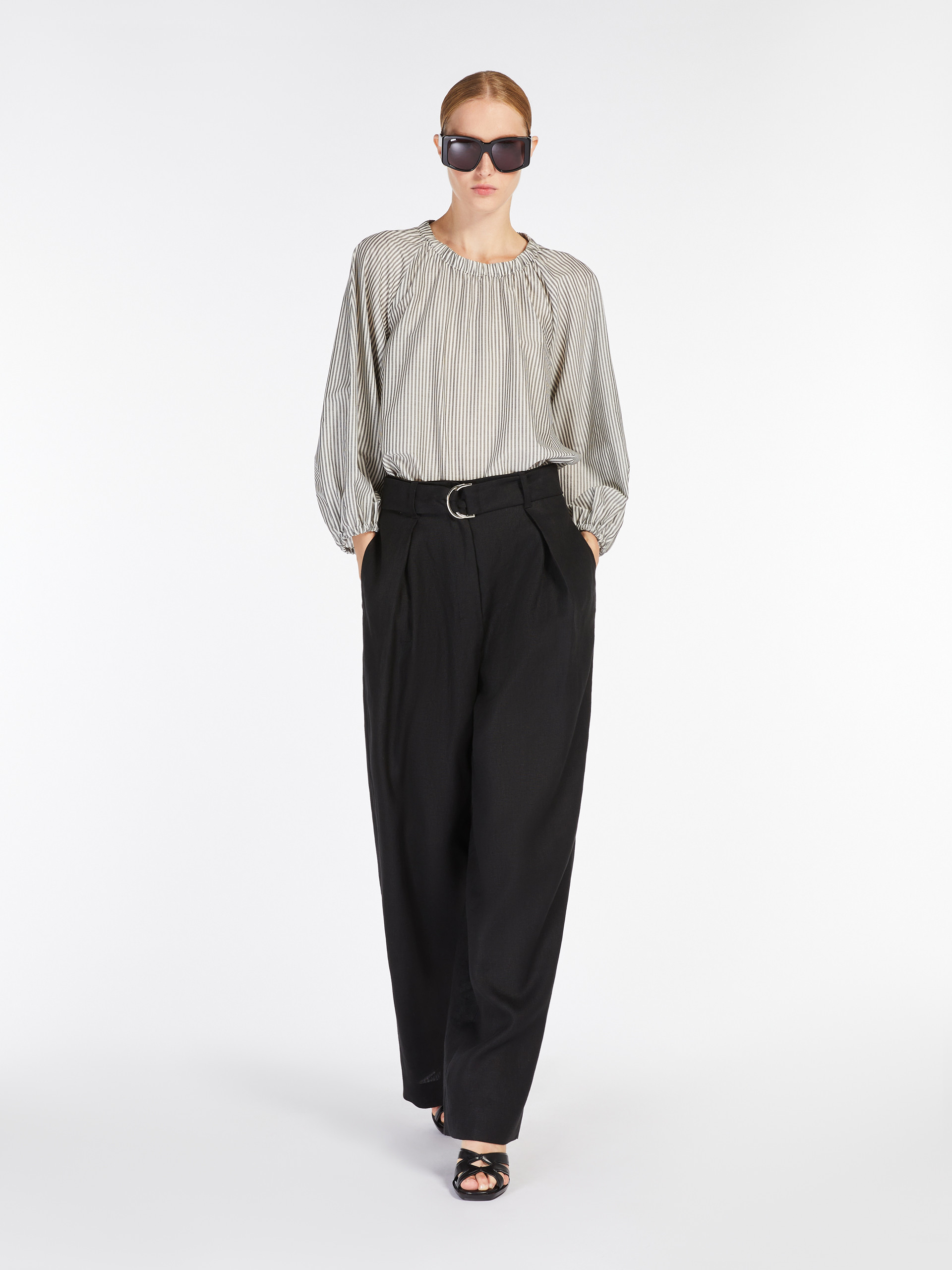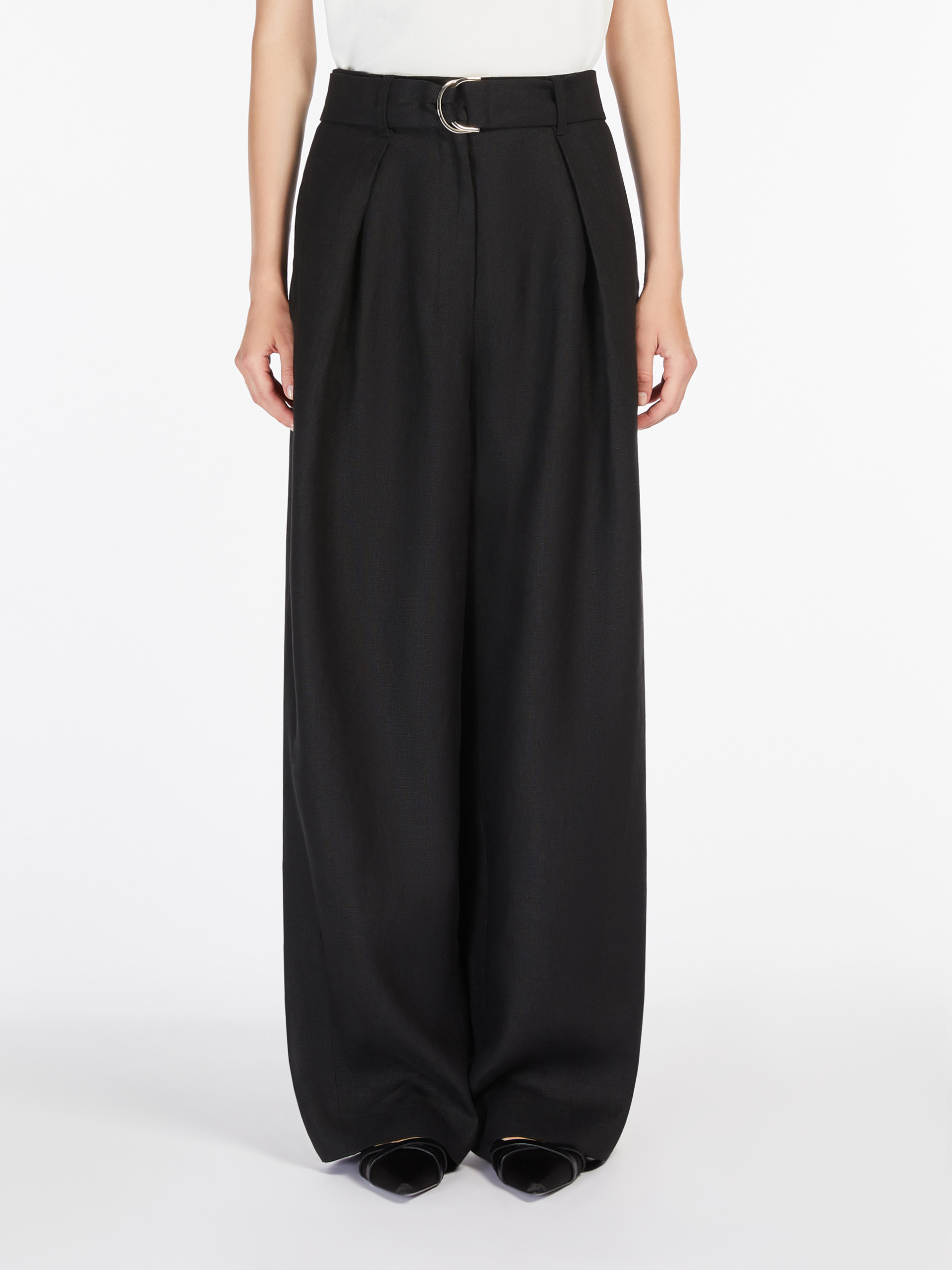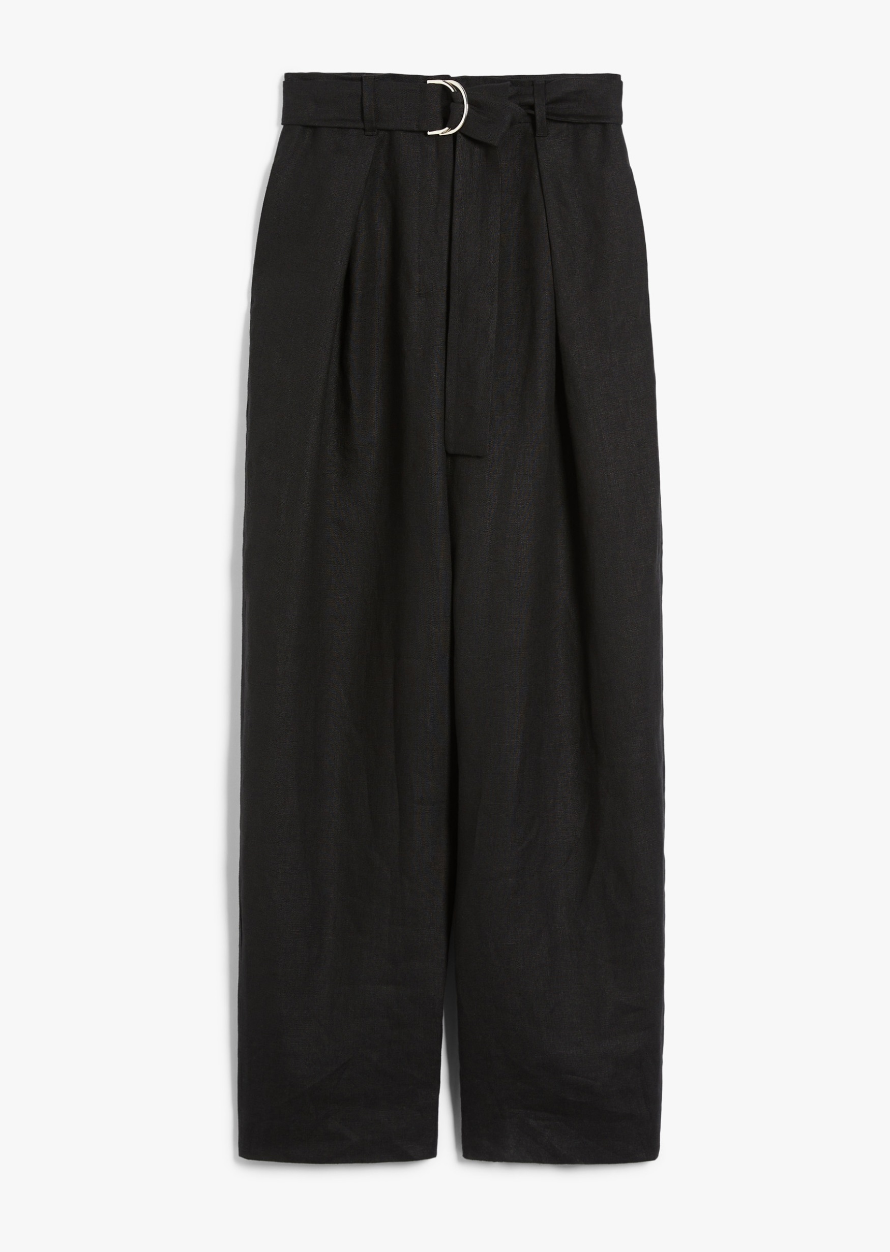 Брюки Max Mara S — втілення сучасної елегантності з акцентом на комфорт і стиль. Модель виготовлена зі 100% льону, що забезпечує легкість і дихаючі властивості, ідеальні для теплого сезону. Чорний колір надає універсальності та дозволяє легко поєднувати брюки з різними елементами гардероба. Висока посадка та широкий крій створюють витончений силует, а акцентні защипи спереду додають структуру. Деталі включають приховану застібку на блискавку та гачок, бокові кишені та задні прорізні кишені з ґудзиками. Комплектується поясом з пряжкою, що підкреслює талію. Ці брюки легко поєднуються з легкими блузами, топами та жакетами, дозволяючи створювати як повсякденні, так і більш формальні образи. Брюки Max Mara S — ідеальний вибір для тих, хто цінує поєднання комфорту, якості та витонченого стилю.