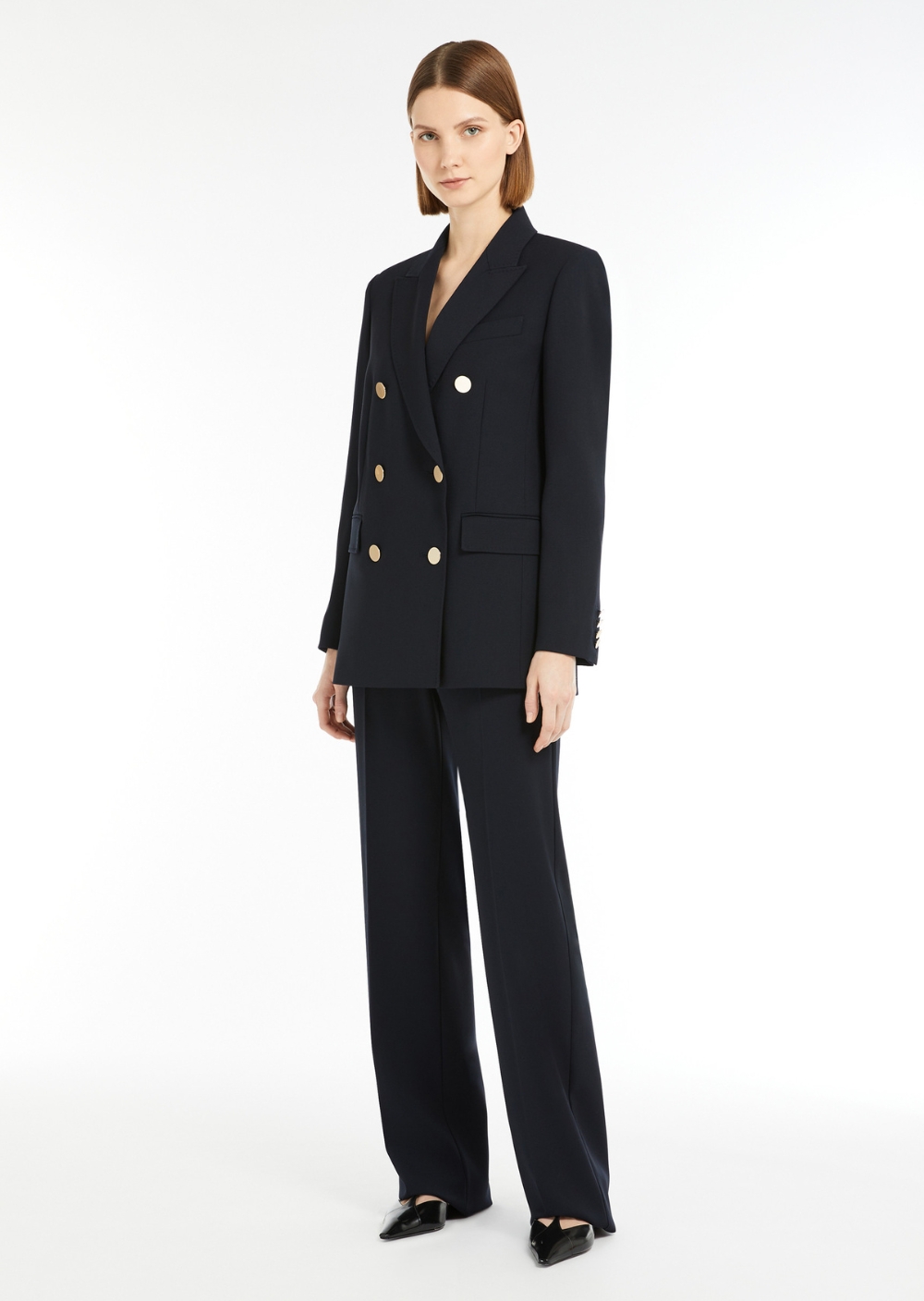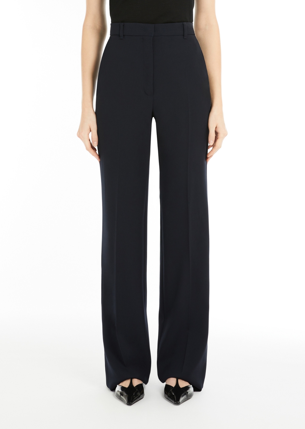 Штани прямого крою, виготовлені з тонкого атласного крепу з чистої вовни, з пресованими складками на штанинах. Прикрашені косими бічними кишенями та петлями для ременя. Високий пояс, застібка на блискавку та застібка на гачки.