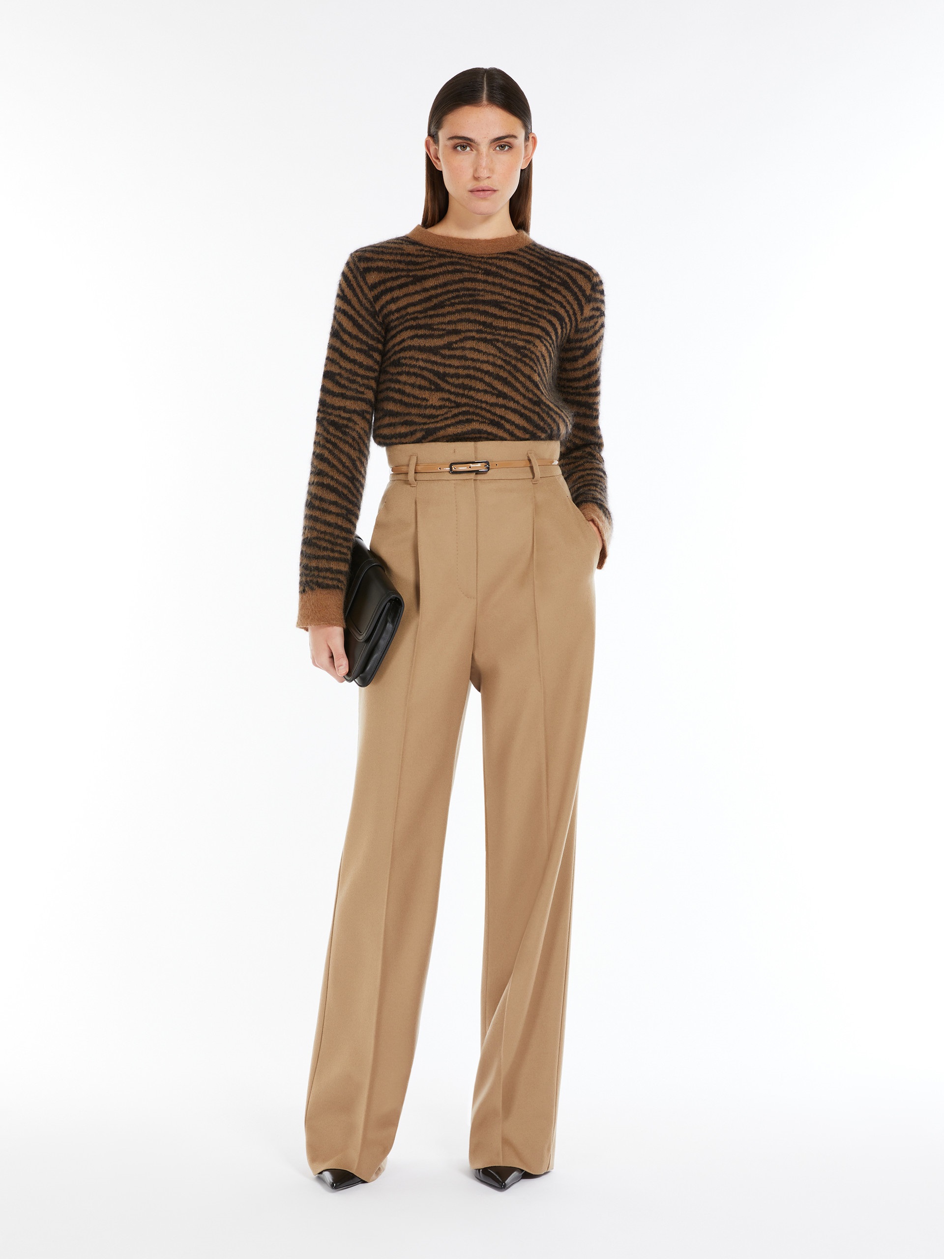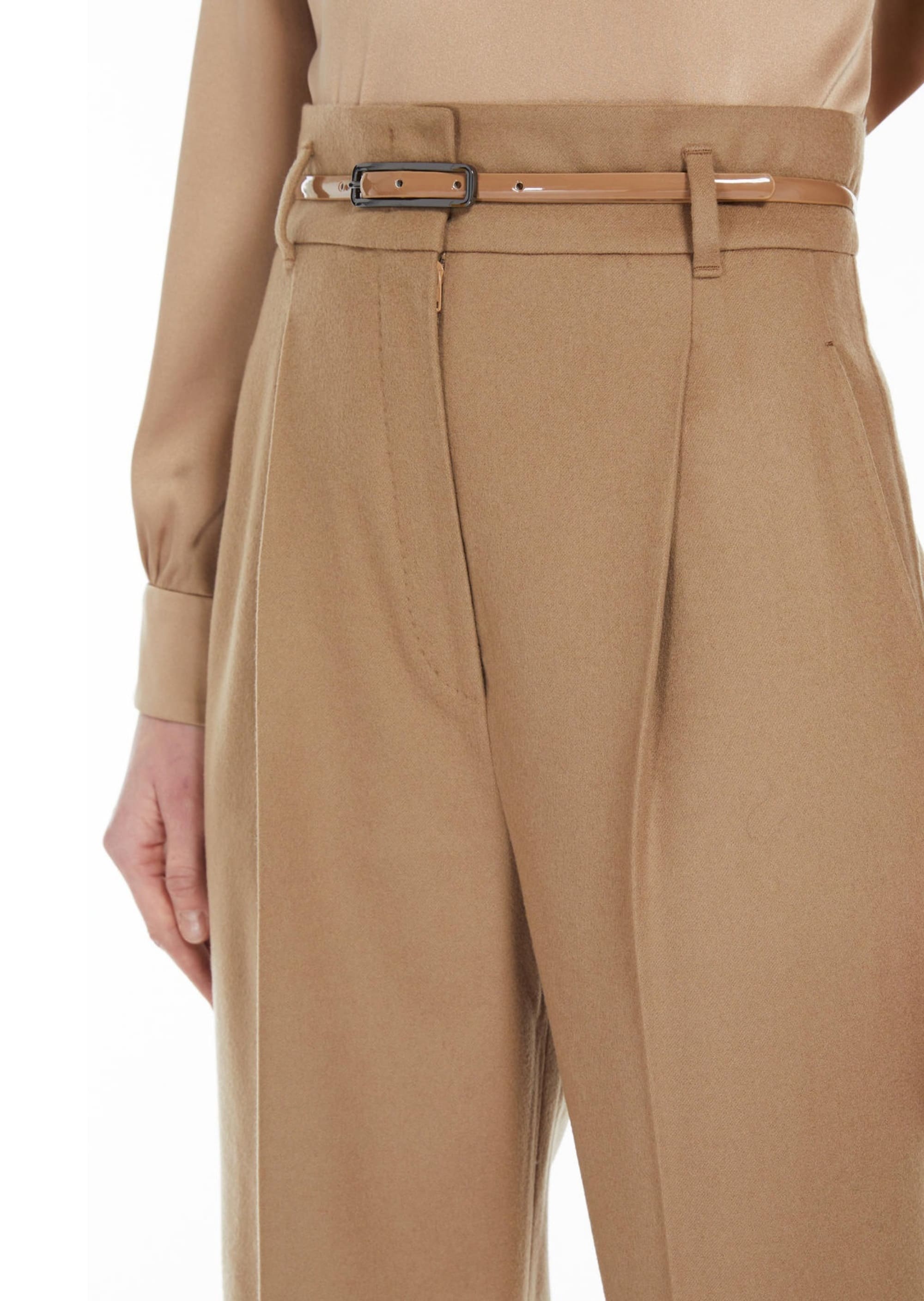 Штани з високою талією із тонкого сукна із чистої вовни. Модель прямого крою, має витягування спереду, пресовані складки на штанинах, косі бічні кишені та петлі для ременя. Ремінь в тон, що підкреслює силует жіночий.