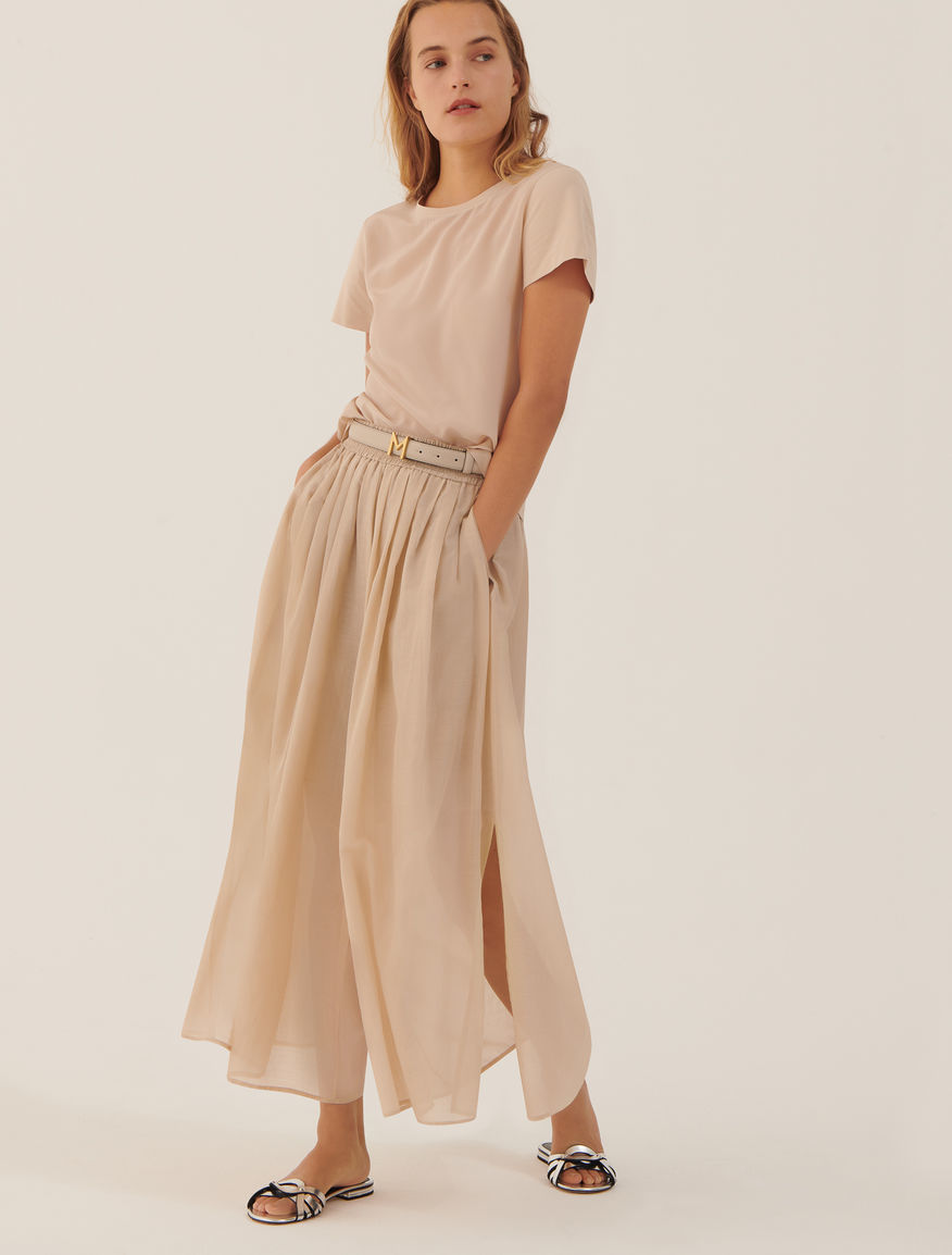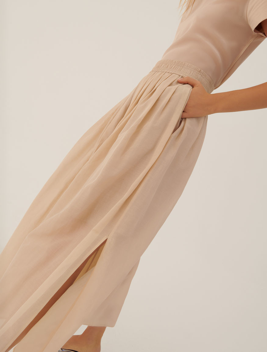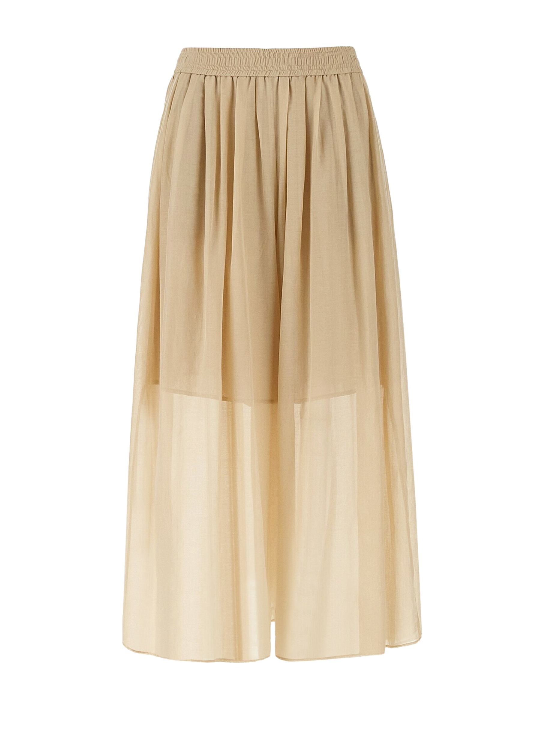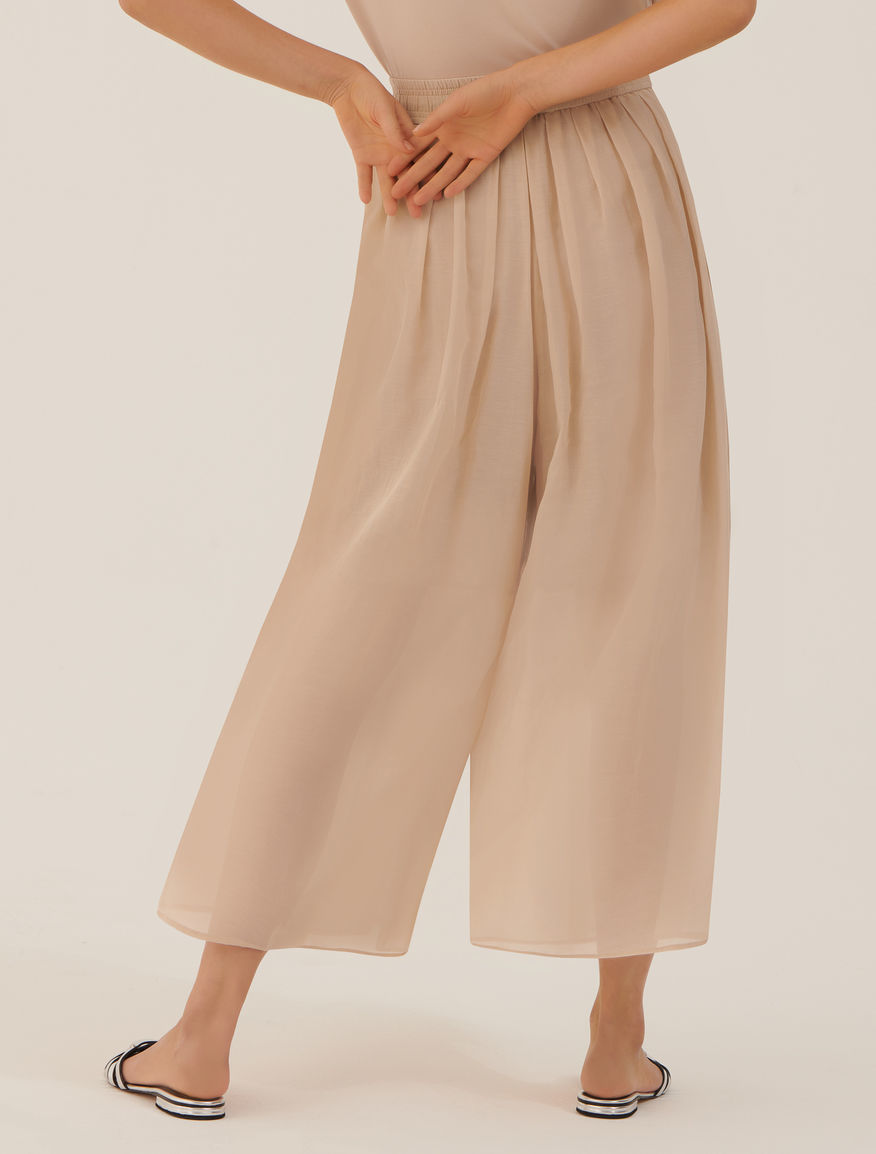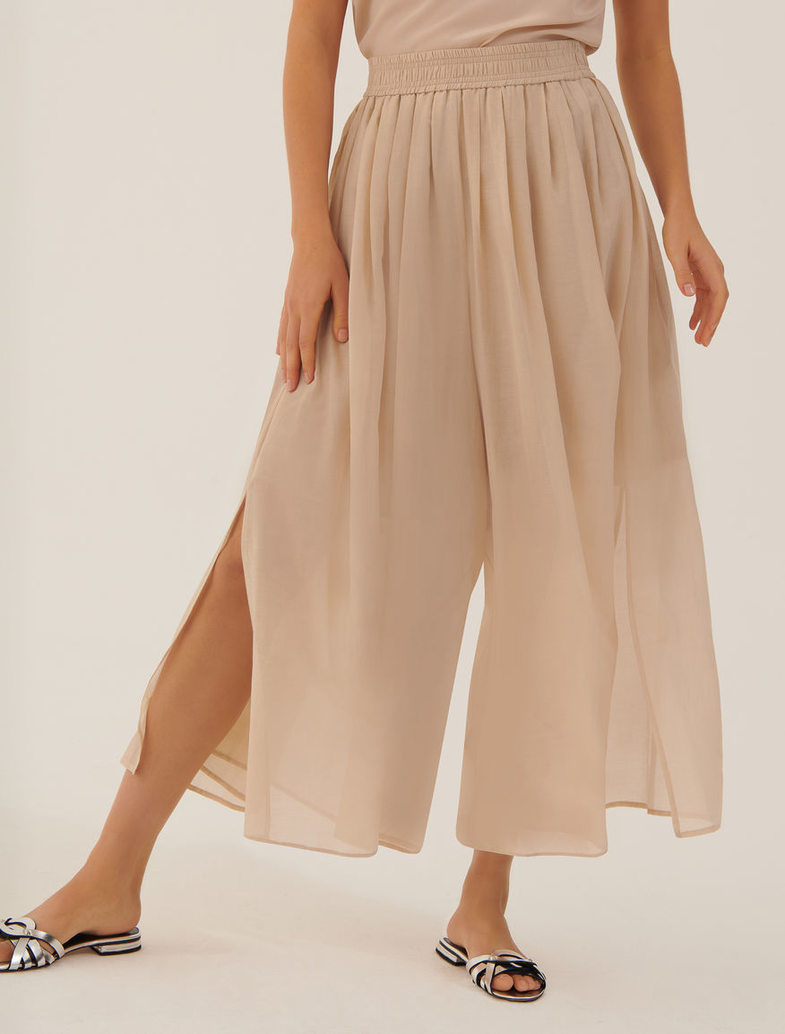 Однотонні брюки-спідниця палаццо із резинкою на талії. Модель бежевого кольору. Виготовлена із бавовняного мусліну. Стане ідеальним доповненням гардеробу любителям стилю Casual.