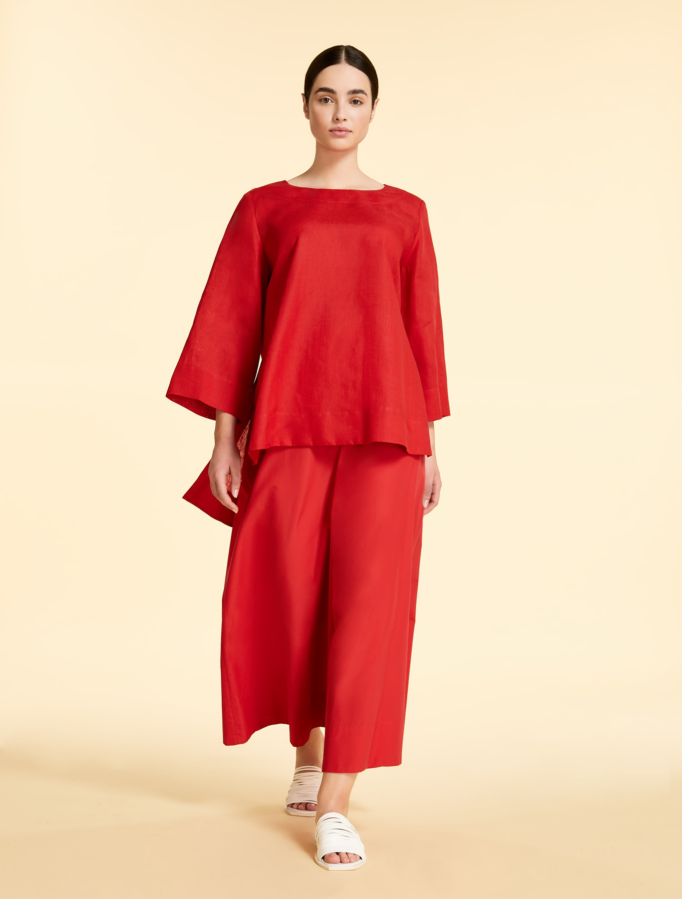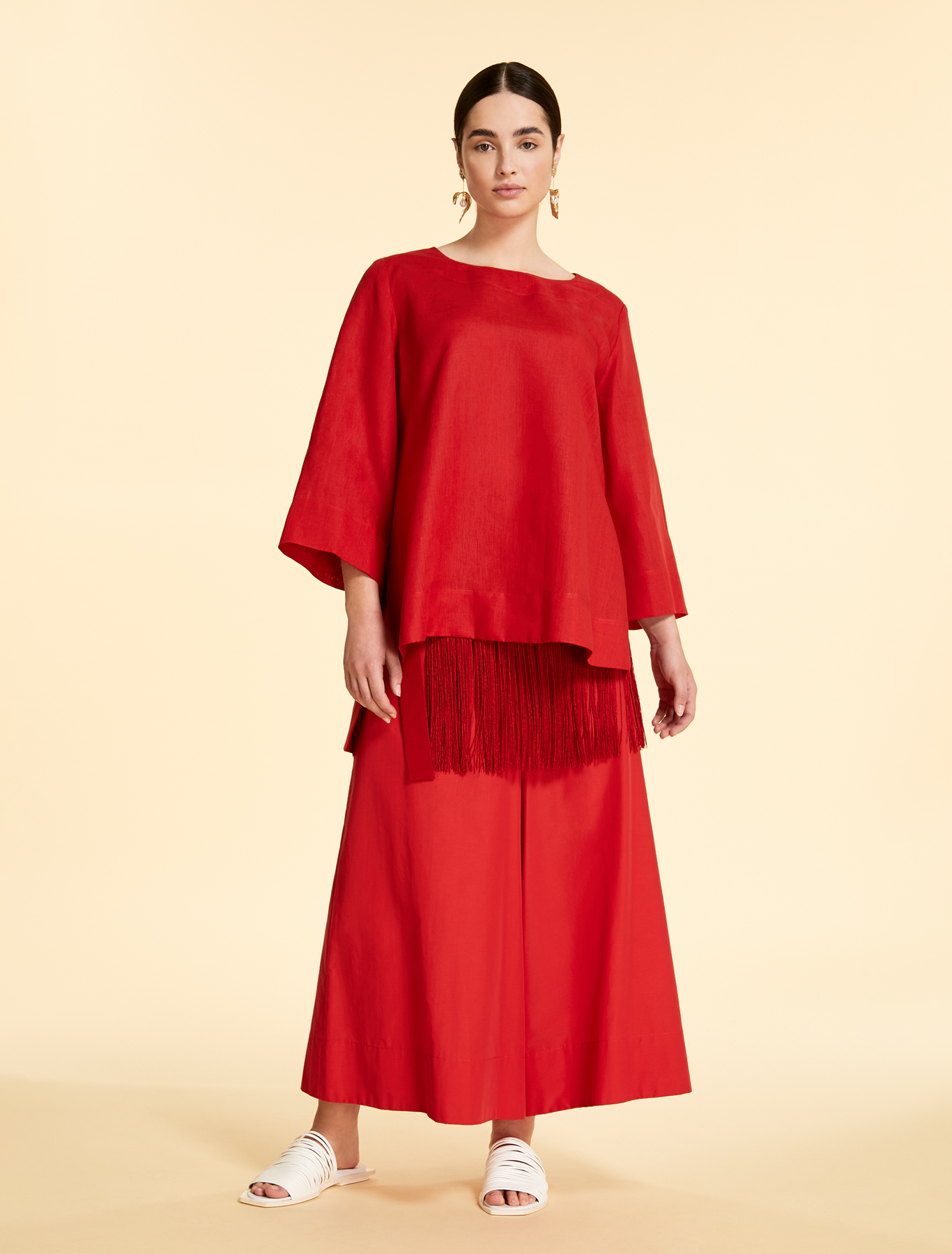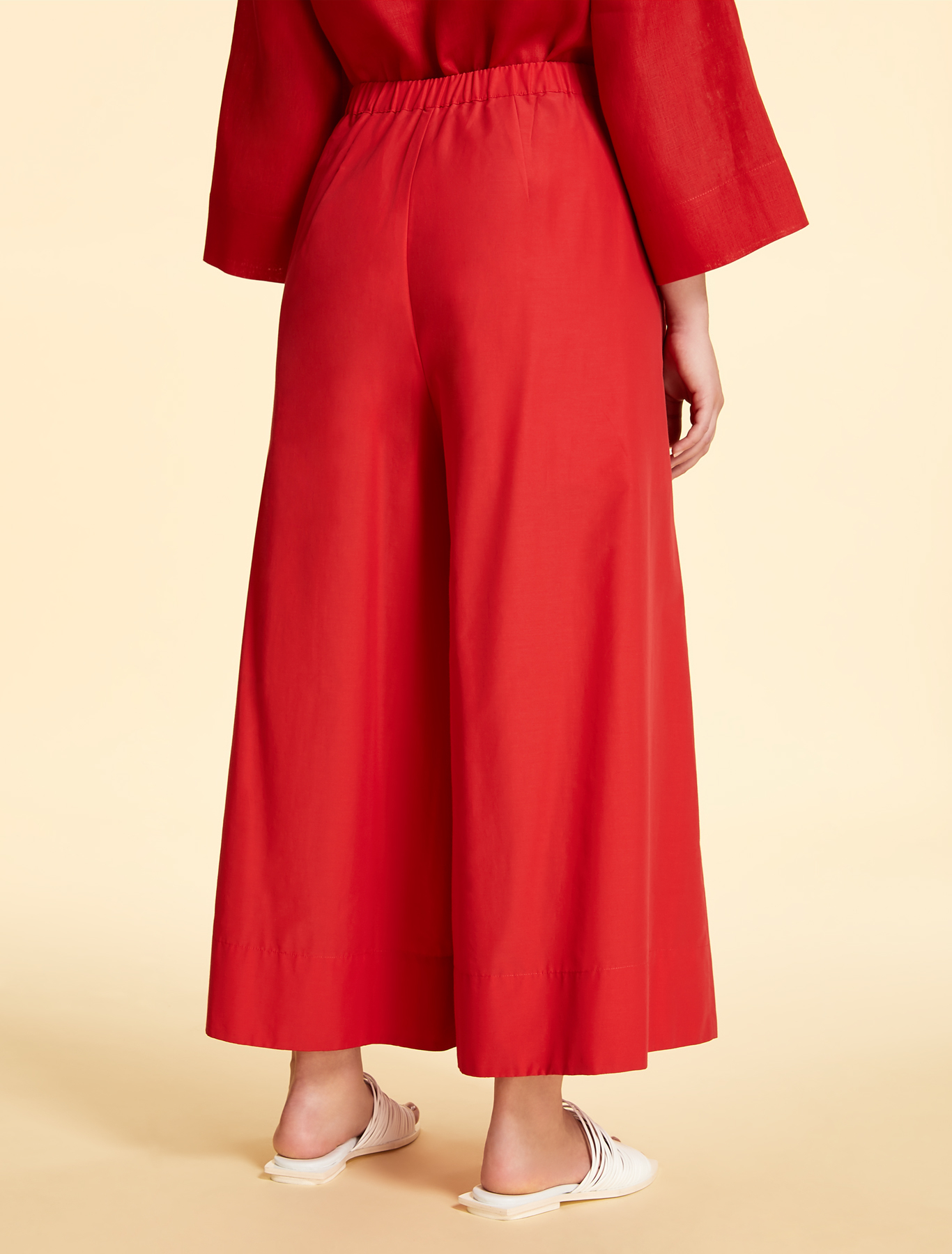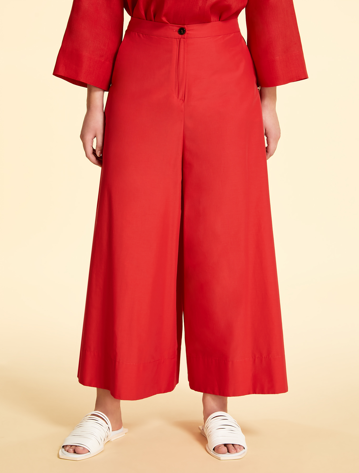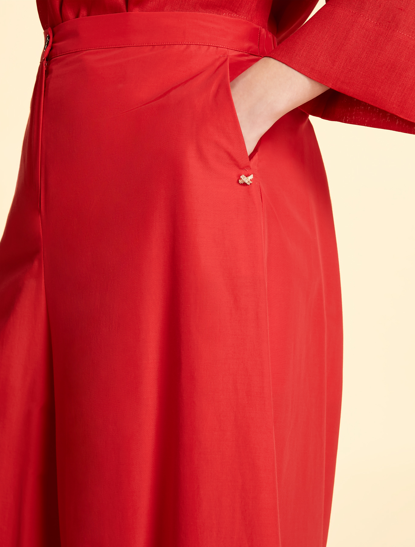 Повсякденні брюки-палаццо з високою посадкою в червоному кольорі. Штани виготовлені з бавовняного попліну. Модель застібається на блискавку та ґудзик, з прорізними кишенями.