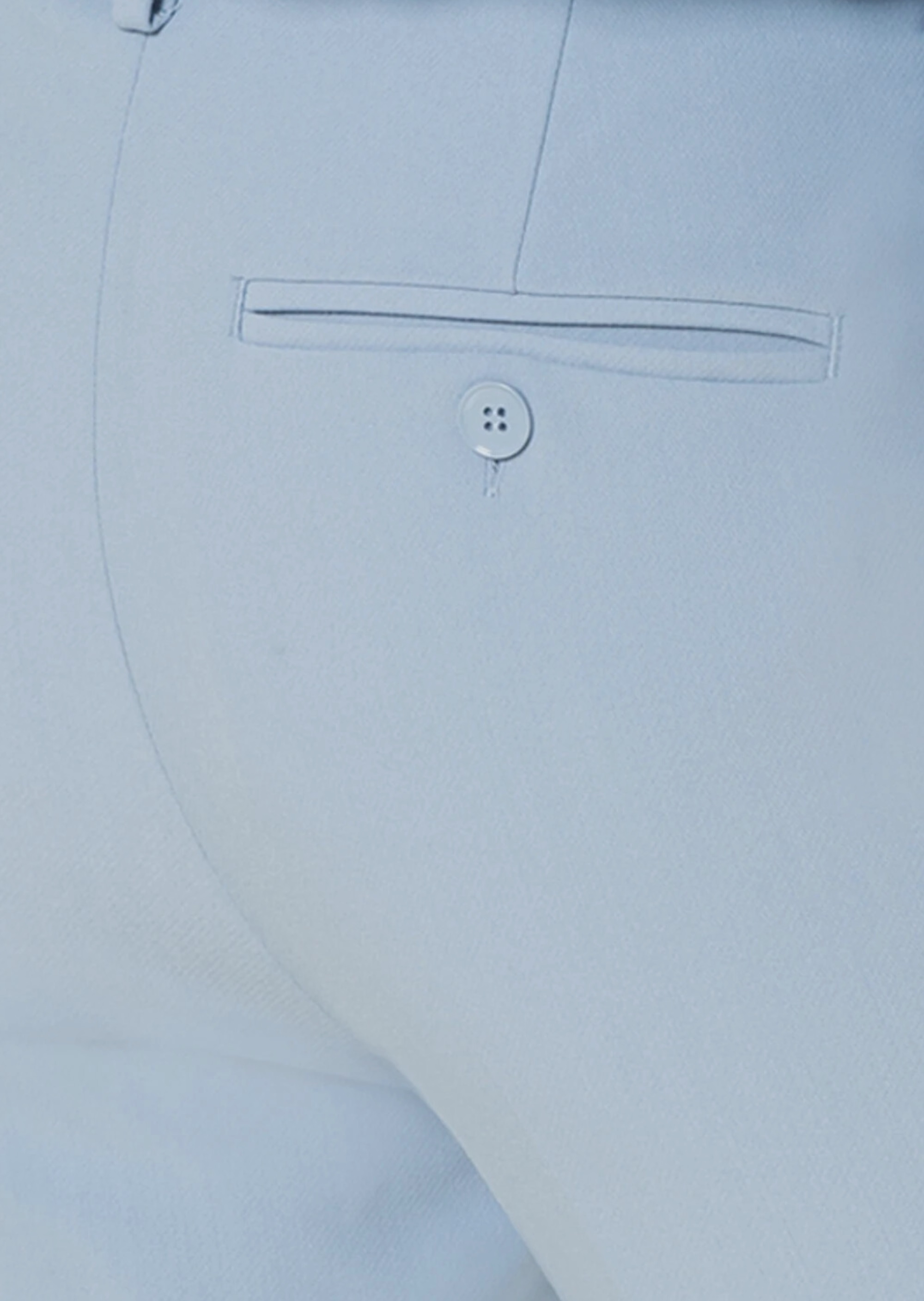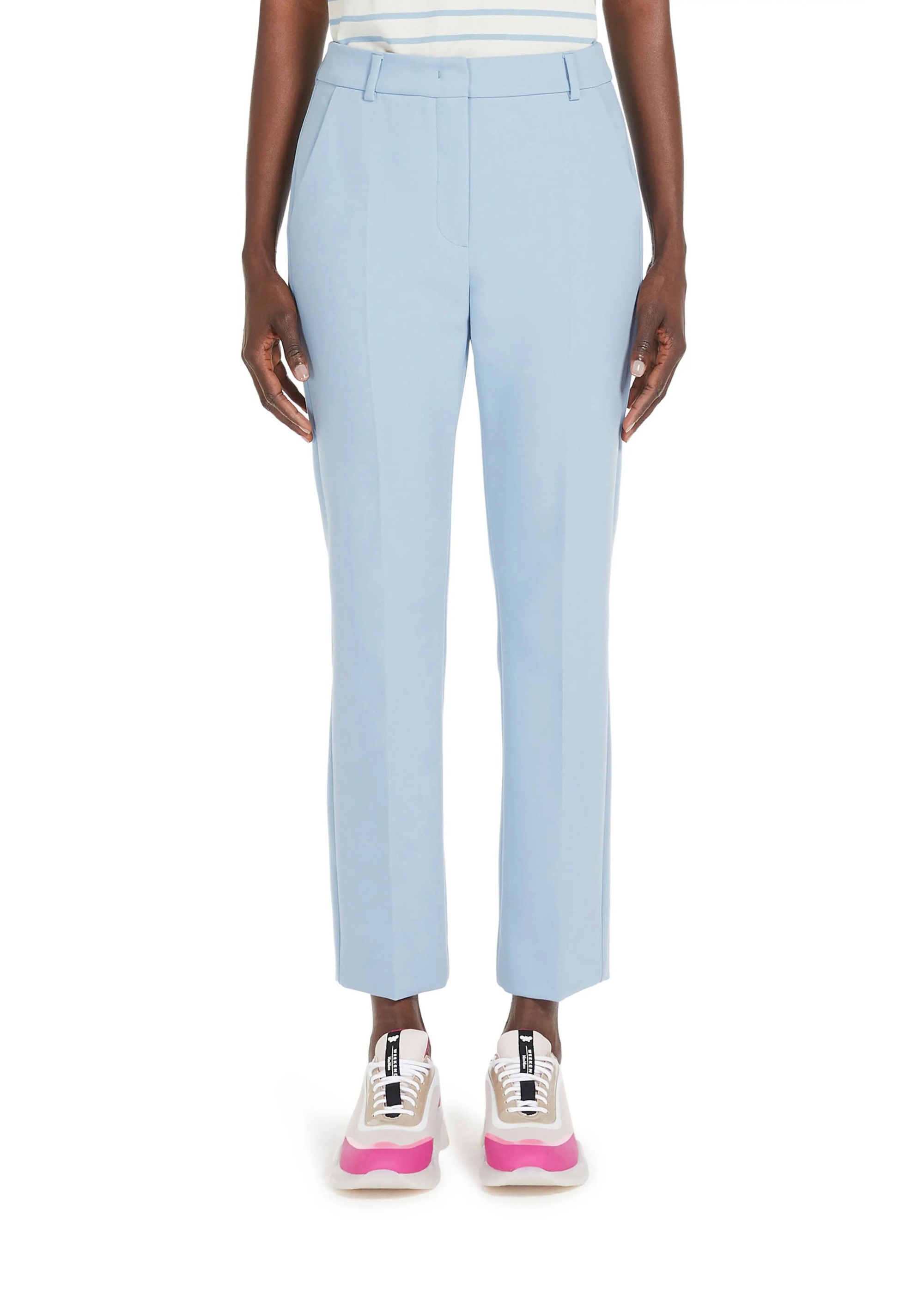 Брюки з стрейч-віскози класичного силуету з прямими штанинами та гладкою складкою. Модель має бічні кишені та подвійні прорізні кишені на гудзиках ззаду. Ремінець на талії з високим вирізом та застібка-блискавка.