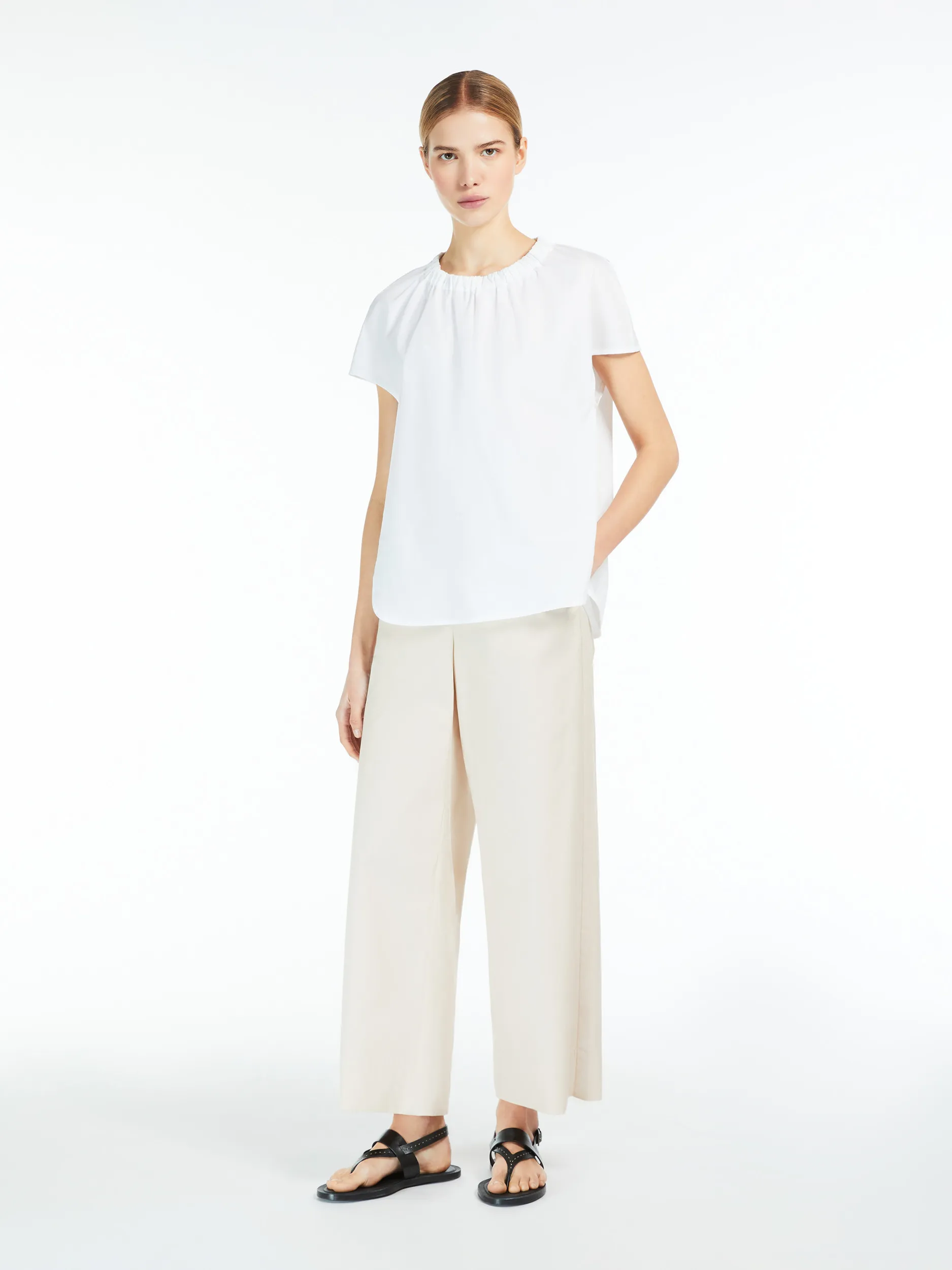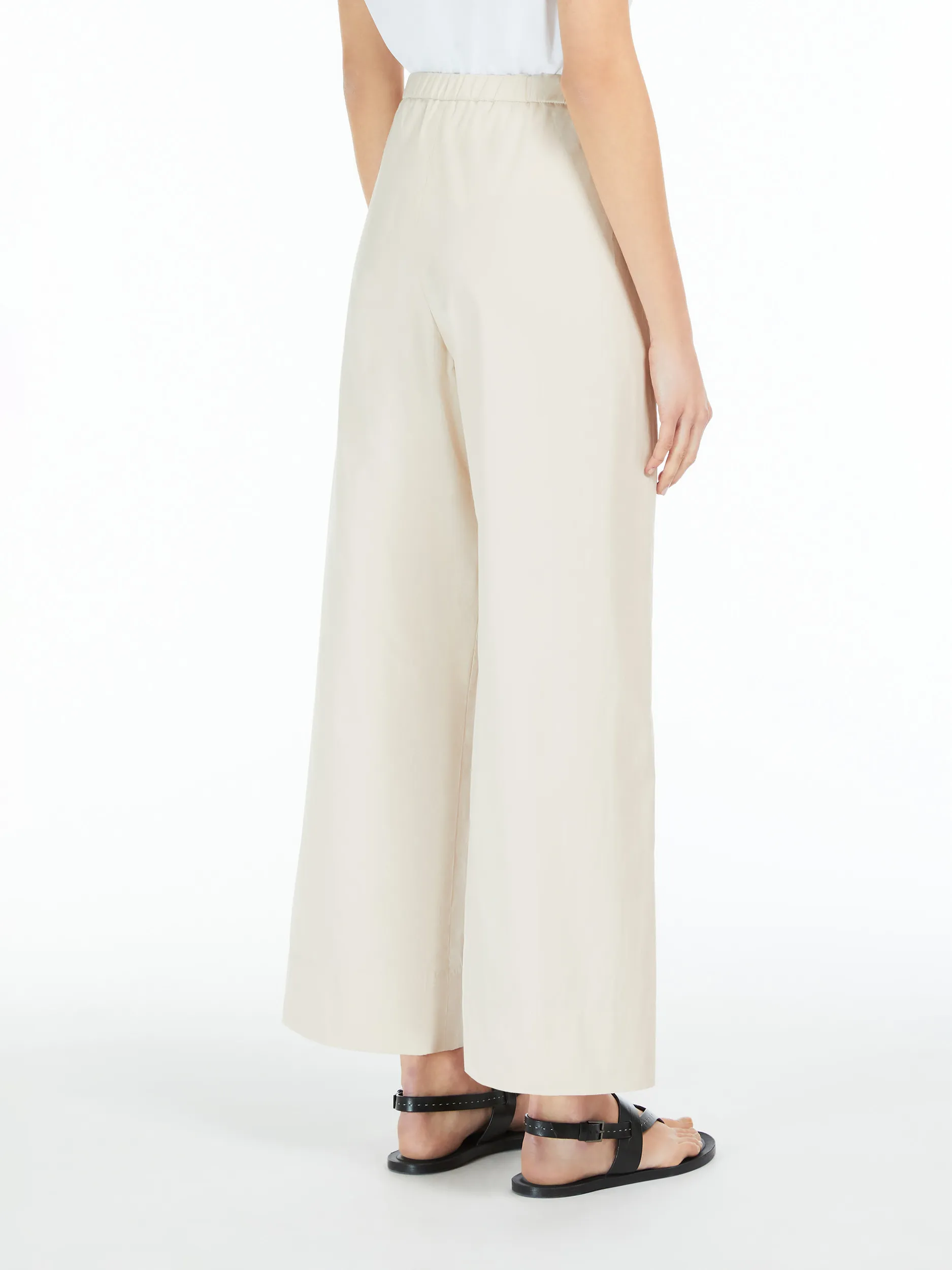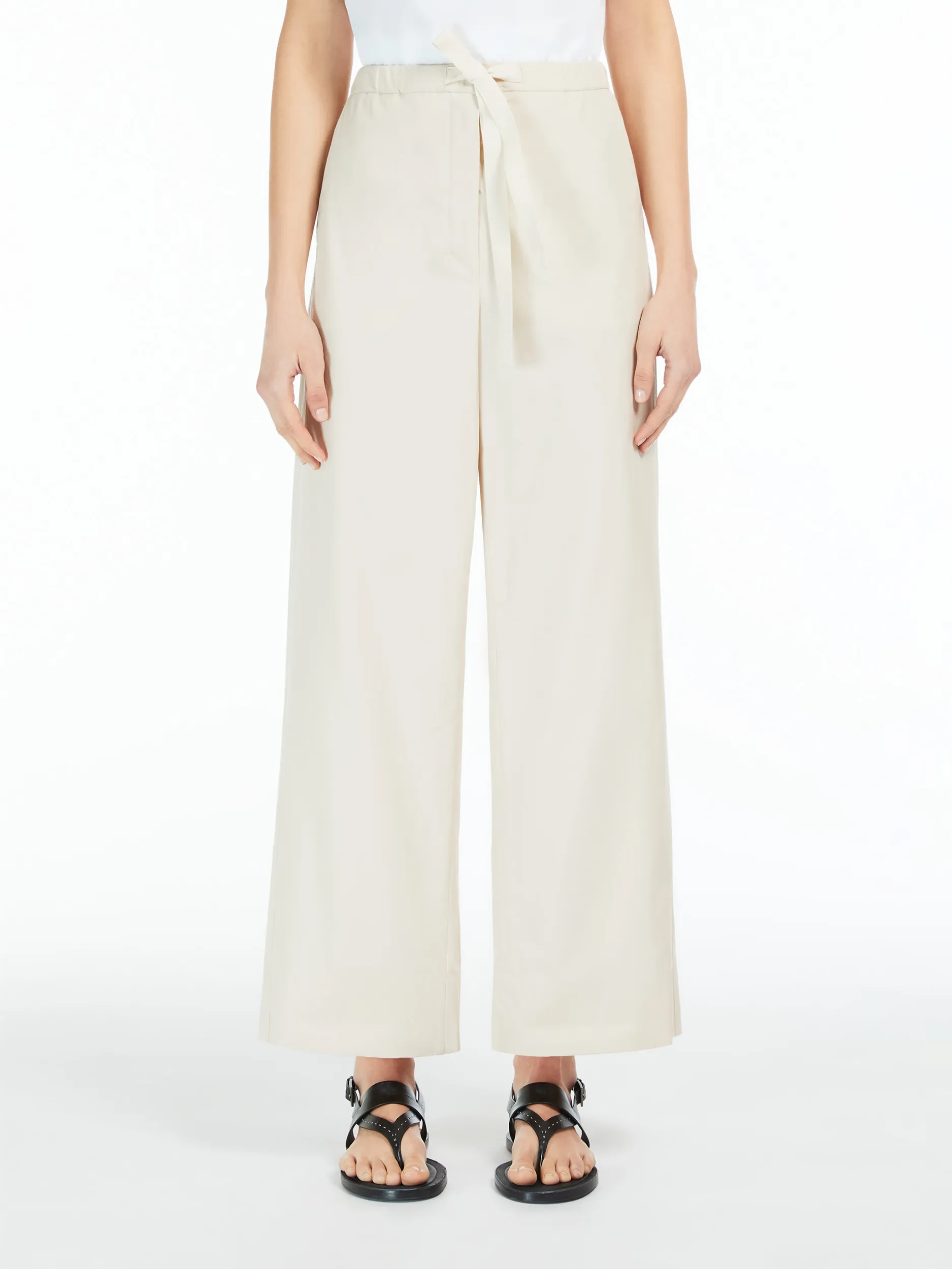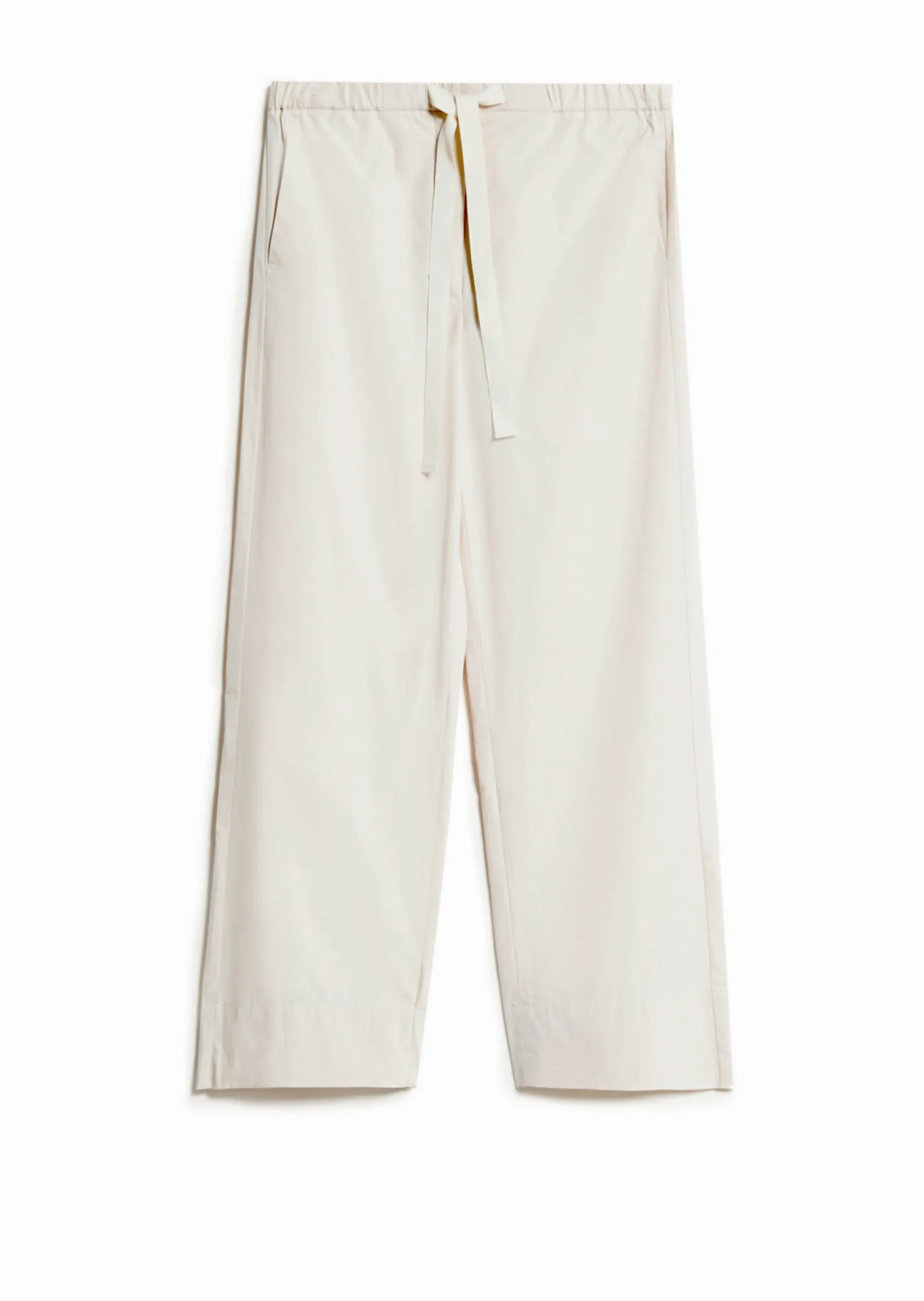Комфортні штани з м’якої бавовняної тканини попліну з еластичним поясом і шнурком із технічної стрічки. Прикрашений косими бічними кишенями.