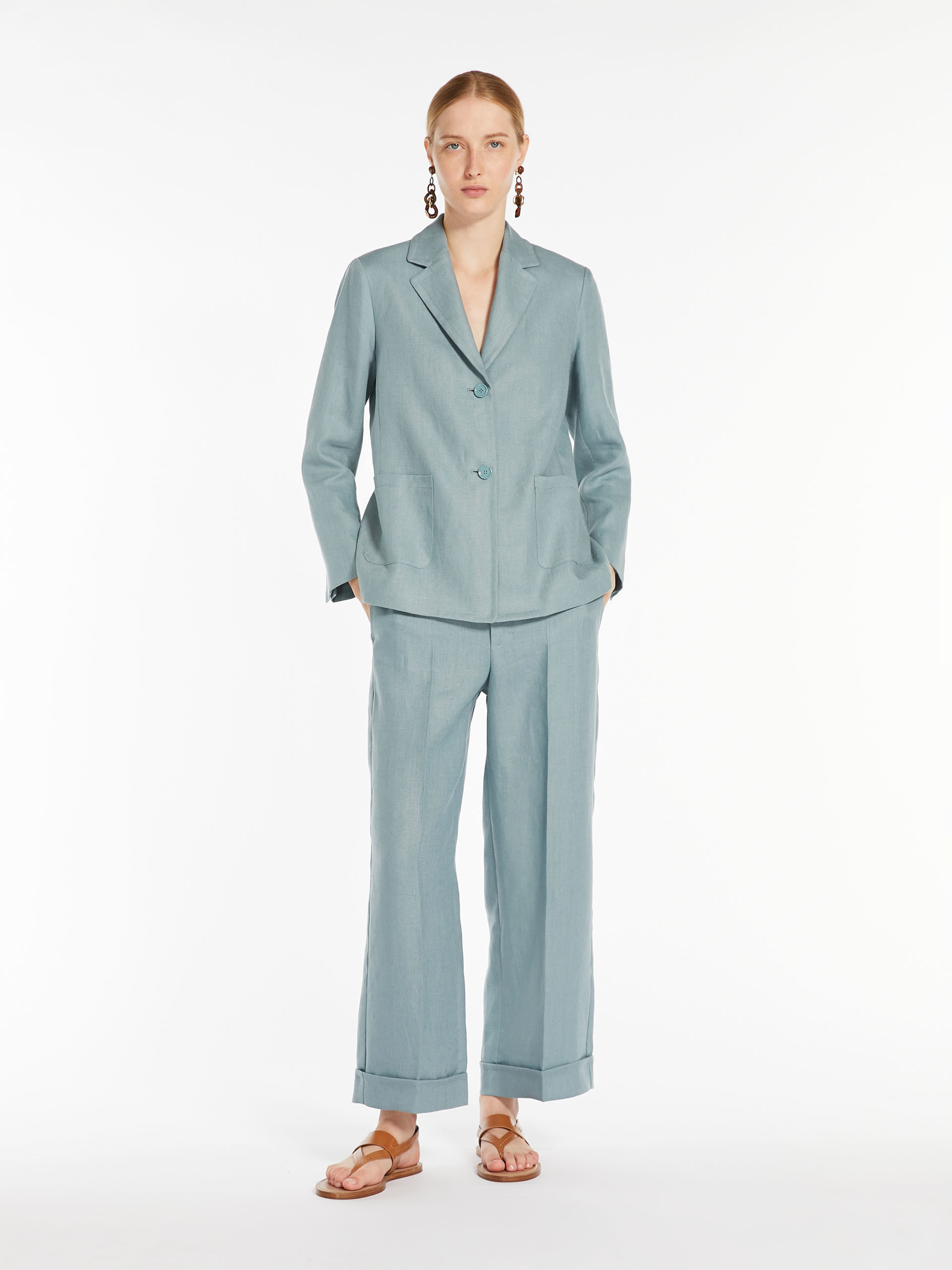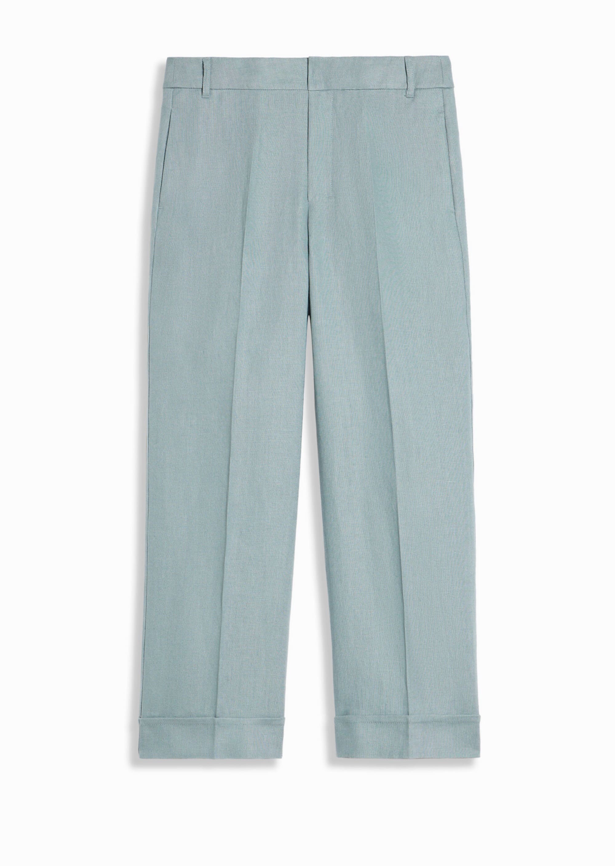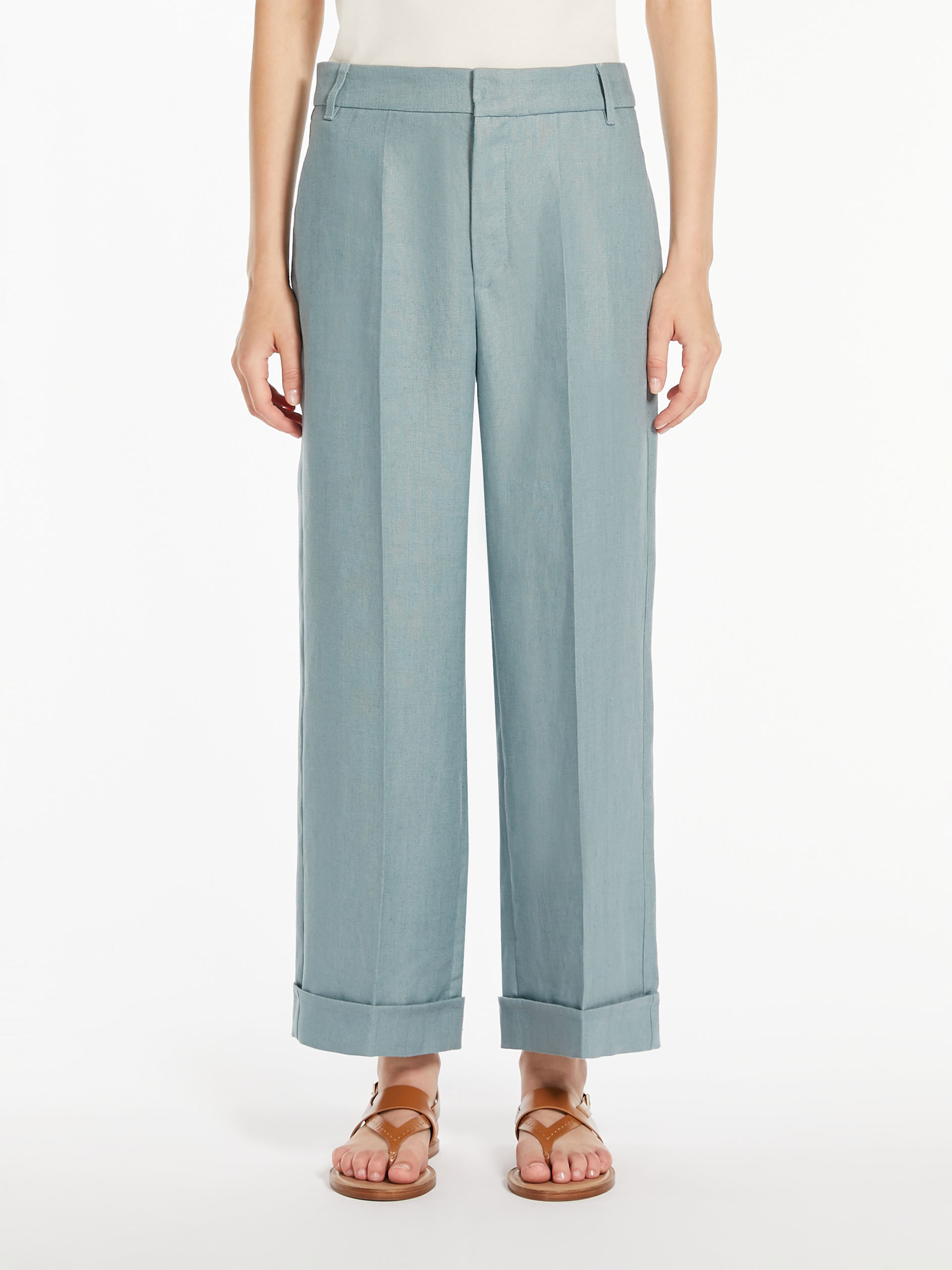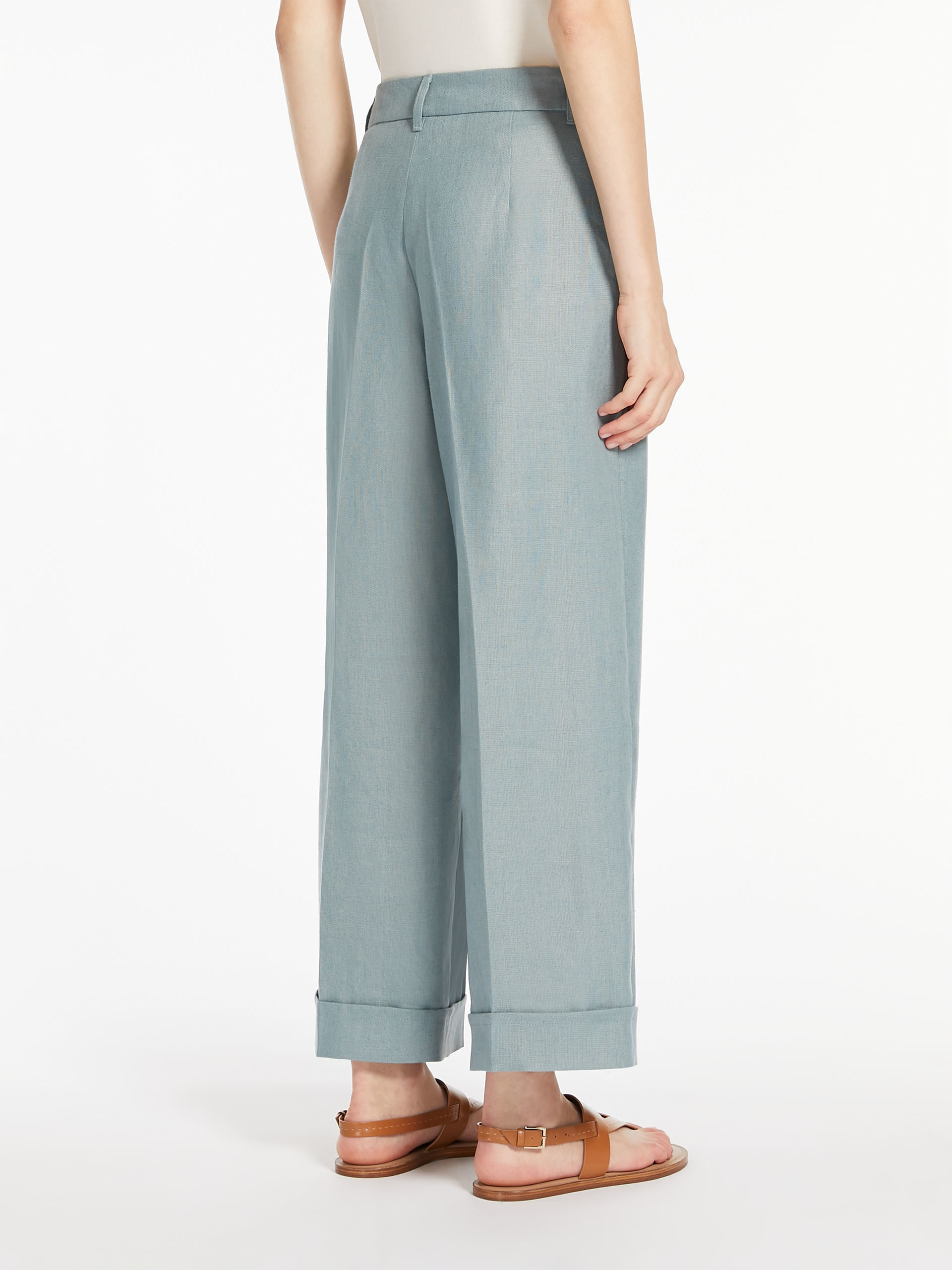 Широкі брюки-палаццо з чистого лляного полотна з гладкою складкою та підгорнутим подолом. Прикрашений петлею для ременя та бічними кишенями у швах. Високий пояс має блискавку з клапаном і застібку-липучку.