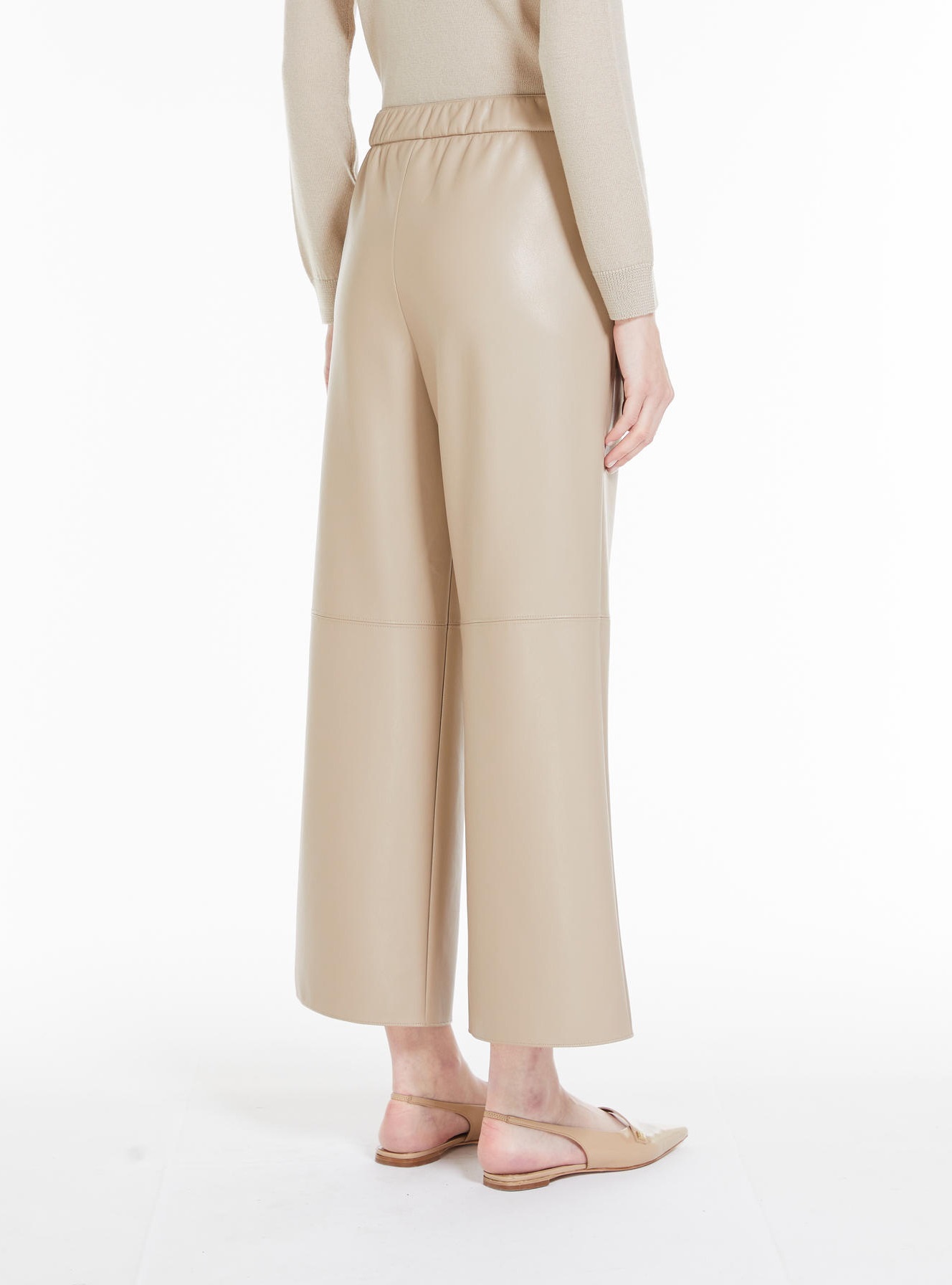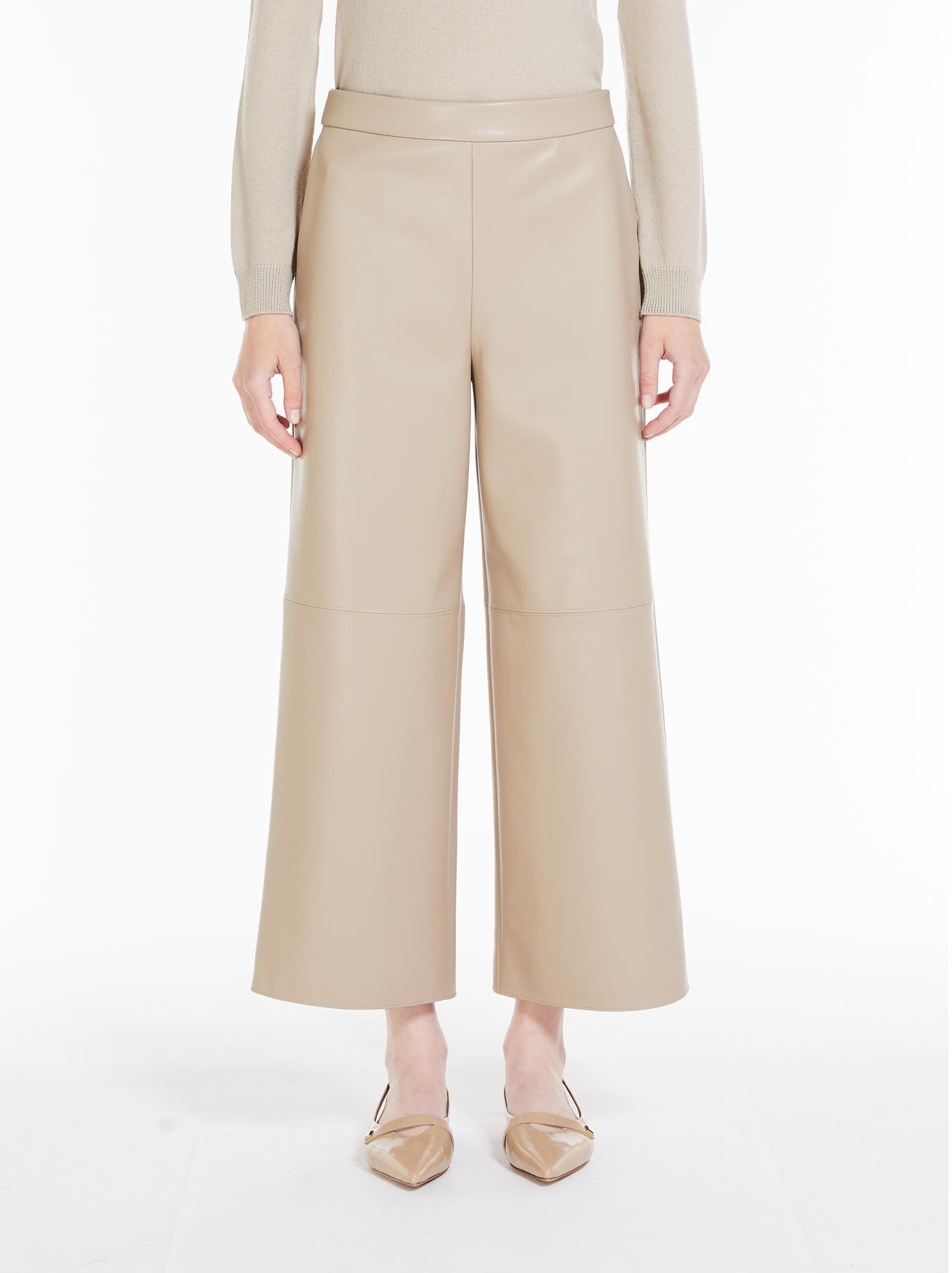 Широкі брюки з м’якої тканини з покриттям зі шкіряними виробами та строчками. Одяг також має еластичний пояс і бічні кишені.