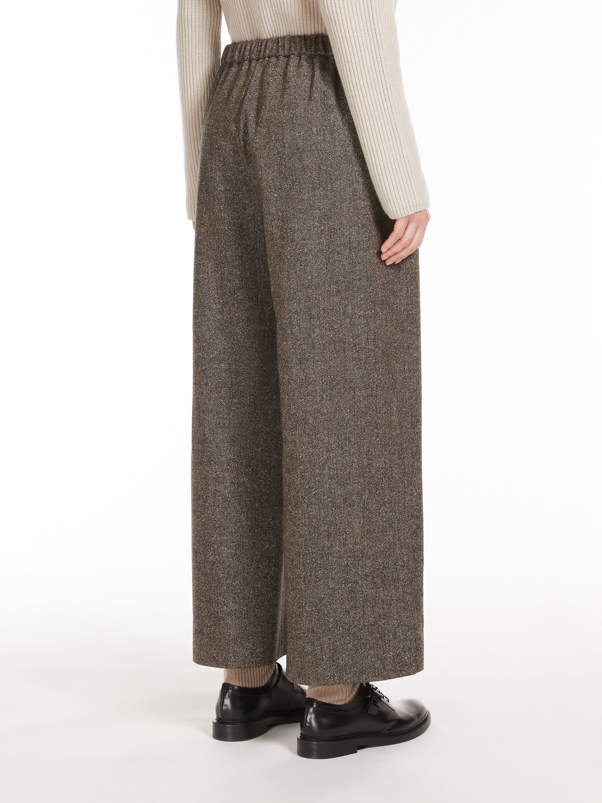 Штани, виконані з еластичної вовняної тканини, на ґудзиках, вільного крою, з еластичною талією та регульованою куліскою спереду. Доповнено косими кишенями з боків. Застібка на гачок спереду та потаємна блискавка.