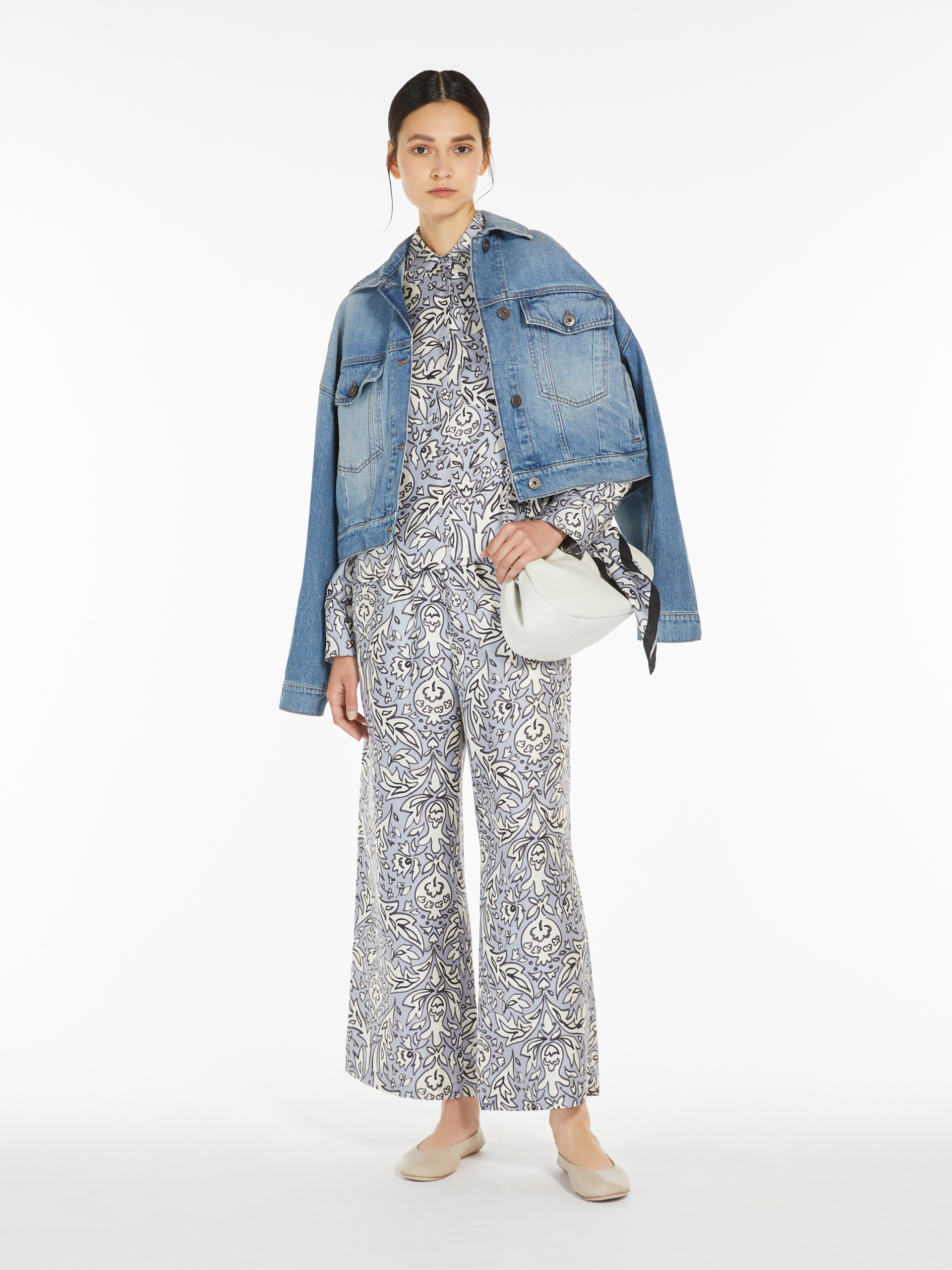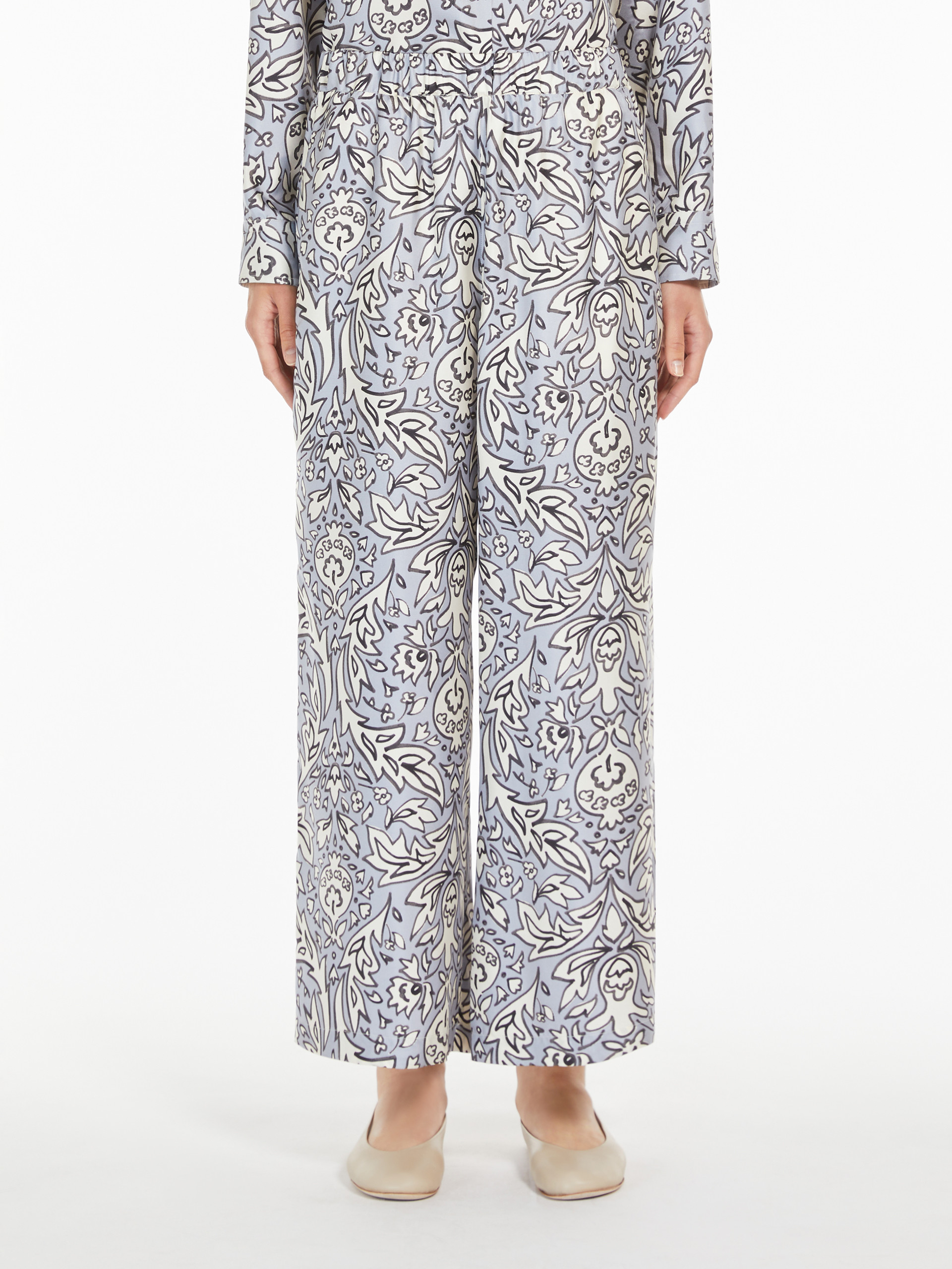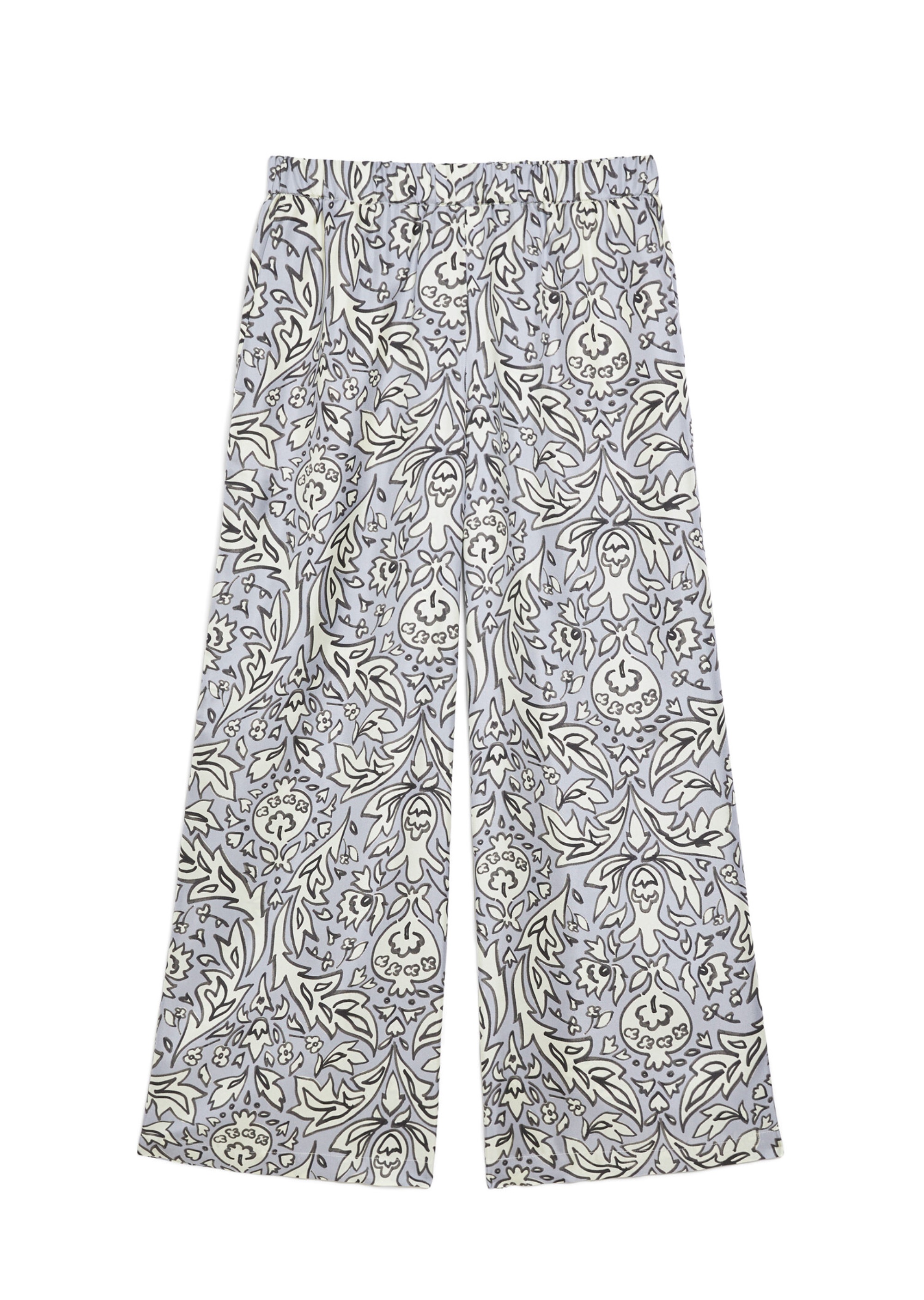 Штани виготовлені з тонкої тканини - шовкового крепу. Модель вільного крою з еластичним поясом та косими бічними кишенями.