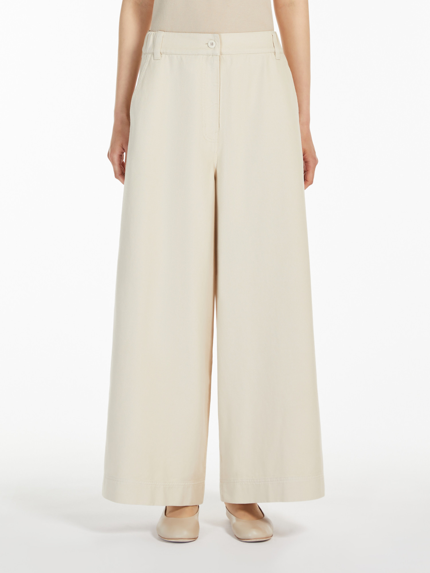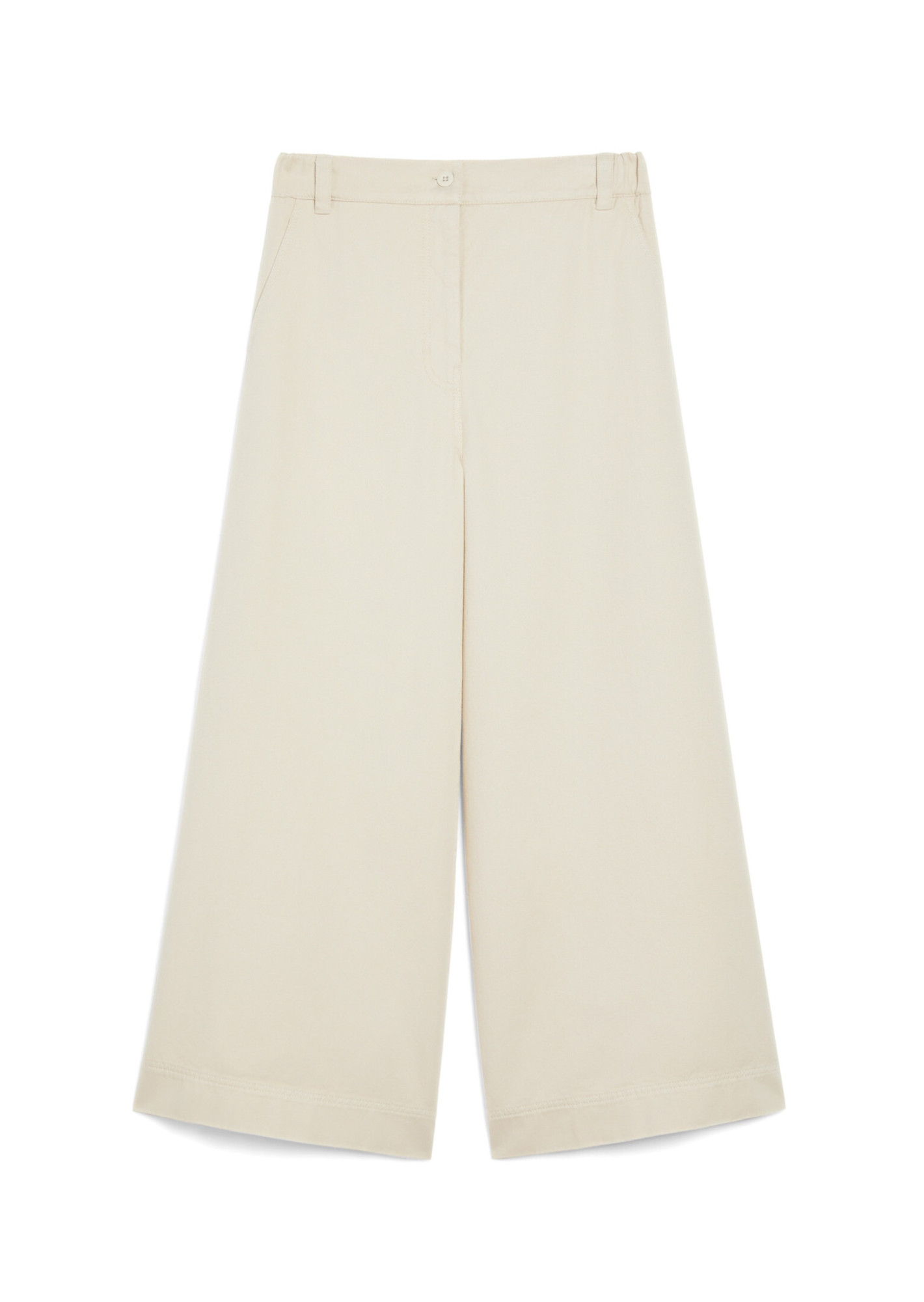 Широкі штани виконані з 100% бавовни, з еластичним поясом. Модель із косими бічними та накладними задніми кишенями.