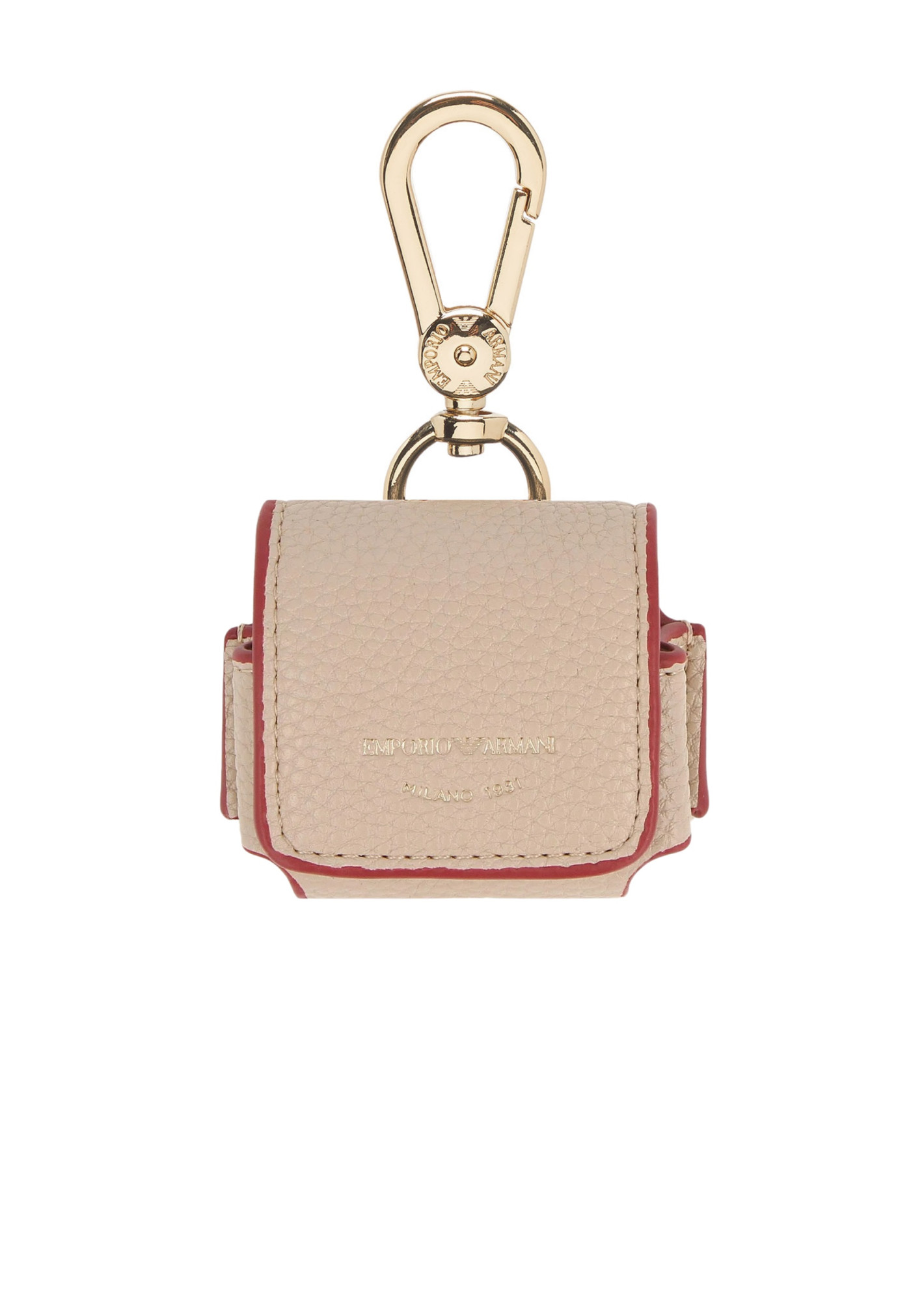 Світло-коричневий чохол для навушників AirPods в стилі Casual. Виготовлений з екошкіри. Оздоблений золотистою фурнітурою та логотипом Emporio Armani.