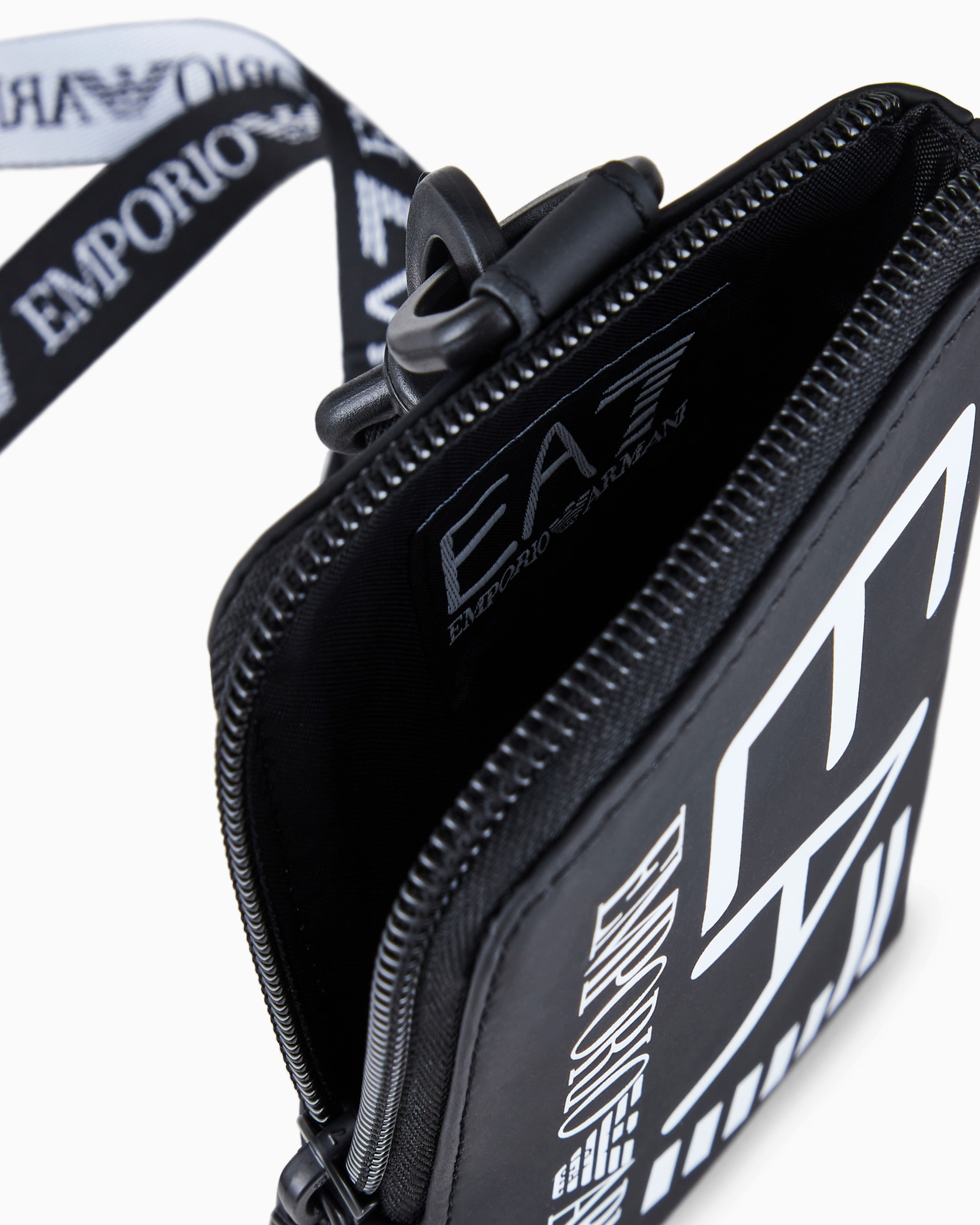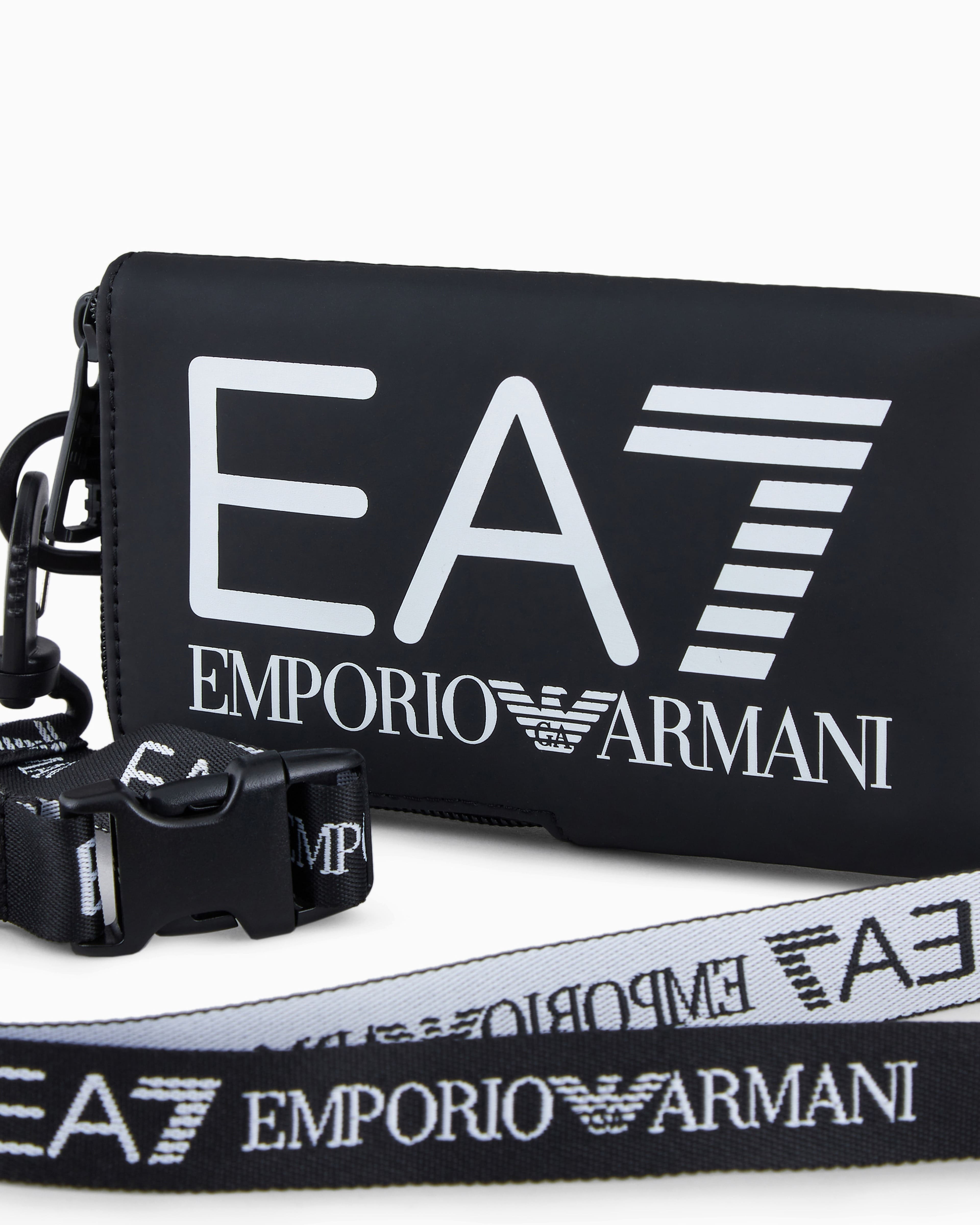 Чохол EA7 Emporio Armani для мобільного телефону поєднує компактність і спортивну функціональність. Виготовлений із міцного текстилю з прорезиненим покриттям, що захищає від вологи та зношування. Основне відділення на блискавці та знімний плечовий ремінь дозволяють носити аксесуар двома способами. Контрастний збільшений логотип підкреслює динамічний характер. Поєднується зі спортивними костюмами, вітрівками або кежуал-образами, створюючи лаконічний і функціональний акцент у спортивному гардеробі.