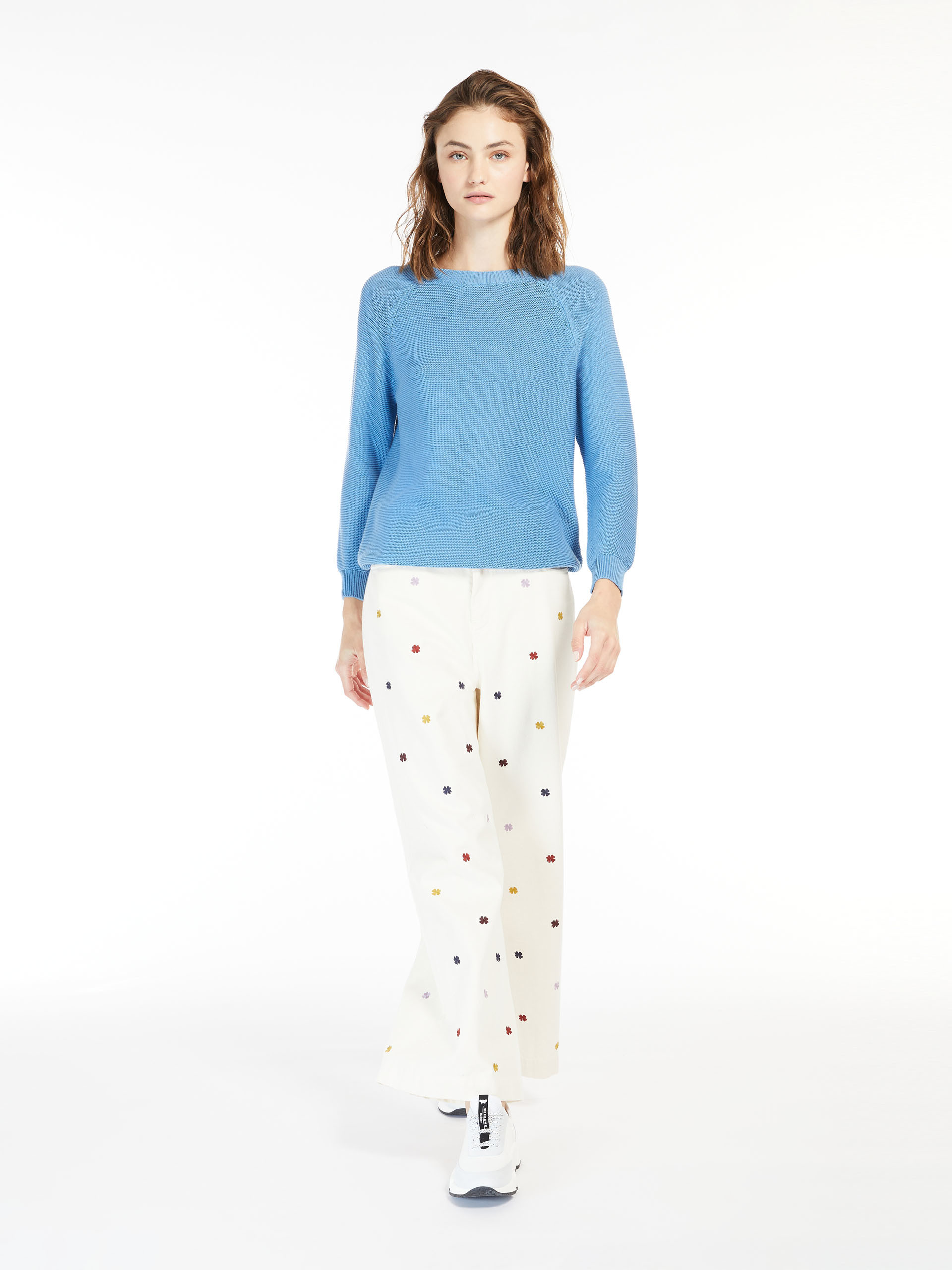 Джемпер вільного крою з чистої бавовняної пряжі, широким круглим вирізом і довгими рукавами реглан. Модель довжини міді прикрашена трикотажними планками в рубчик.