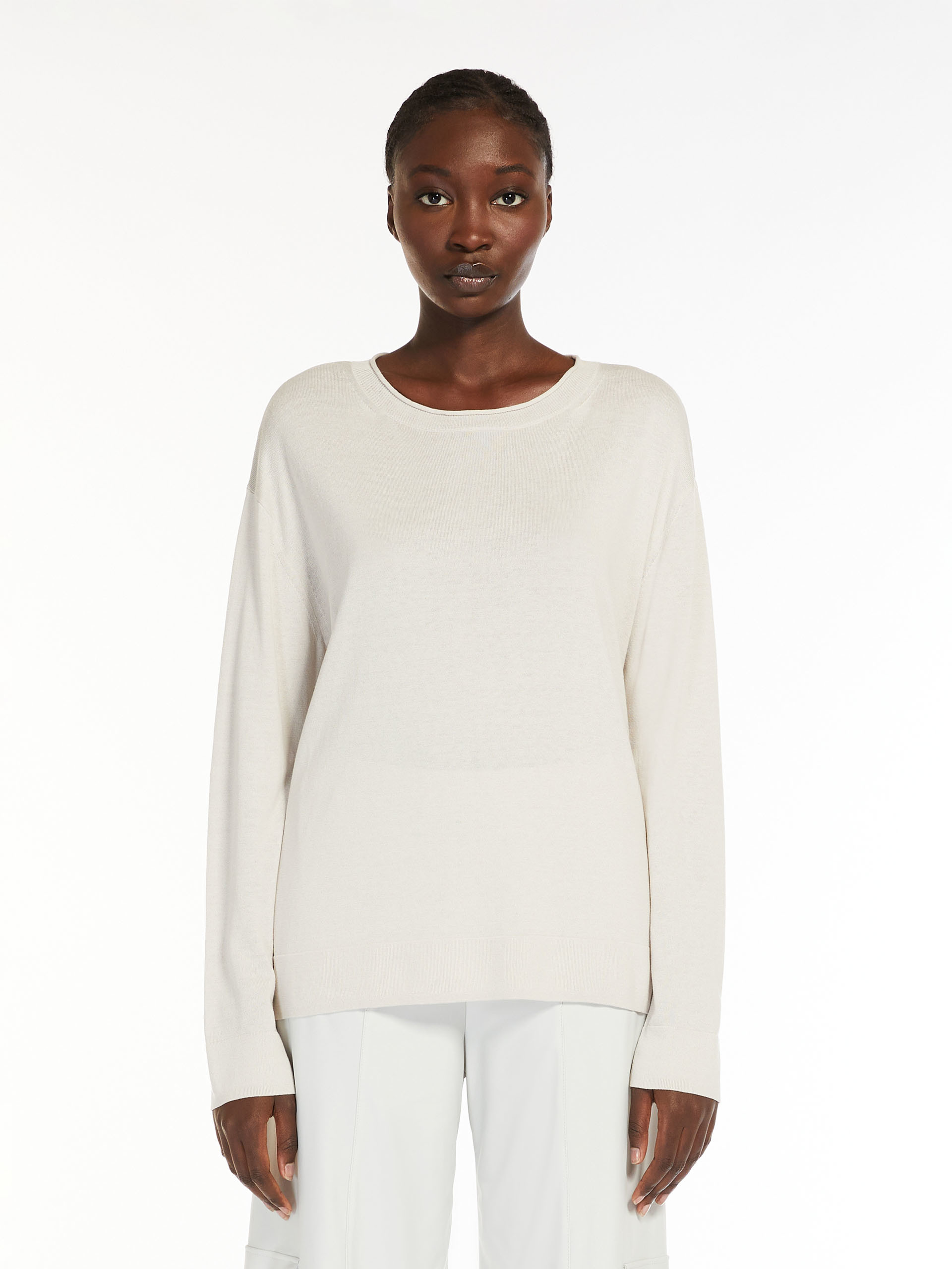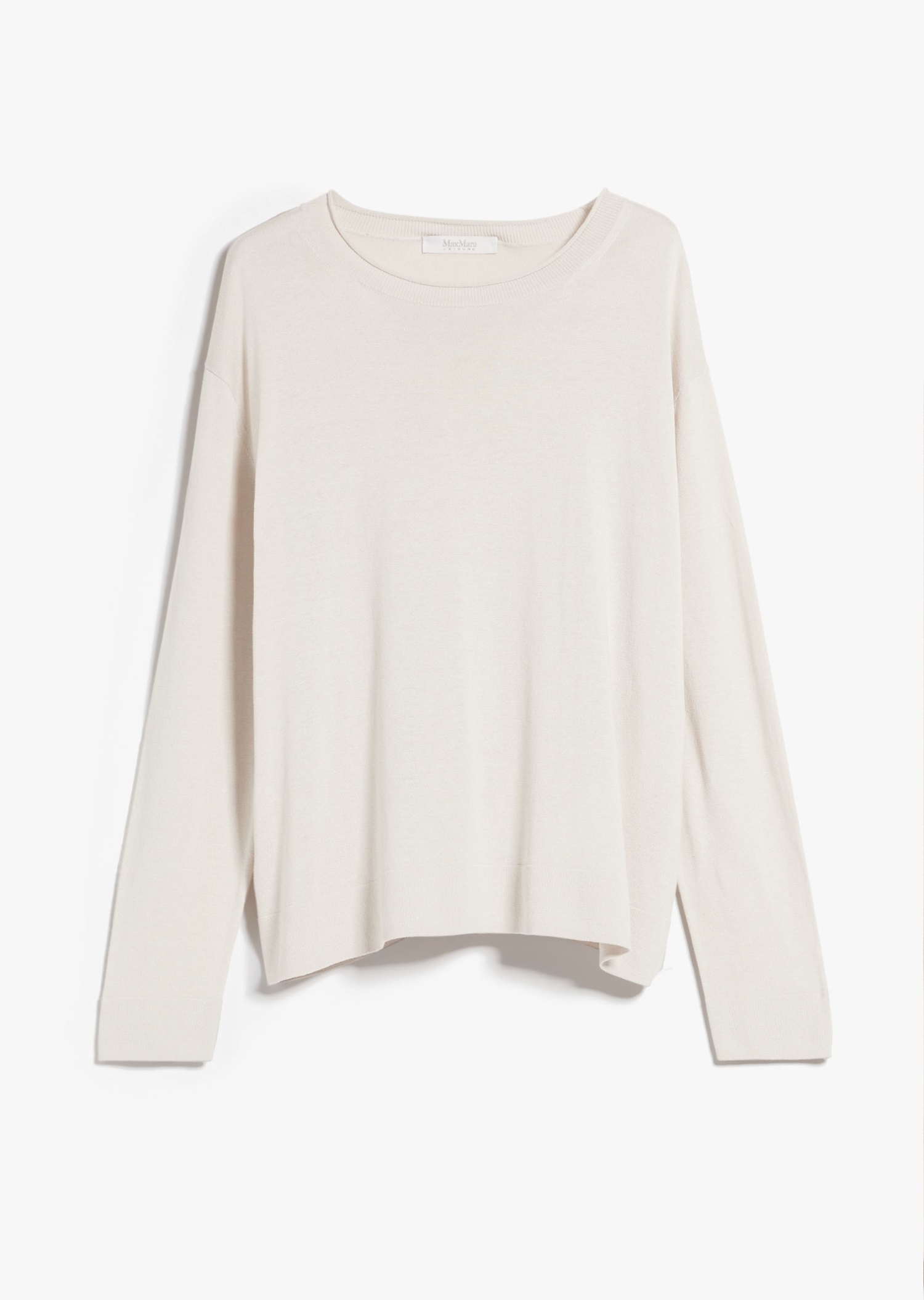 Трикотажний светр з тонкої шовкової та бавовняної пряжі з вирізом у вигляді човника та довгими низькими рукавами. Прикрашений контрастним подолом і манжетами простого трикотажу.
