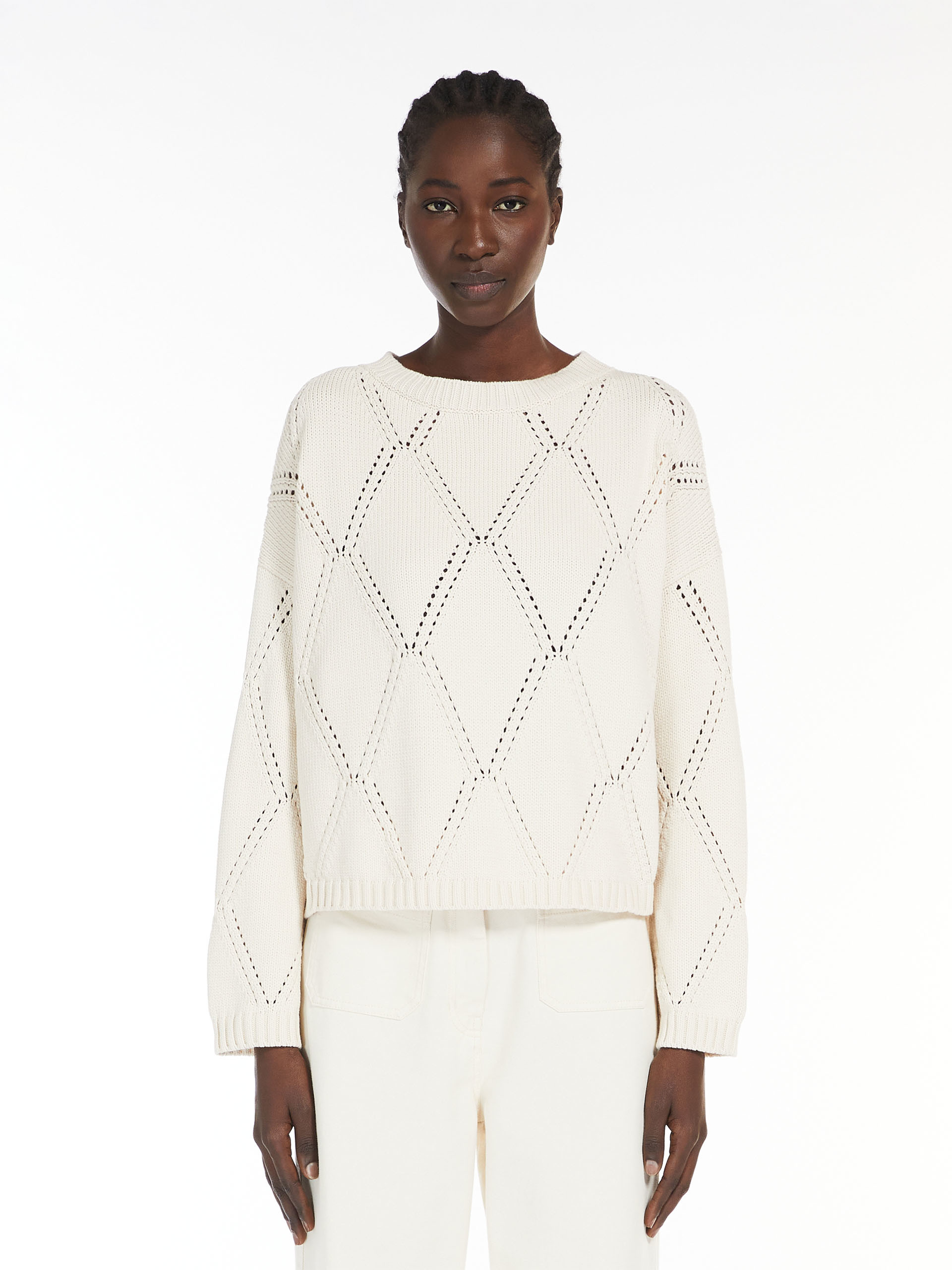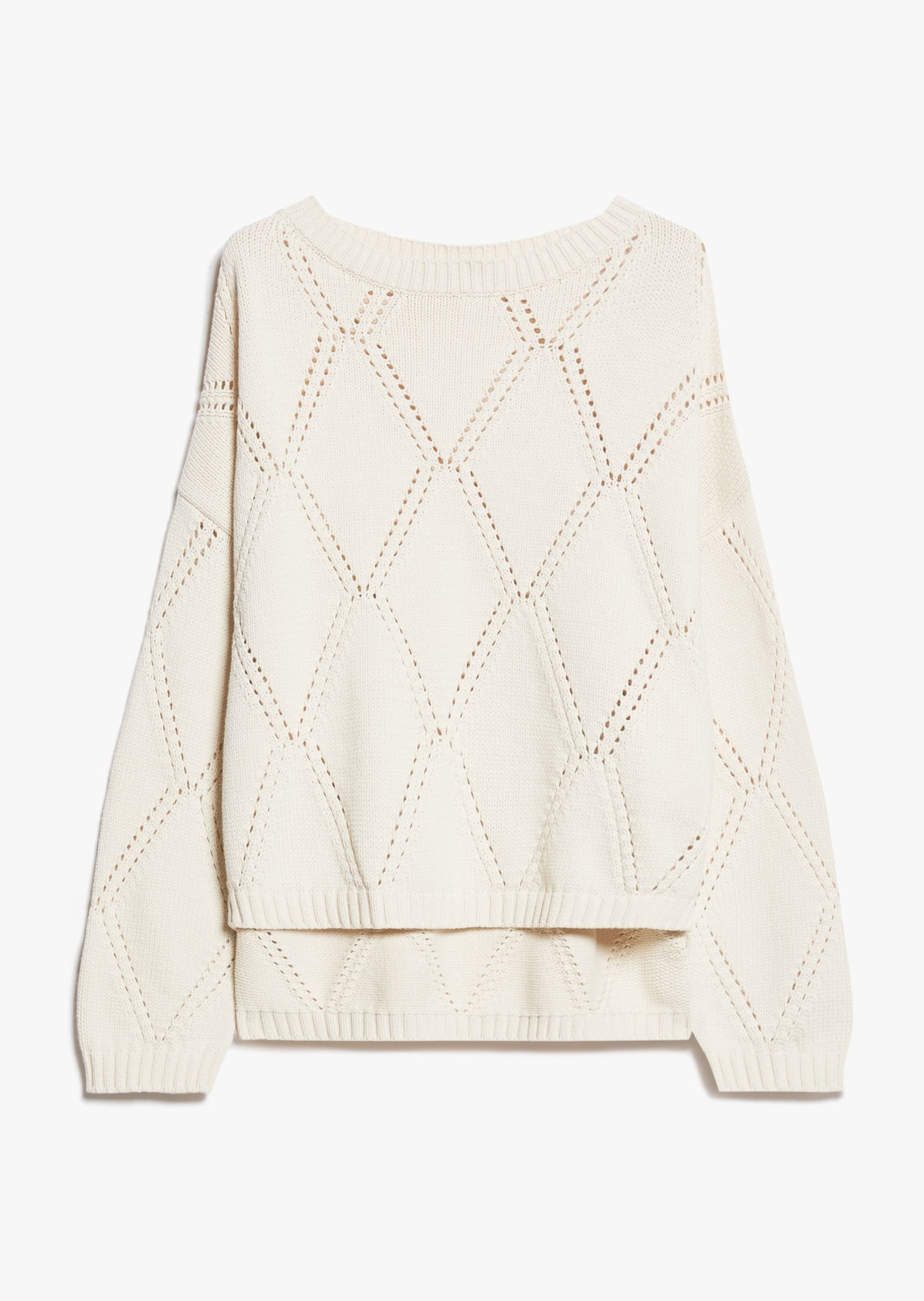 Джемпер вільного крою, з круглим вирізом, виготовлений з бавовняної пряжі. Модель має довгі втачні рукави та асиметричний дизайн.