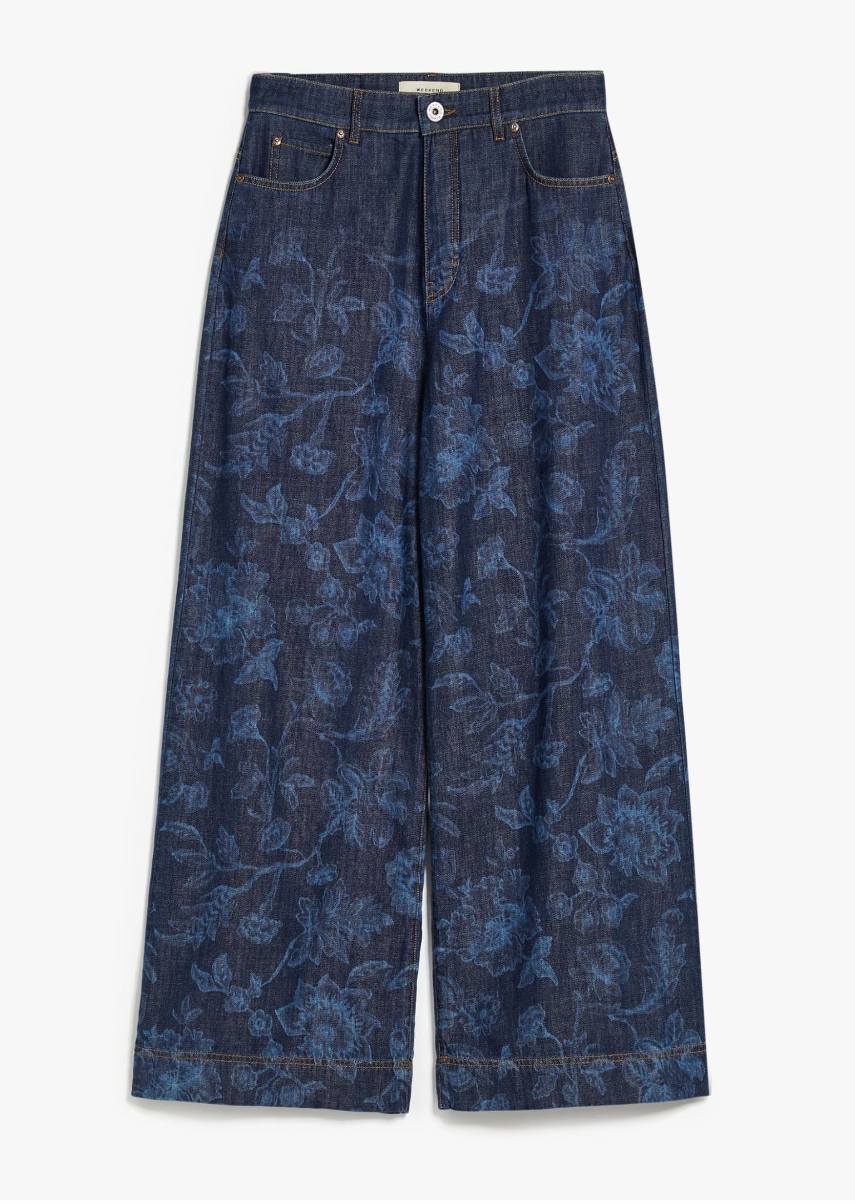 Джинси з 5 кишенями з легкої бавовняної джинсової тканини з широким силуетом. Тканина була оброблена лазерним покриттям, що створює тонкий ефект квіткового дизайну. Застібка-блискавка та ґудзик-прихват.