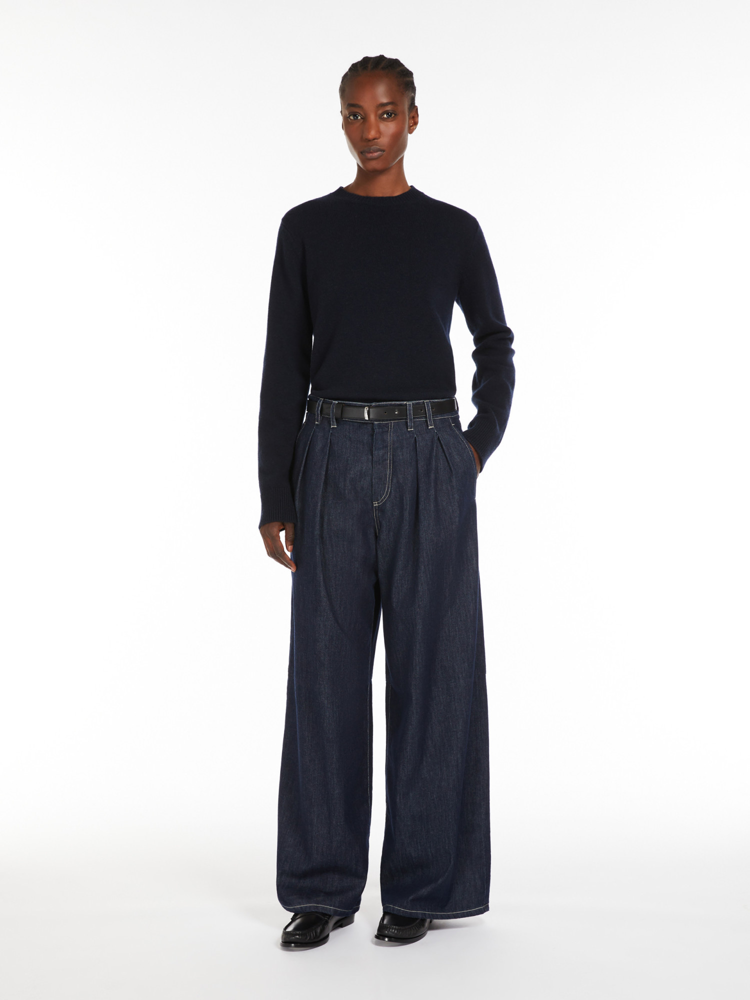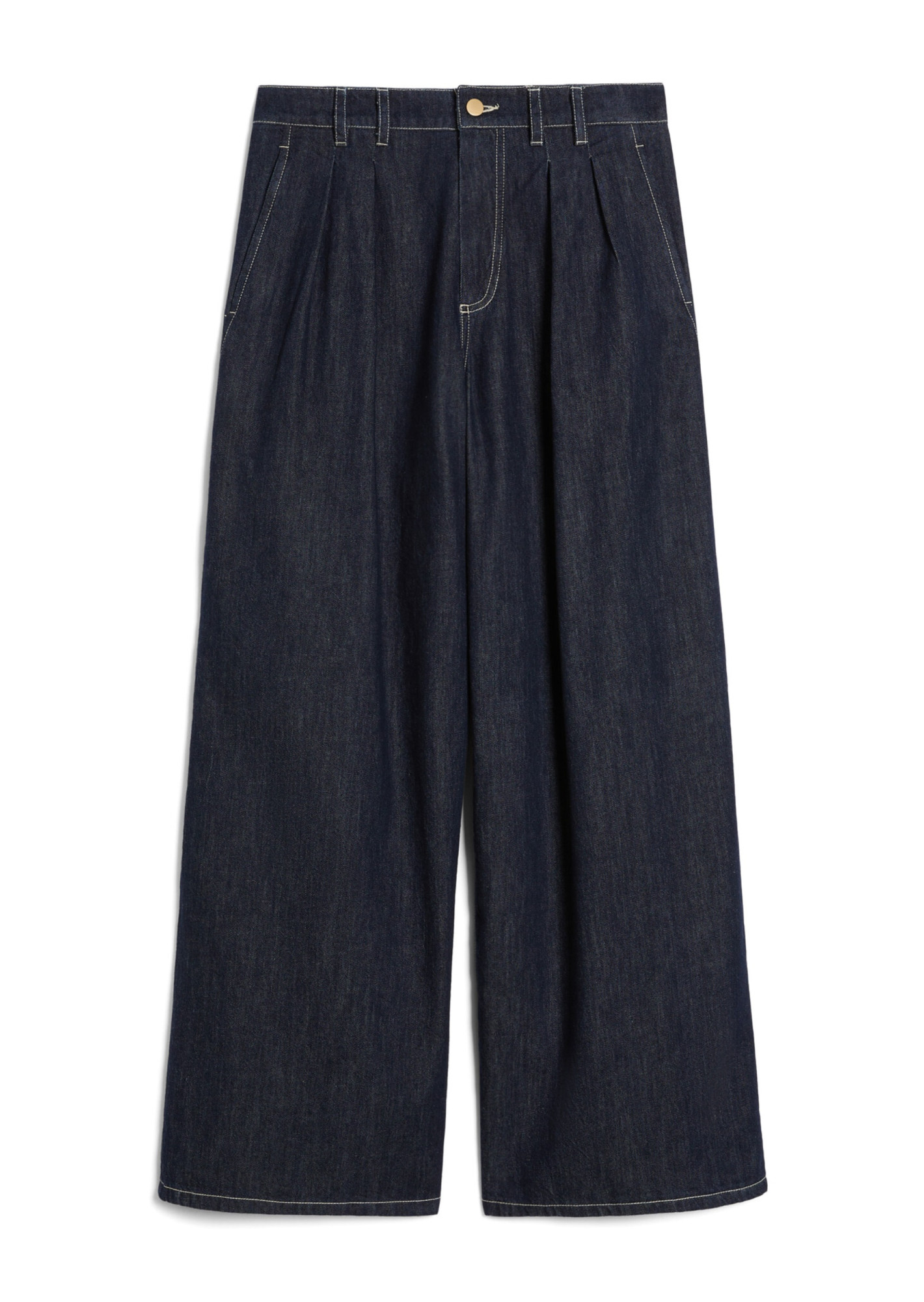 Широкі штани, виконані з бавовни та джинсової тканини. Модель із широкими штанинами має подвійну виточку на талії спереду, косі бічні кишені та накладні задні кишені. Виріб прикрашений контрастною строчкою, горизонтальною виточкою на задній частині штанин, петлями для ременя та фірмовою биркою ззаду на талії. Модель із застібкою-блискавкою та фірмовим металевим гудзиком.