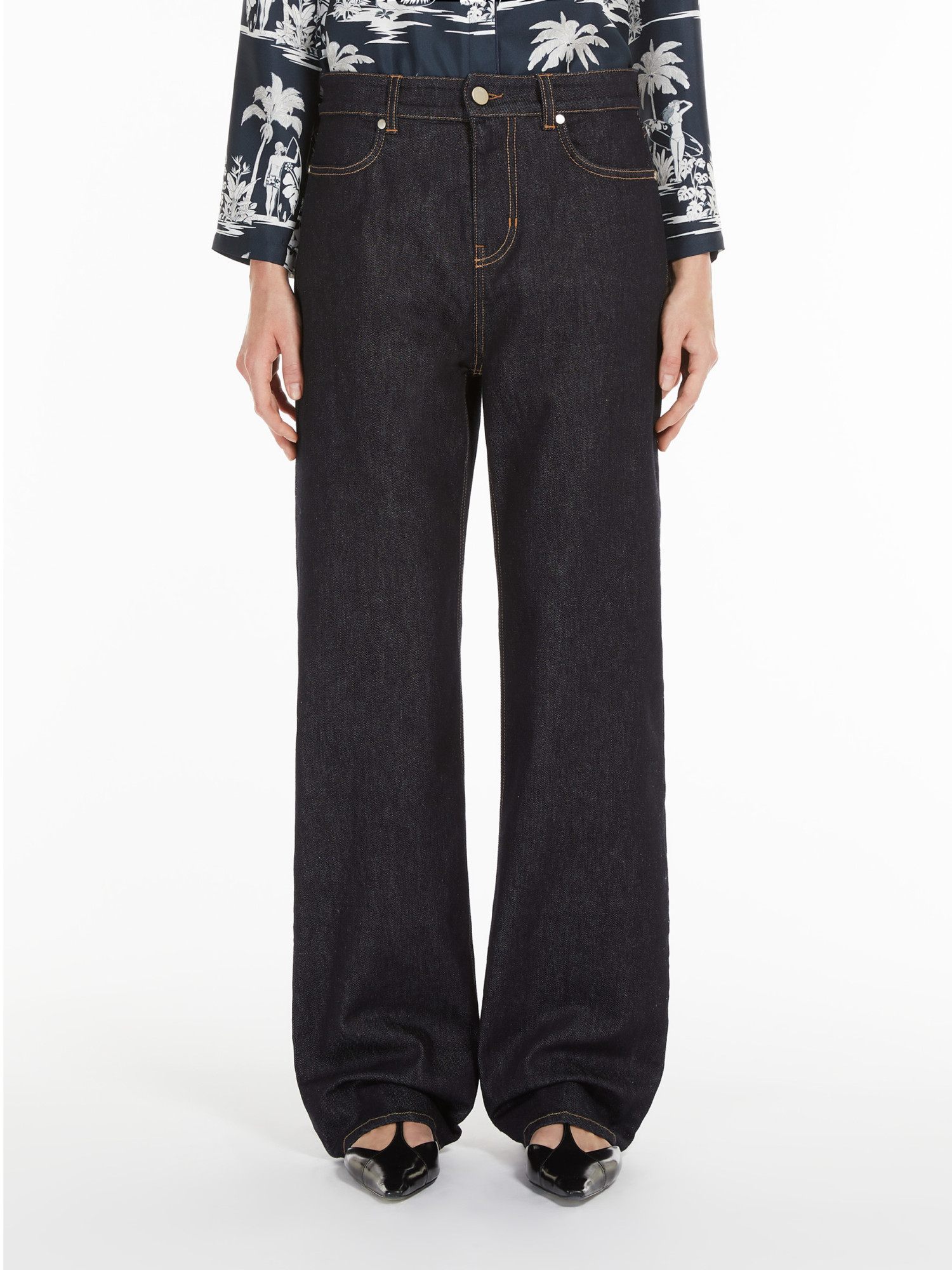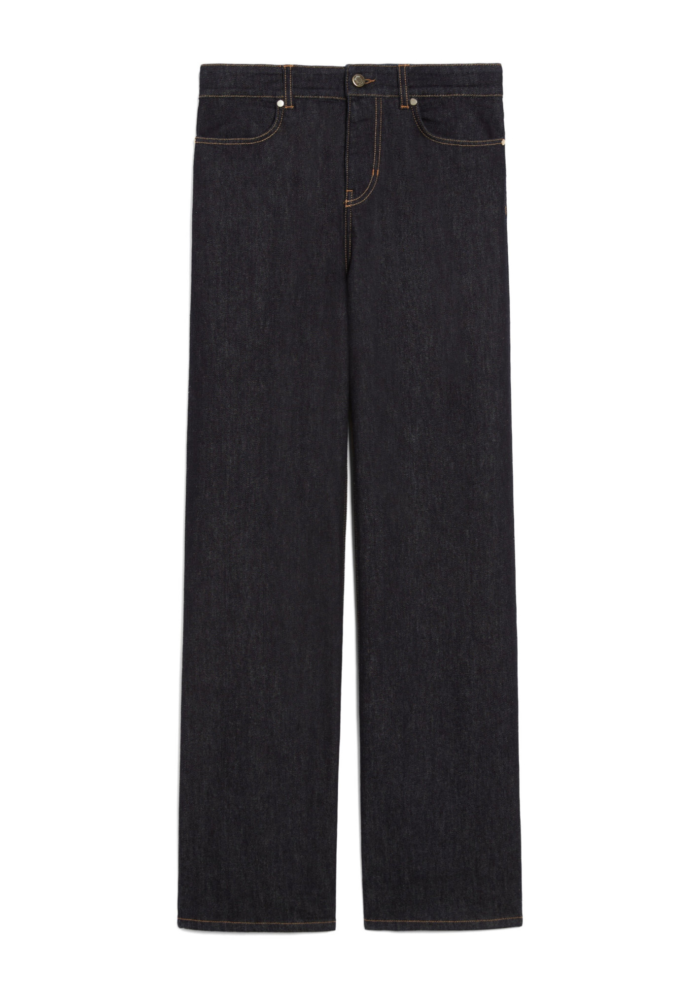 Джинси з пятьма кишенями з еластичного бавовняного деніму, прямого силуету та накладними кишенями ззаду. Виріб із контрастним коричневим рядком, металевими заклепками та етикеткою на талії ззаду. Модель застібається на потайну блискавку та ґудзик. Зручні та стильні штани, які не втрачають актуальність, - прекрасна основа для створення образів в різних комбінаціях.