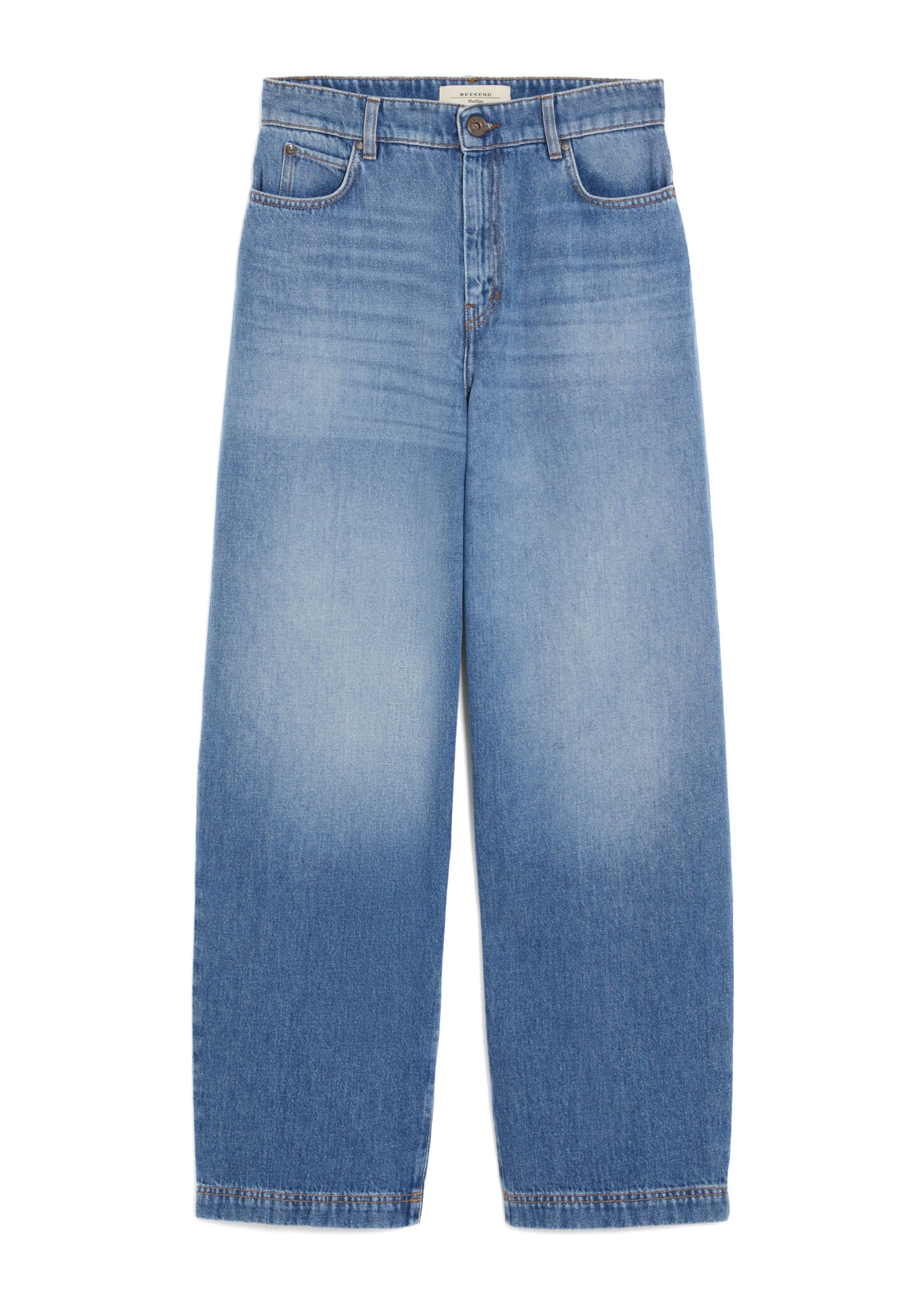 Штани із натуральної бавовняної джинсової тканини. Модель з пятьма кишенями вирізняється вільним кроєм, що злегка звужується до низу, а також петлями для ременя на талії, металевими заклепками та биркою з логотипом-метеликом на подолі ззаду. Застібаються на блискавку та ґудзик. Стильна та комфортна модель.