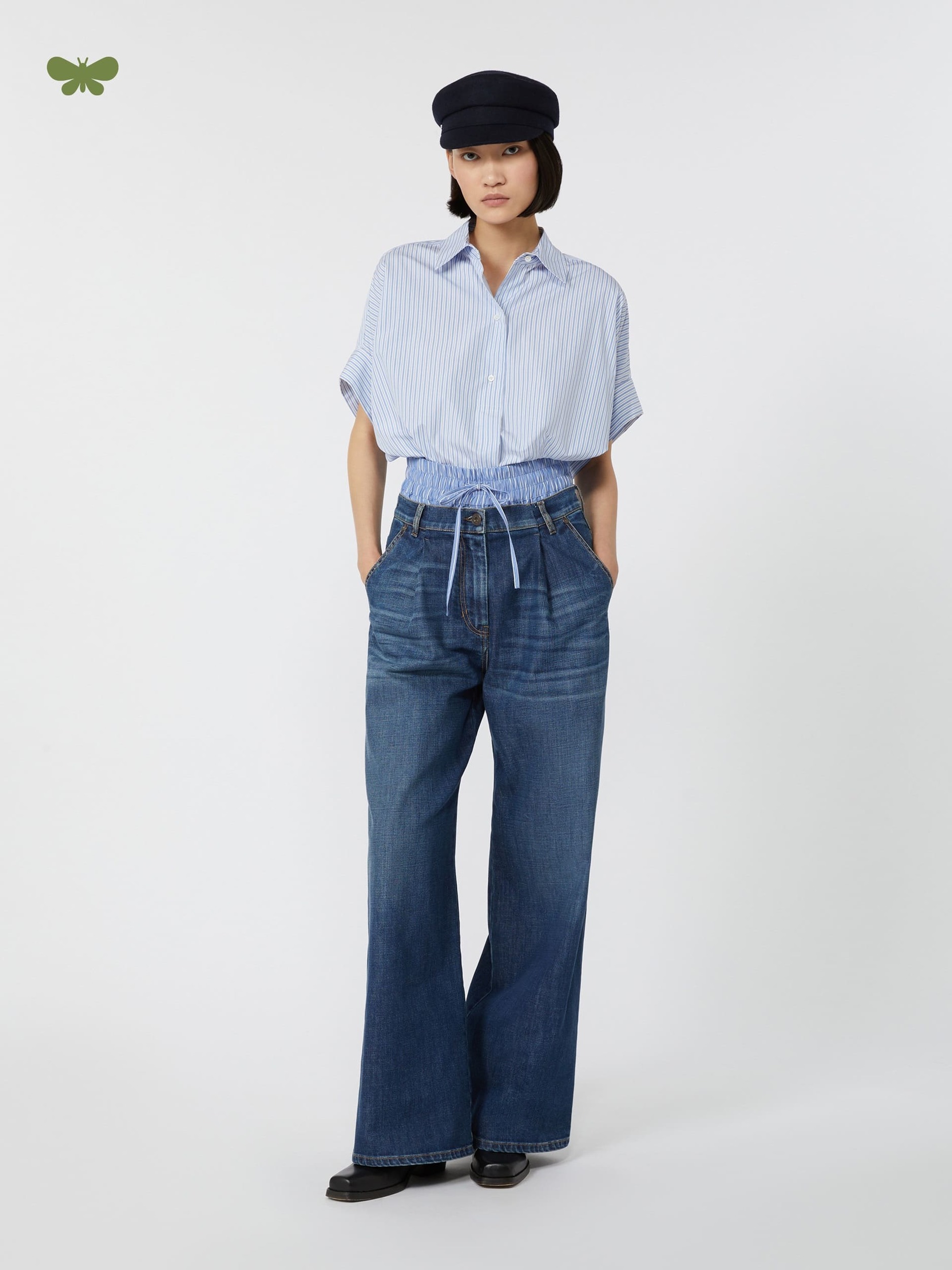 Прямі джинси Weekend Max Mara з еластичного деніму з вмістом органічної бавовни. Вільний крій із м’якими защипами спереду формує розслаблений силует і забезпечує зручну посадку. Класична застібка на блискавку і металевий ґудзик схована під планкою. Косі бічні кишені, накладні кишені ззаду та регульована патка на талії додають практичності. Насичений відтінок індиго легко поєднується з сорочками, футболками та жакетами, створюючи універсальні образи на щодень. Ці джинси поєднують комфорт, актуальний крій і преміальну якість матеріалів у стилістиці Weekend Max Mara.