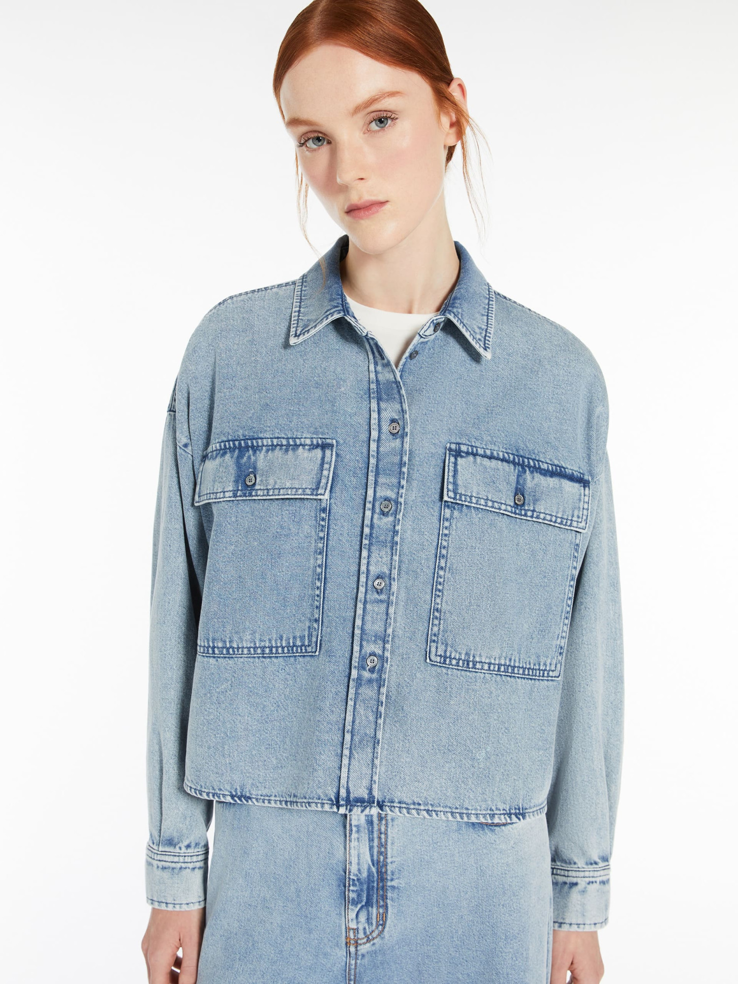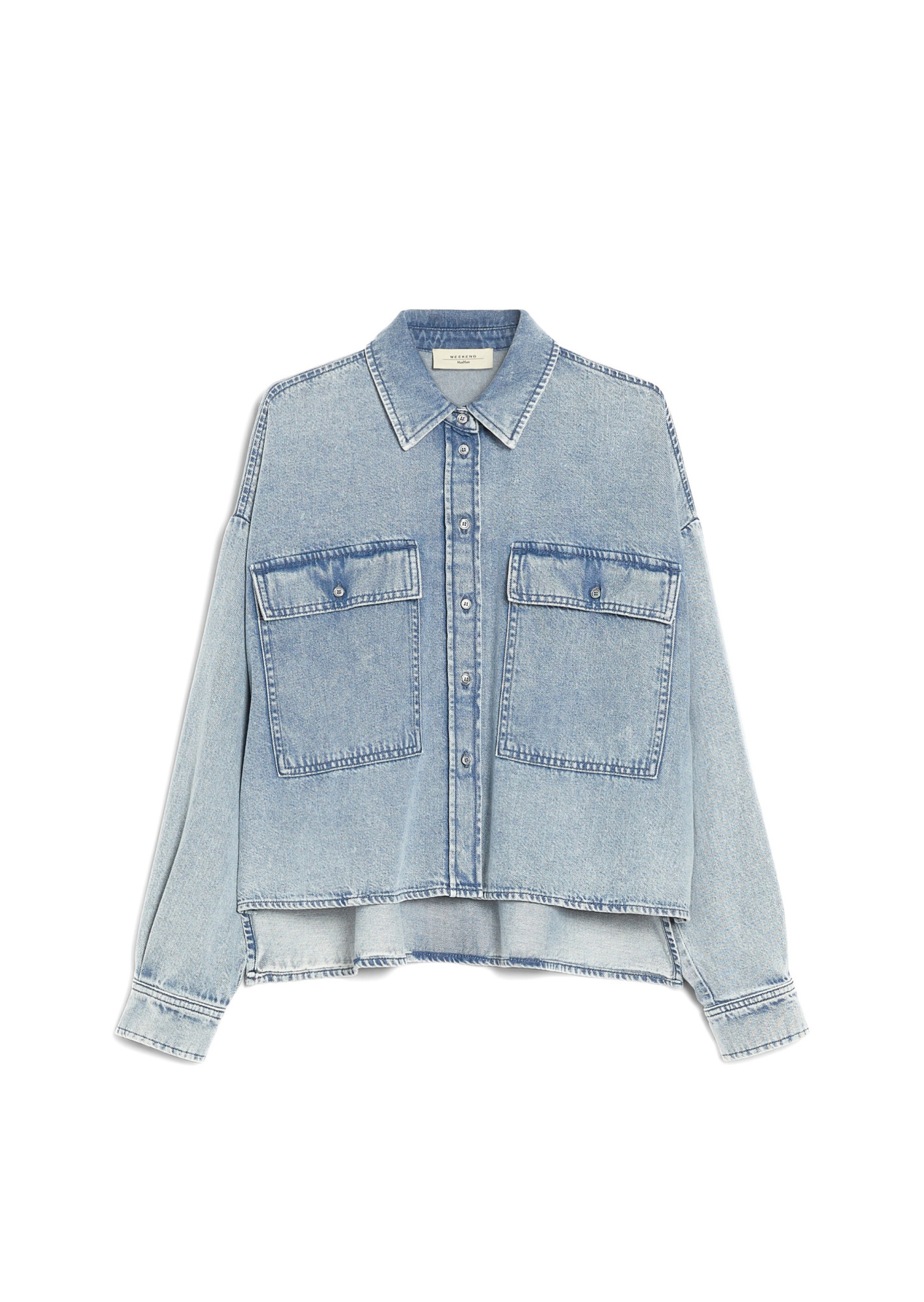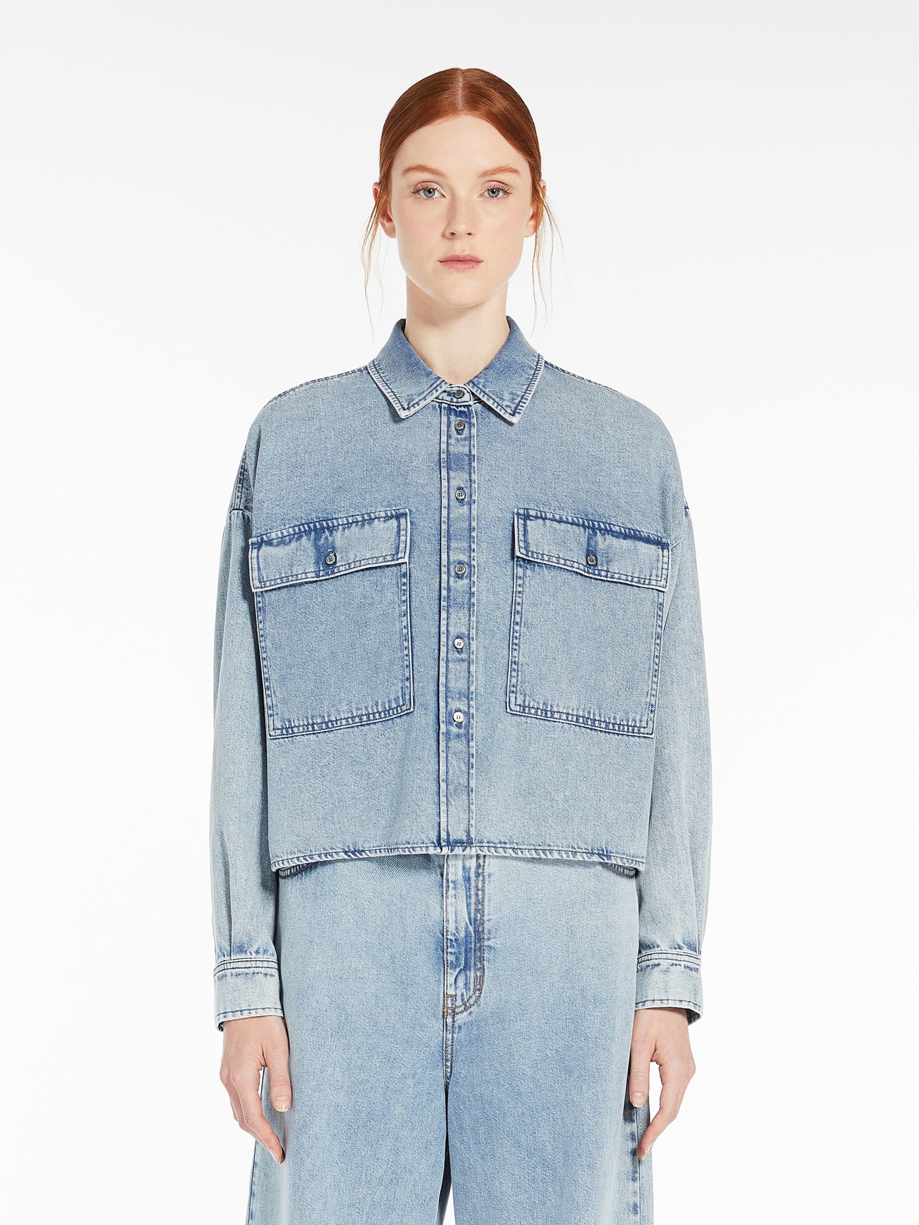 Бавовняна джинсова сорочка, мяка на дотик. Модель вільного крою відрізняється заниженою лінією плечей, класичним коміром і довгими рукавами з манжетами на ґудзиках. На грудях великі накладні кишені із клапанами.