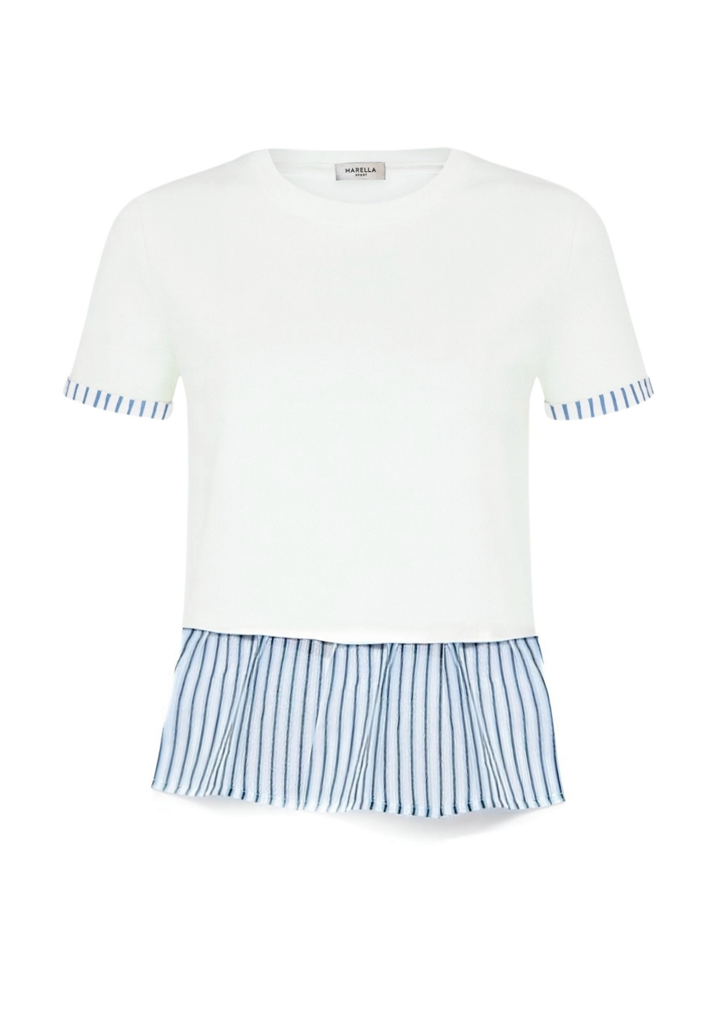 Футболка круглим вирізом виготовлена із бавовни. Виріб вирізняється поєднанням білої тканини із матеріалом у синю смужку. Модель підкреслить неординарний образ.