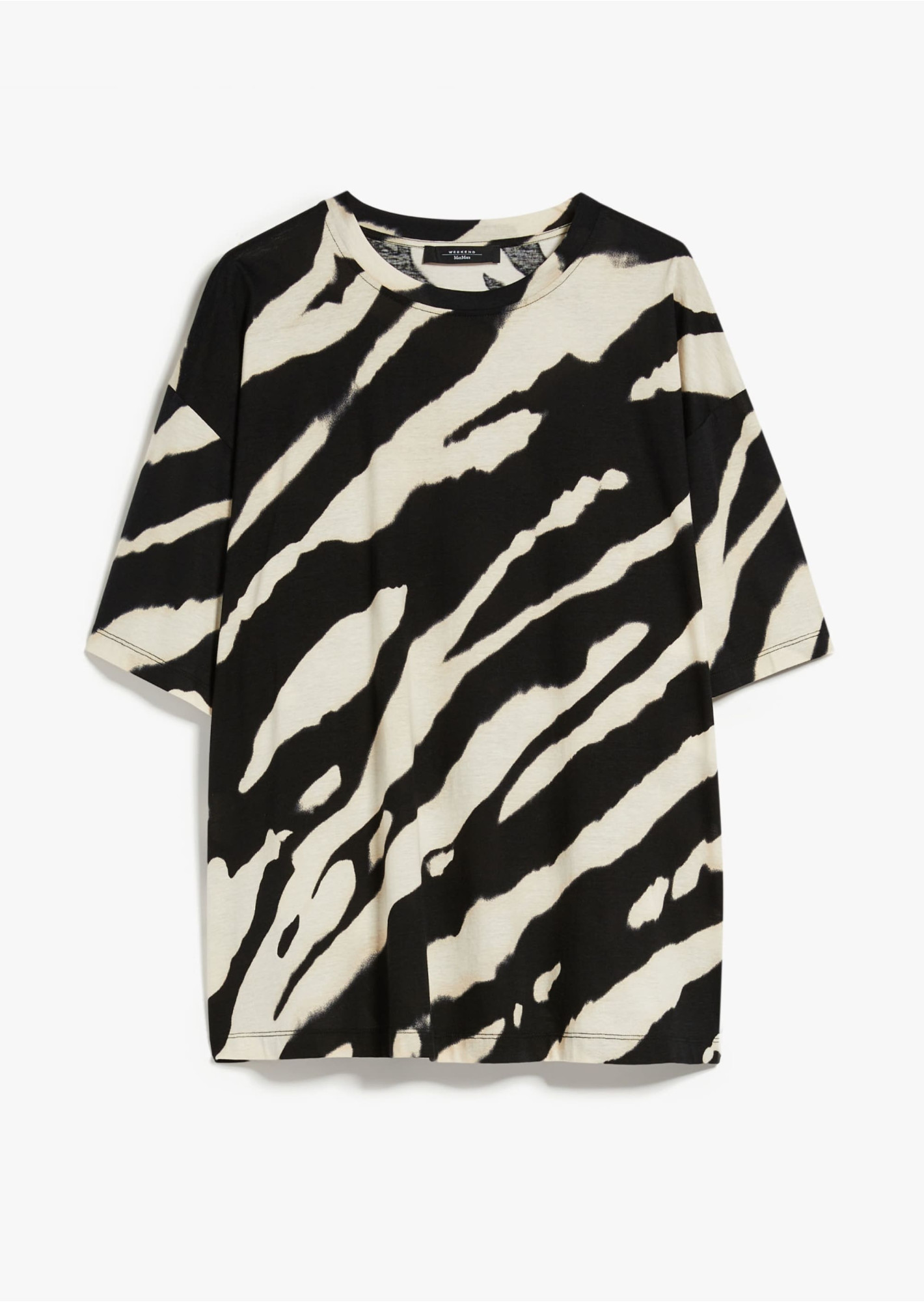 Мяка бавовняна футболка з принтом. Модель оверсайз має спущені плечі, короткі рукави та круглу горловину.