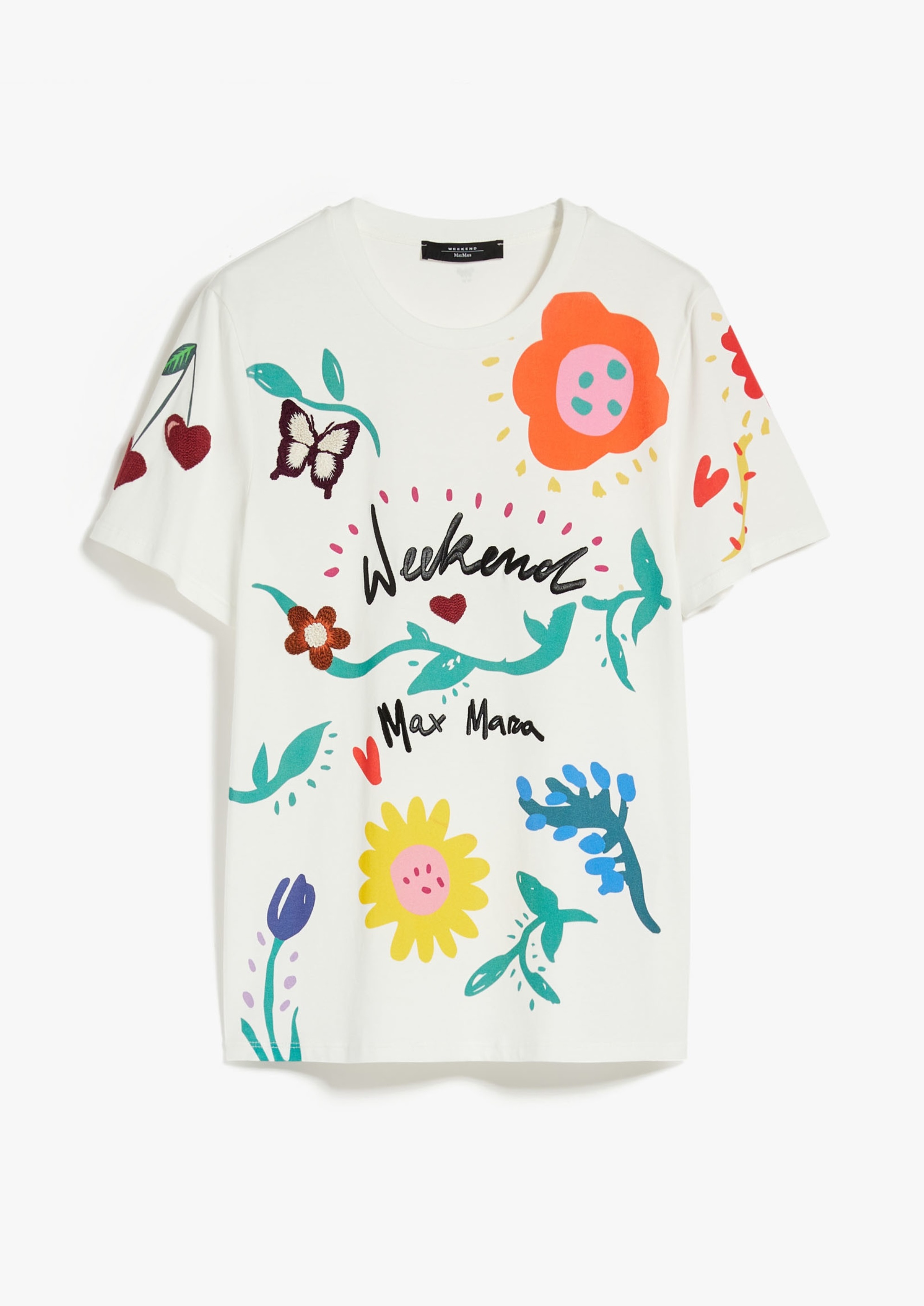 Футболка з короткими рукавами з мякого бавовняного трикотажу. Базова модель прямого крою має вишитий принт спереду та принт логотипу ззаду на шиї
