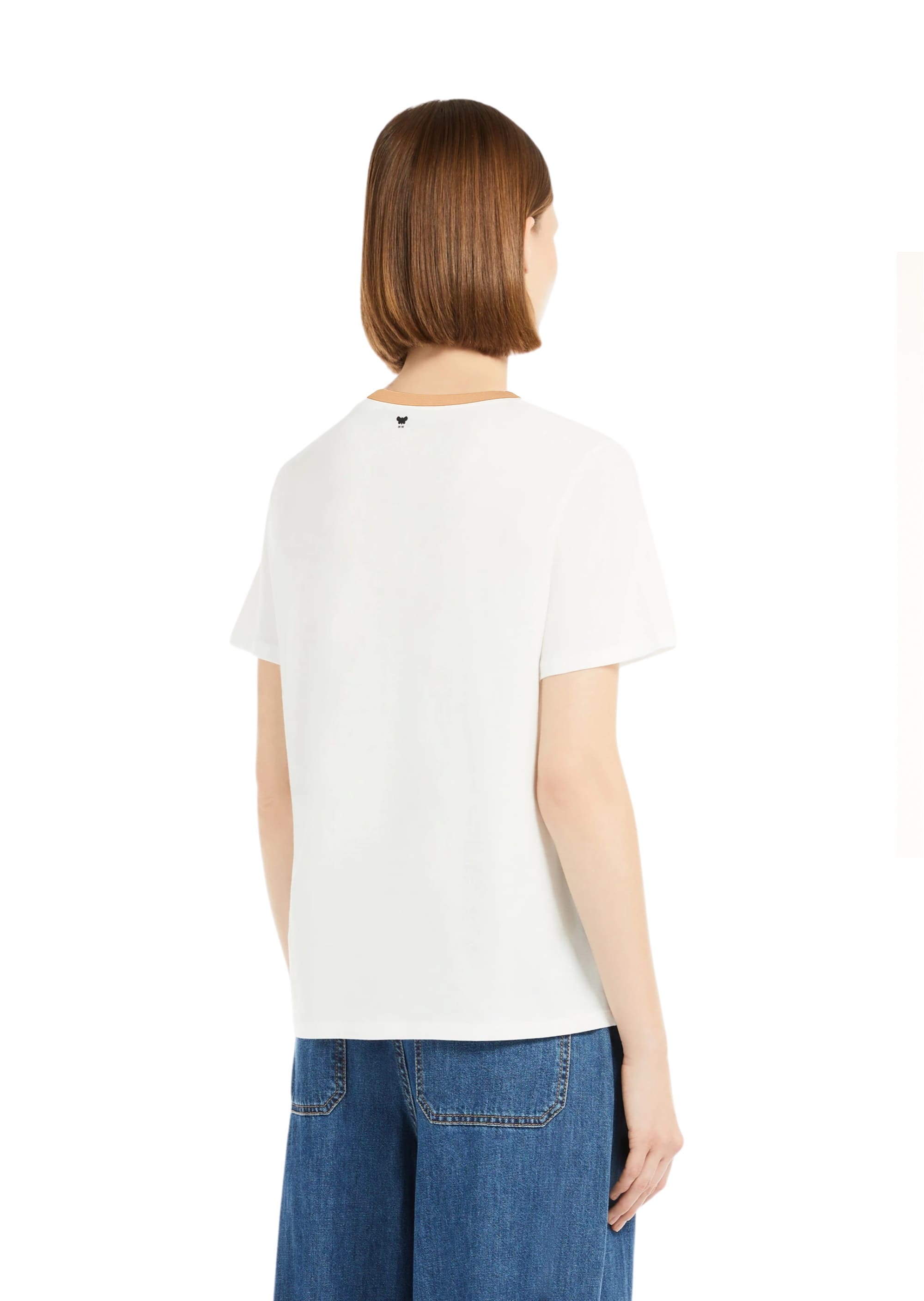 Футболка виконана з мякої трикотажної тканини з чистої бавовни. Модель прямого крою, з короткими рукавами та круглим вирізом, доповнена вишитим принтом спереду та логотипом у вигляді метелика ззаду.