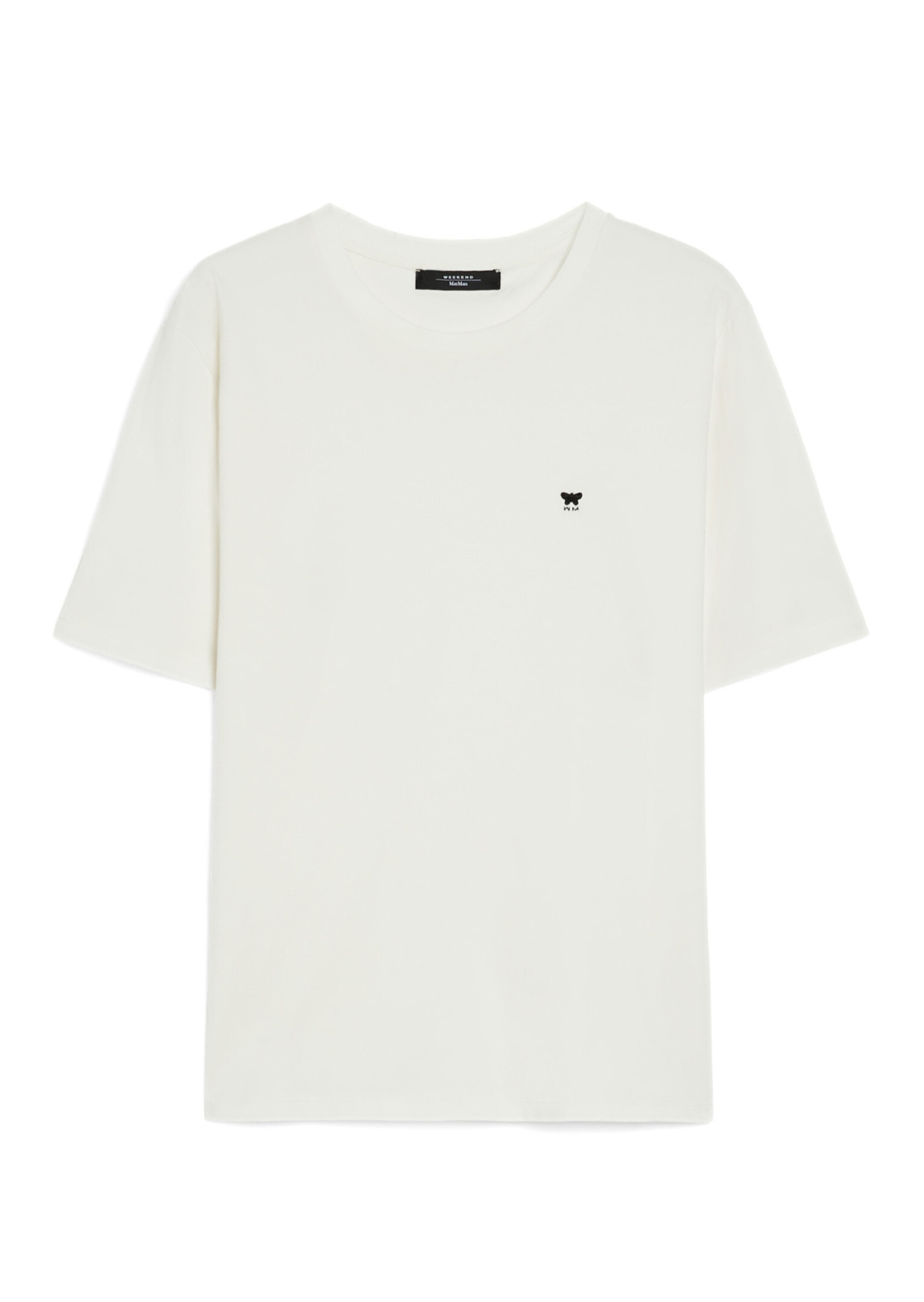 Футболка з мякого бавовняного трикотажу прямого силуету з круглим вирізом та короткими рукавами. Доповнена невеликими бічними розрізами внизу та вишитим логотипом-метеликом на грудях.