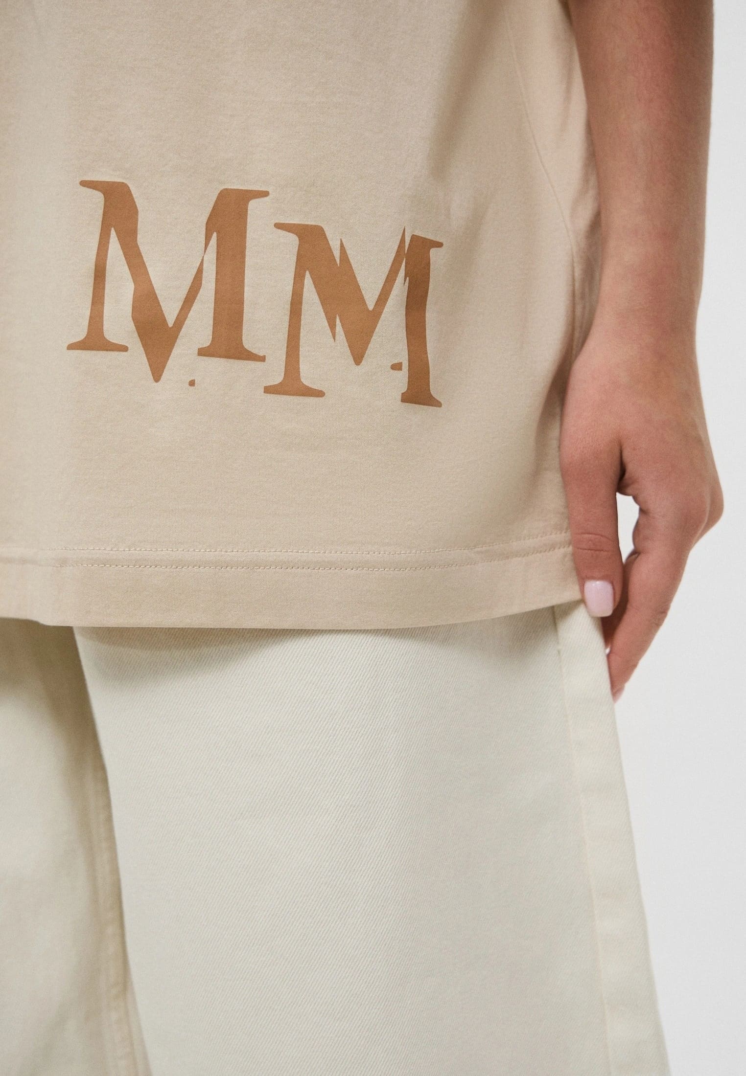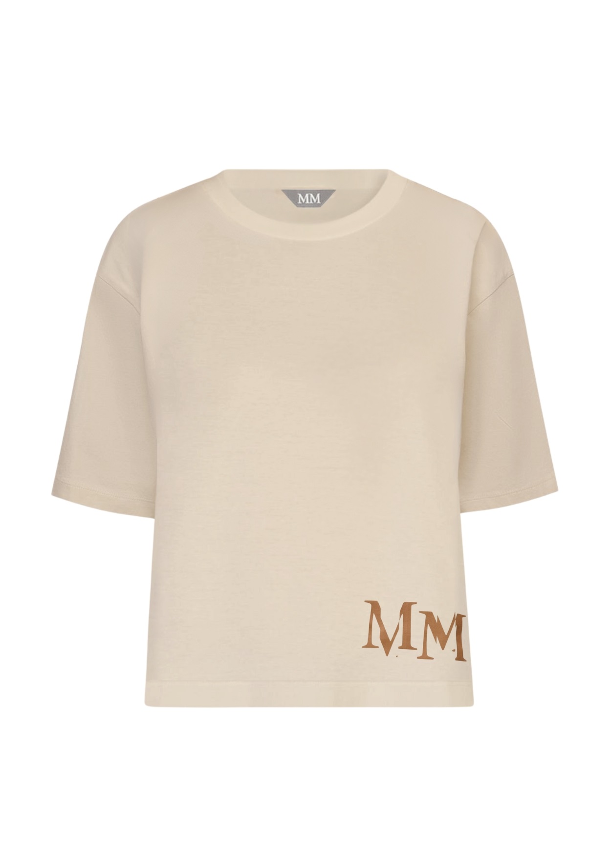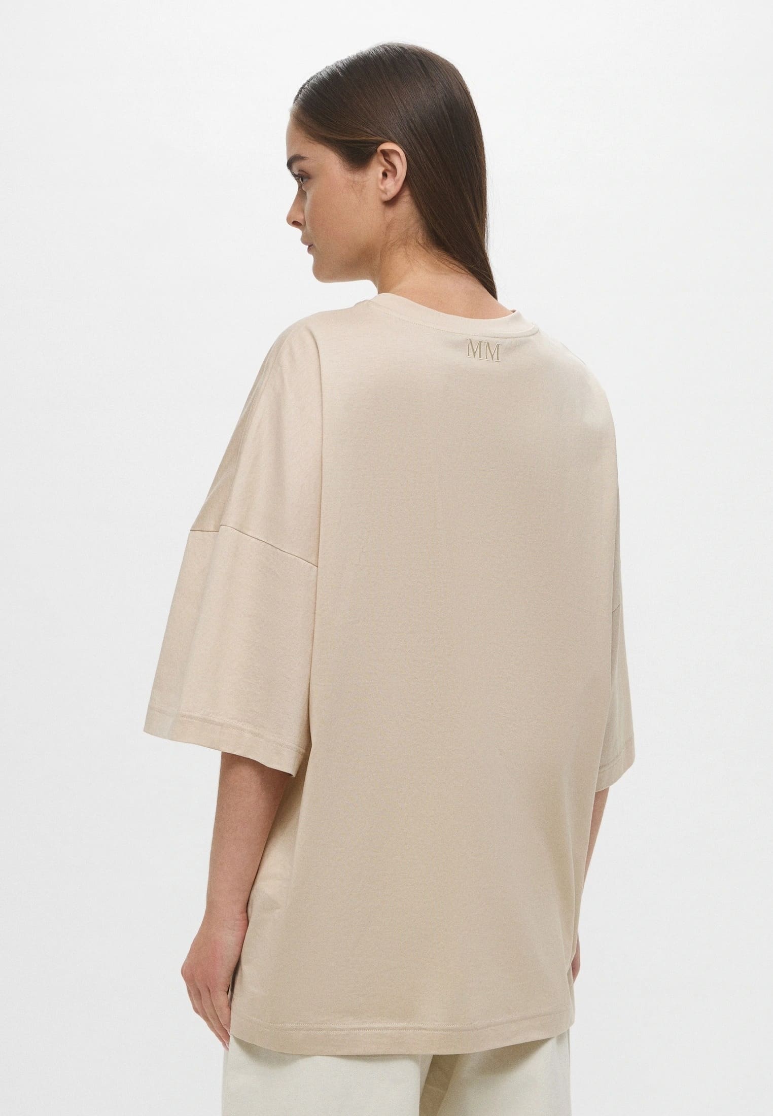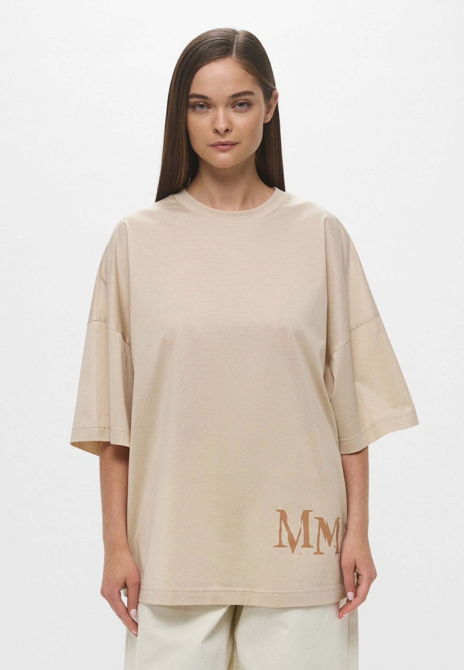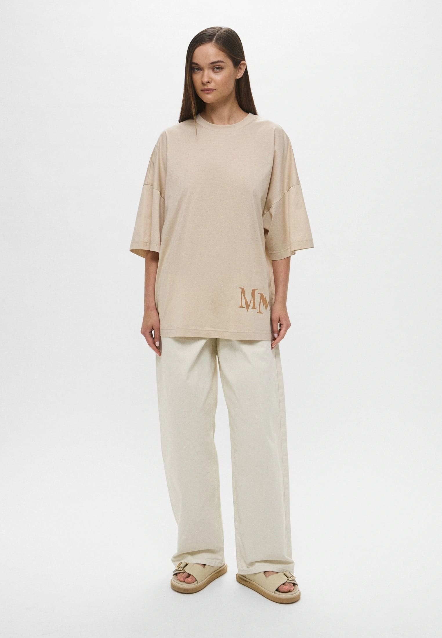 Футболка з бавовняного джерсі у бежевому відтінку. Має прямий крій, класичний круглий виріз і делікатне фірмове оздоблення на грудях. Поєднується з брюками, денімом, спідницями або жакетами у світлих або нейтральних кольорах. Базовий елемент гардероба у м’якому кольорі для повсякденного носіння або ділових образів у стилі смарт кежуал.