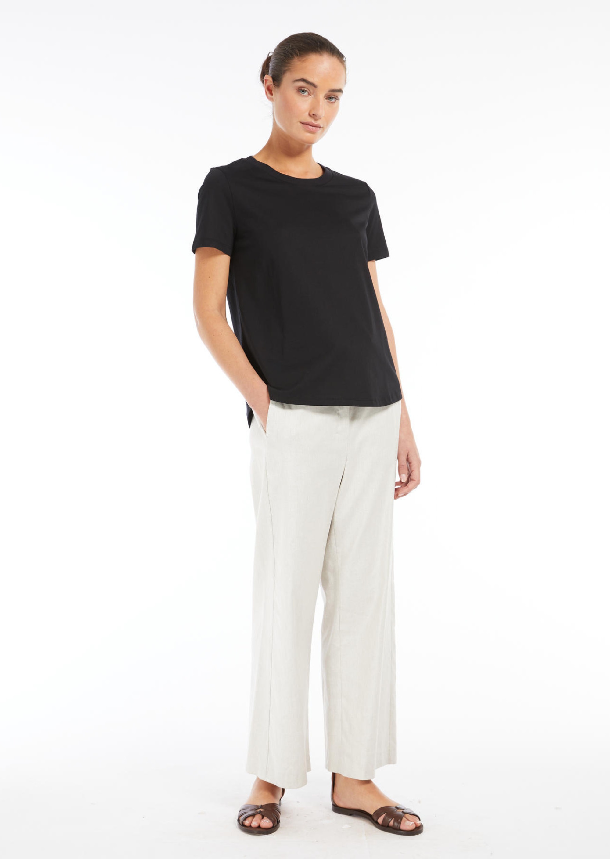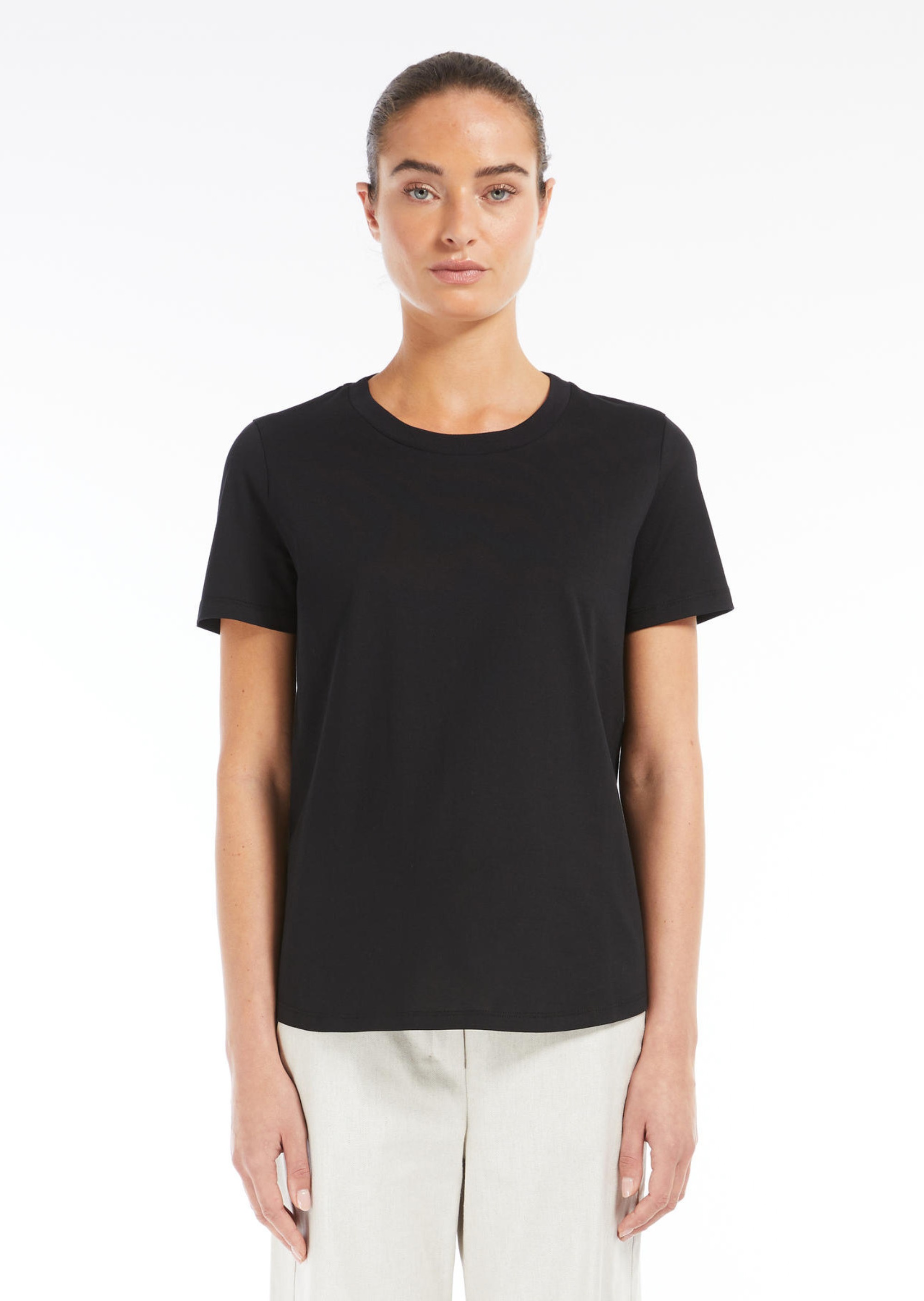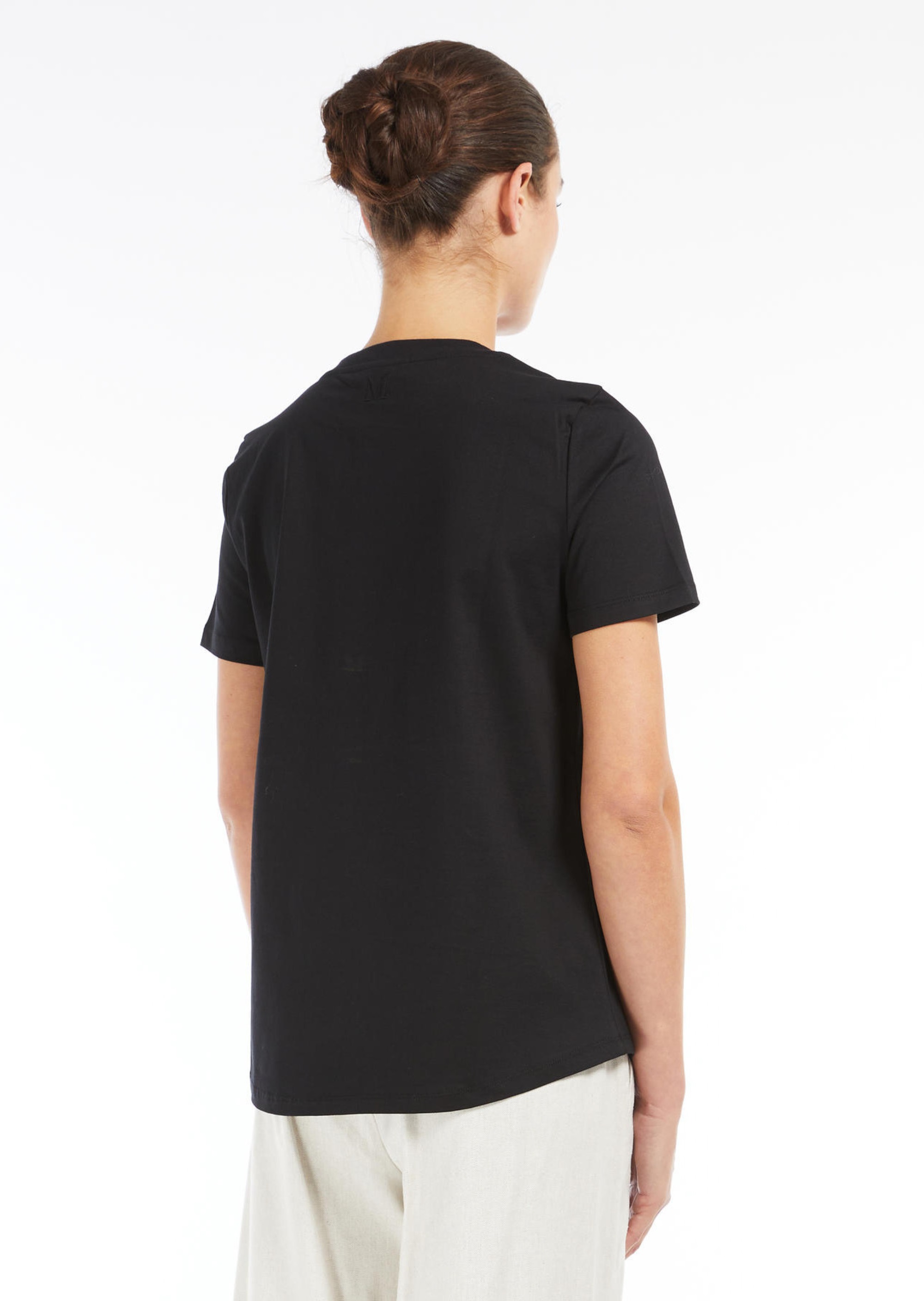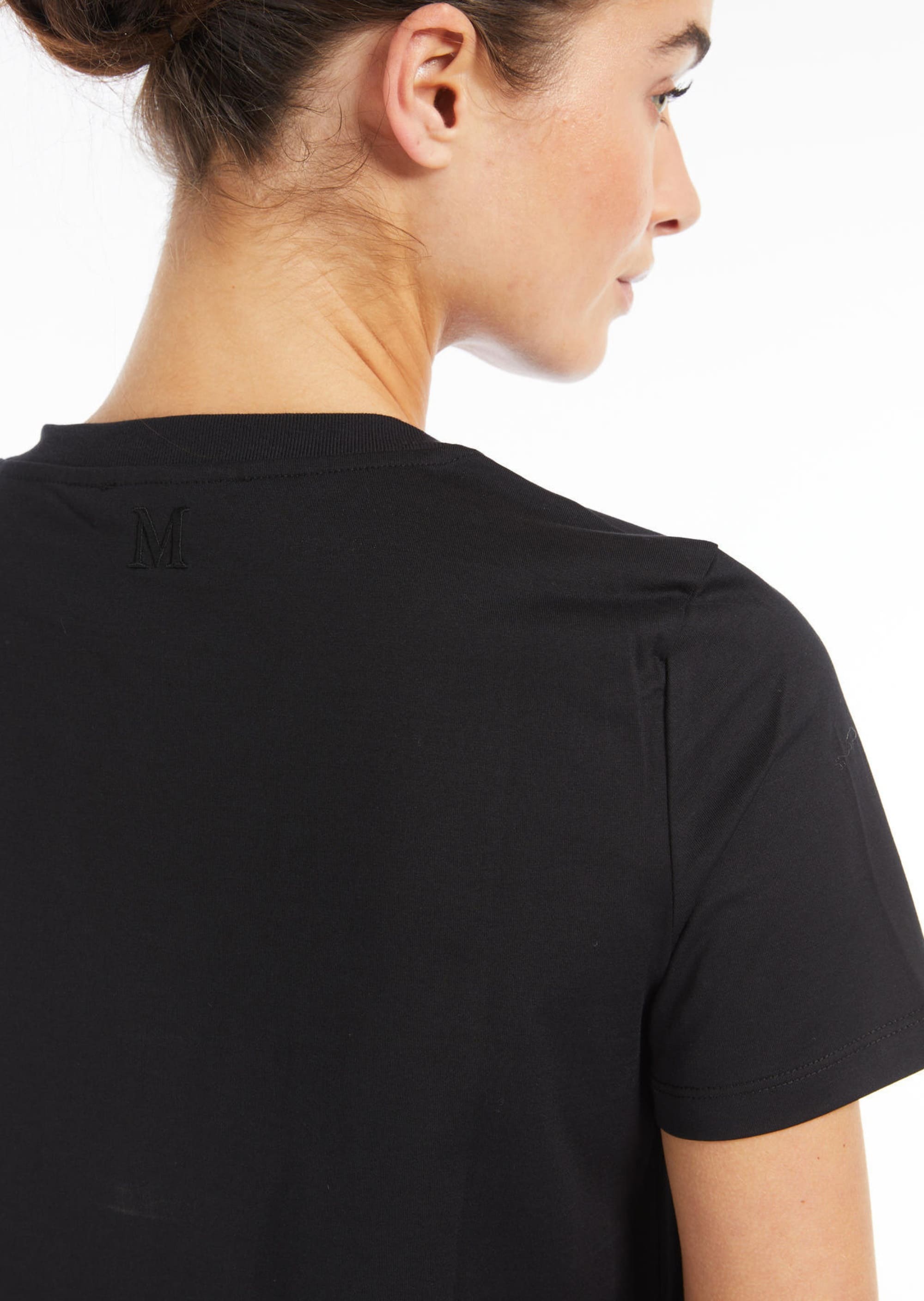 ФутболкаMax Mara S — втілення мінімалістичної елегантності. Модель виготовлена з мякого бавовняного інтерлоку, що забезпечує комфорт та зносостійкість. Чорний колiр підкреслює універсальність виробу. Дизайн включає круглий виріз, короткі рукави та прямий поділ з невеликими боковими розрізами. На спинці — фірмовий логотип Max Mara, вишитий в тон, що додає витонченого акценту. Футболка легко поєднується з джинсами, брюками або спідницями, дозволяючи створювати різноманітні образи від повсякденних до більш формальних. Футболка Max Mara S — ідеальний вибір для тих, хто цінує поєднання комфорту, якості та витонченого стилю.