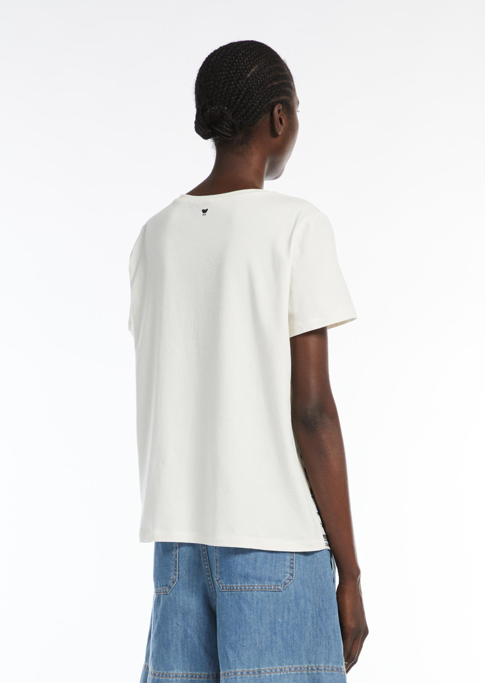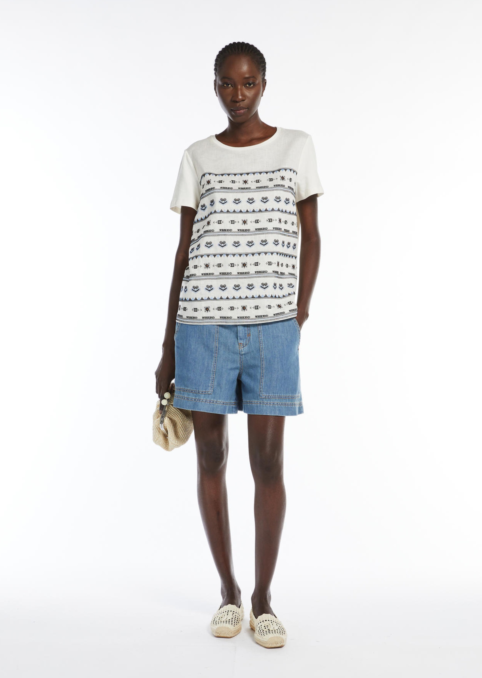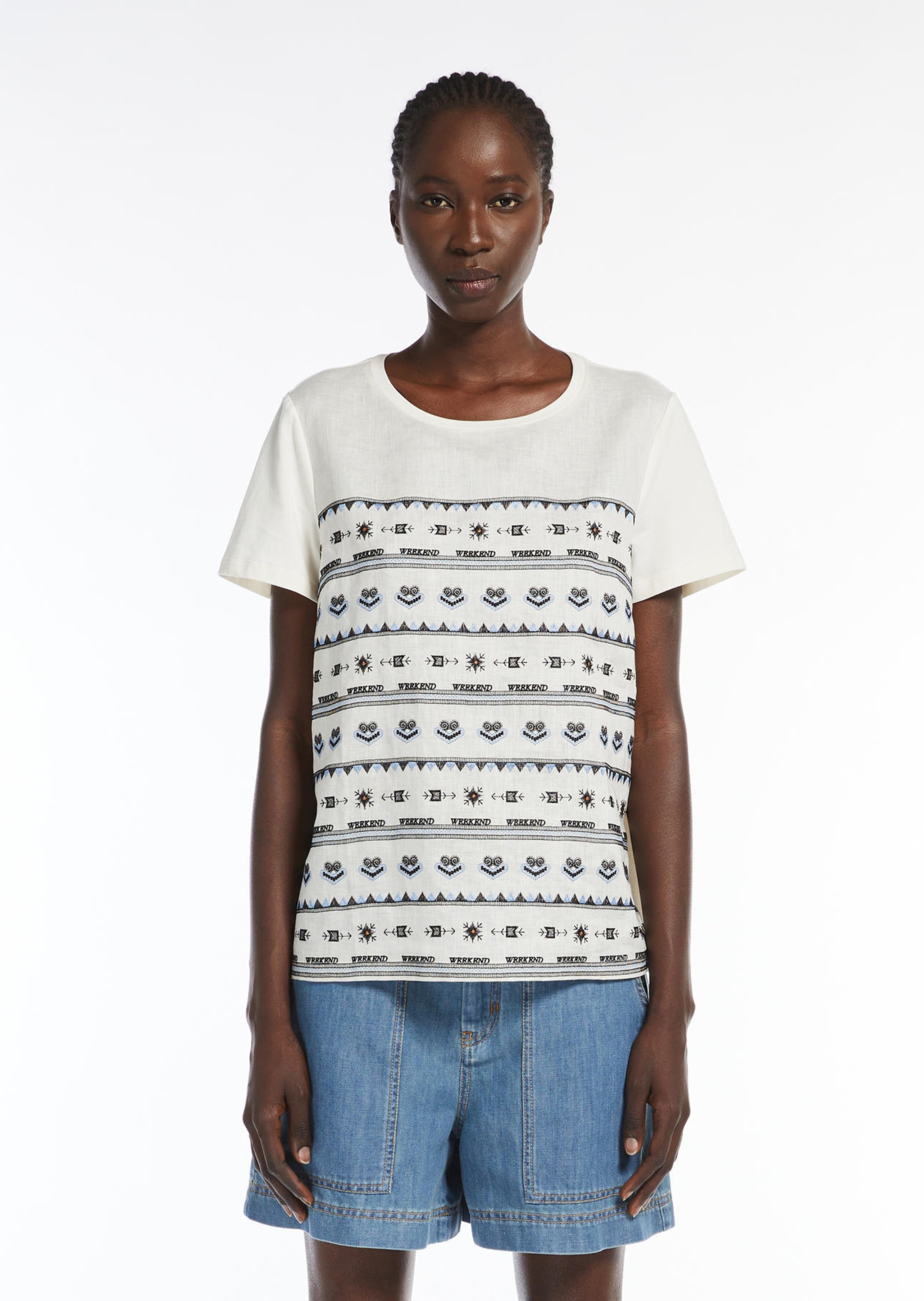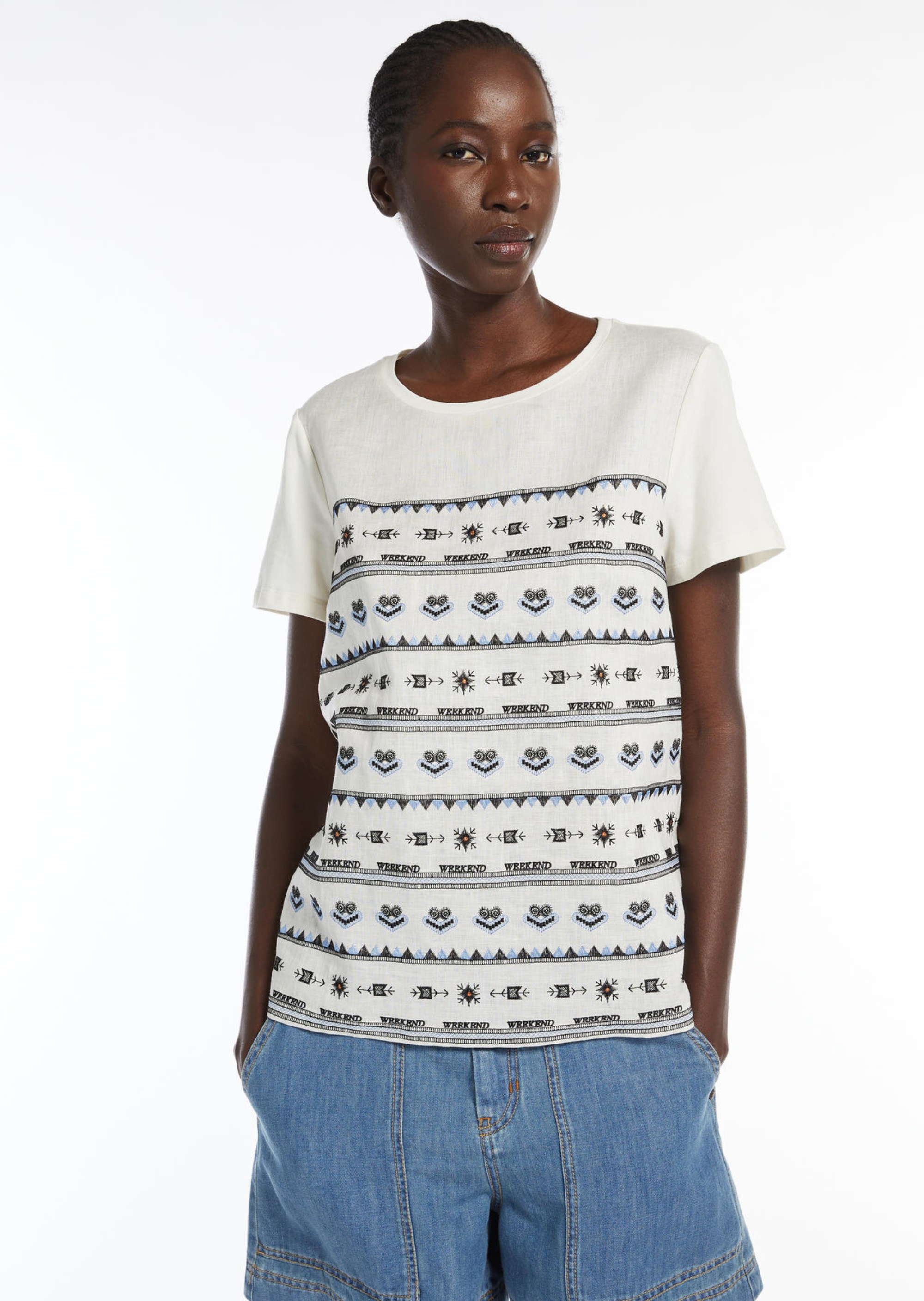 Стильна футболка від Max Mara Weekend виготовлена з льону. Модель стандартного крою та з круглим вирізом прикрашена вишивкою та логотипом бренду. Ця футболка стане чудовою основою для літніх луків. Прекрасно поєднується з будь-яким одягом.