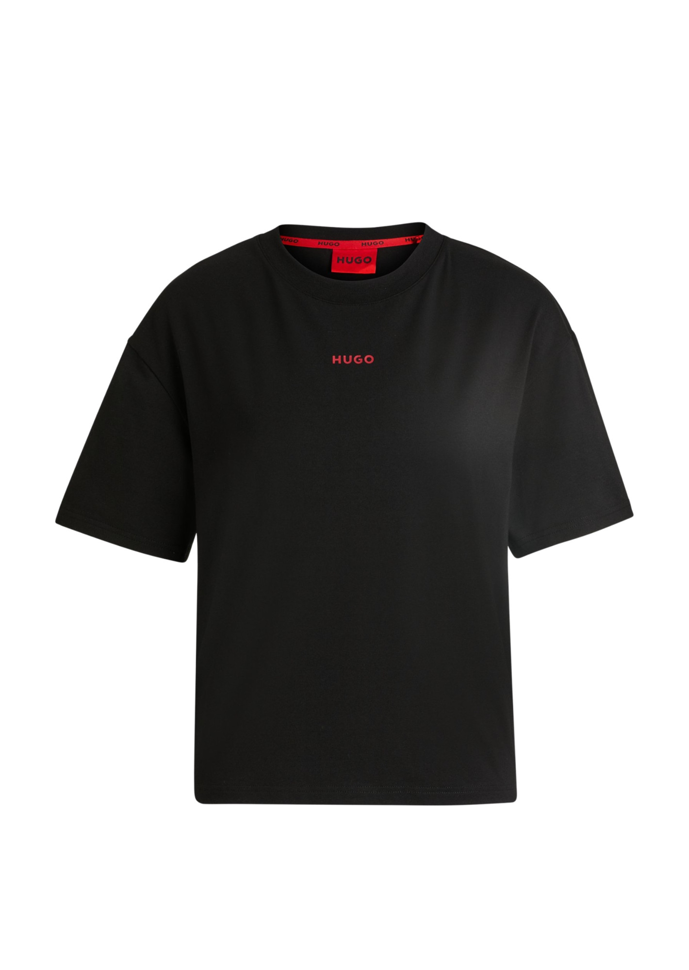 Натільна футболка від HUGO виготовлена з еластичного трикотажу чорного кольору. Модель з короткими рукавами, вільного крою прикрашена червоним логотипом бренду.