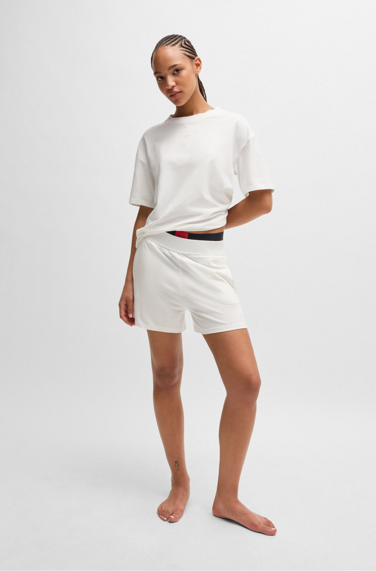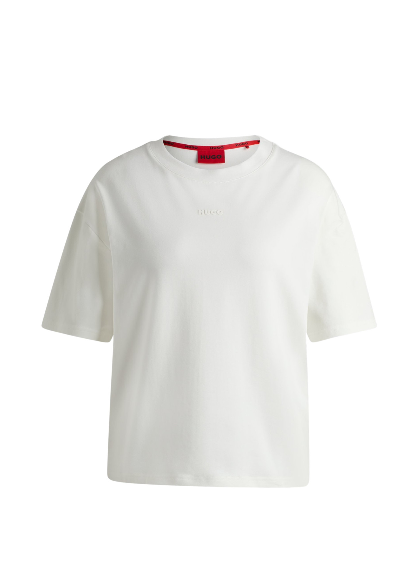 Натільна футболка від HUGO виготовлена з еластичного трикотажу білого кольору. Модель з короткими рукавами, вільного крою прикрашена логотипом бренду в тон виробу.
