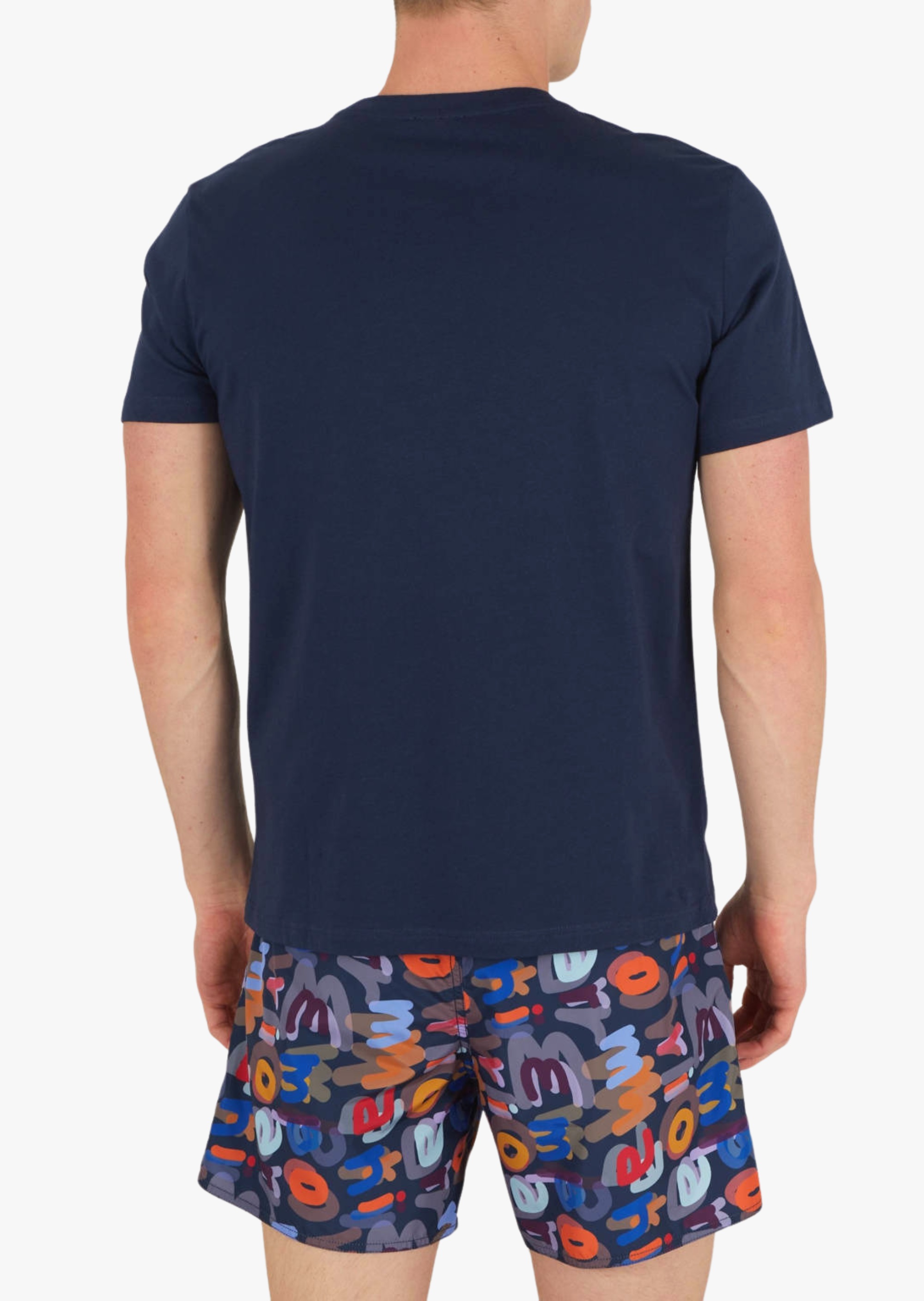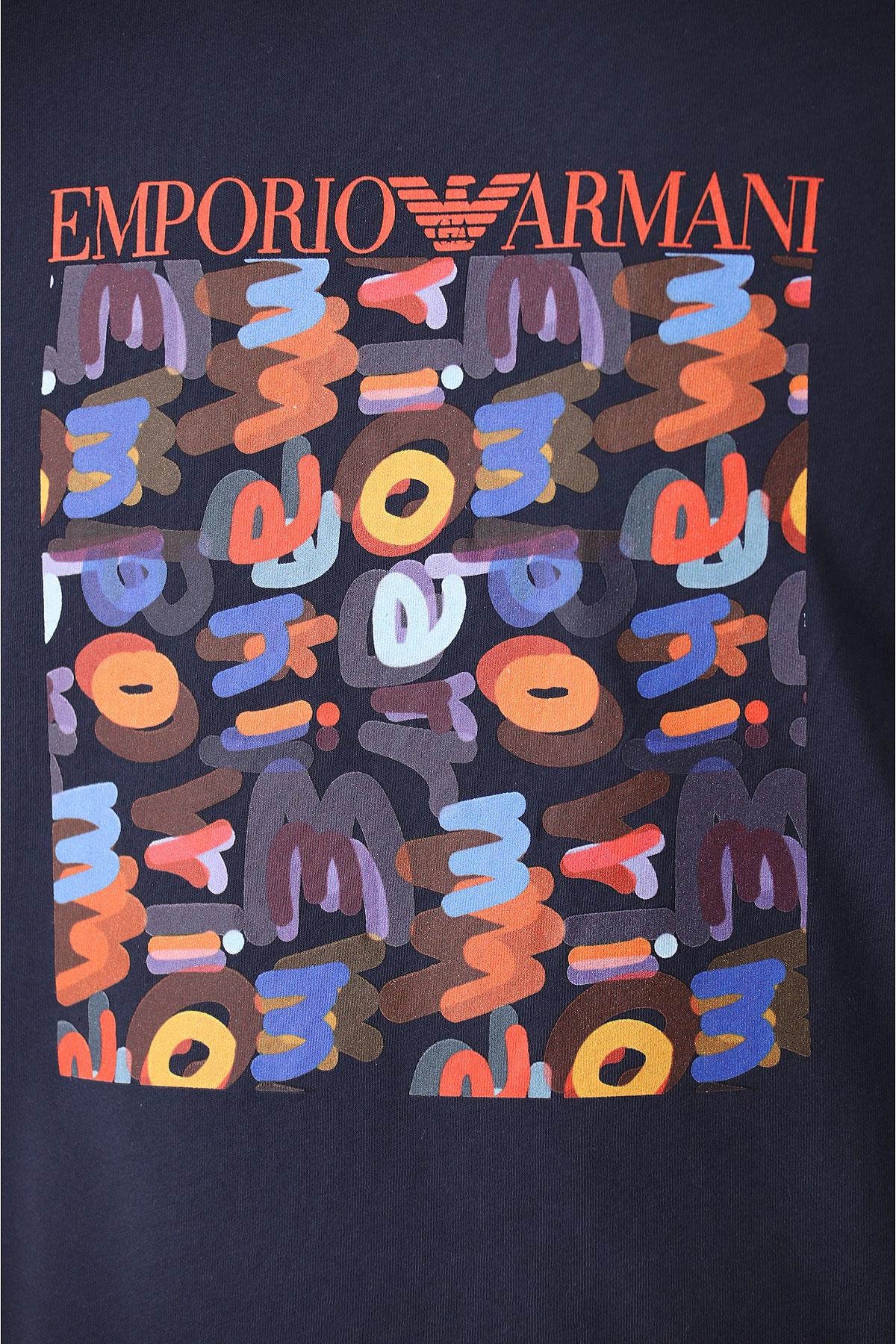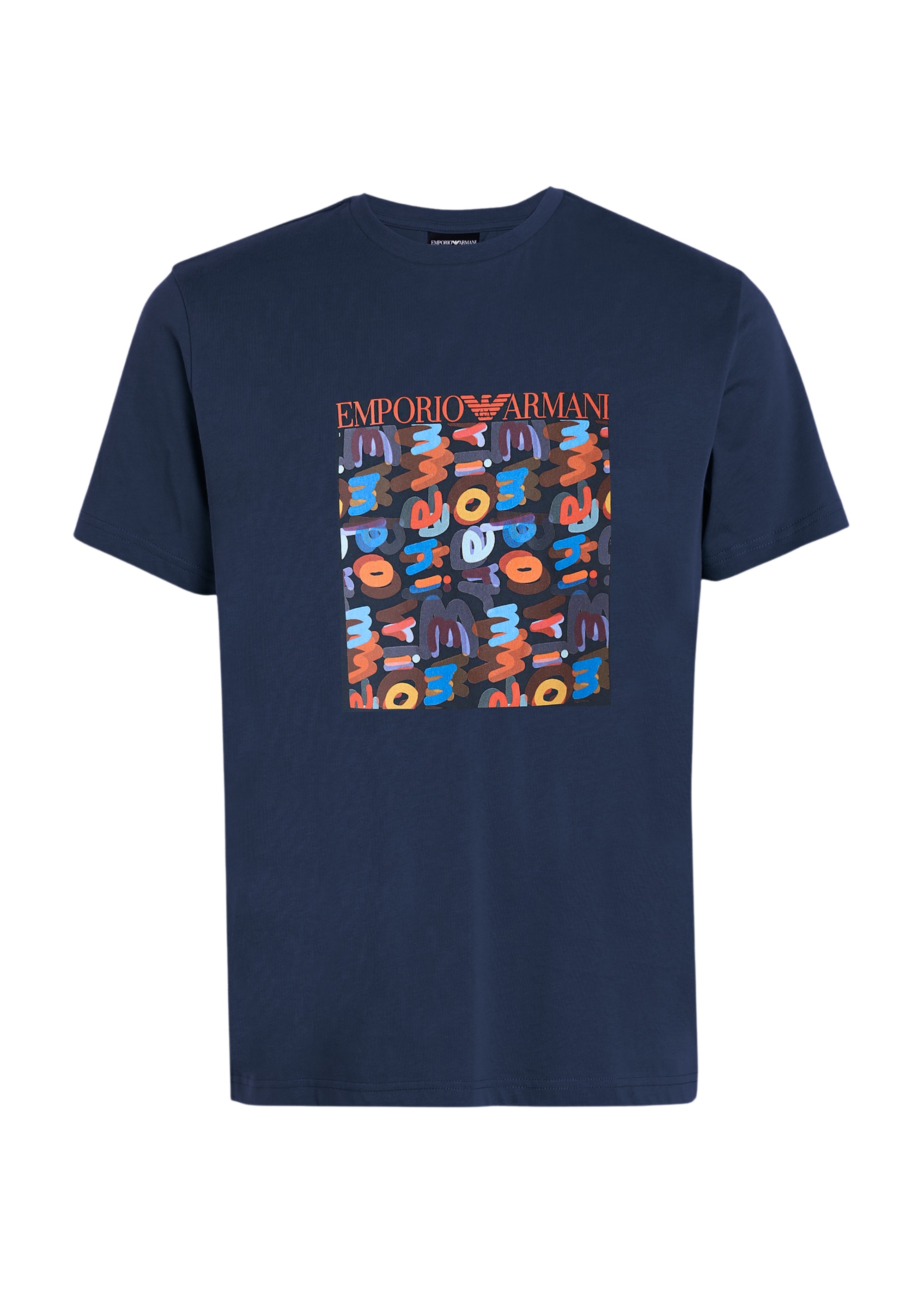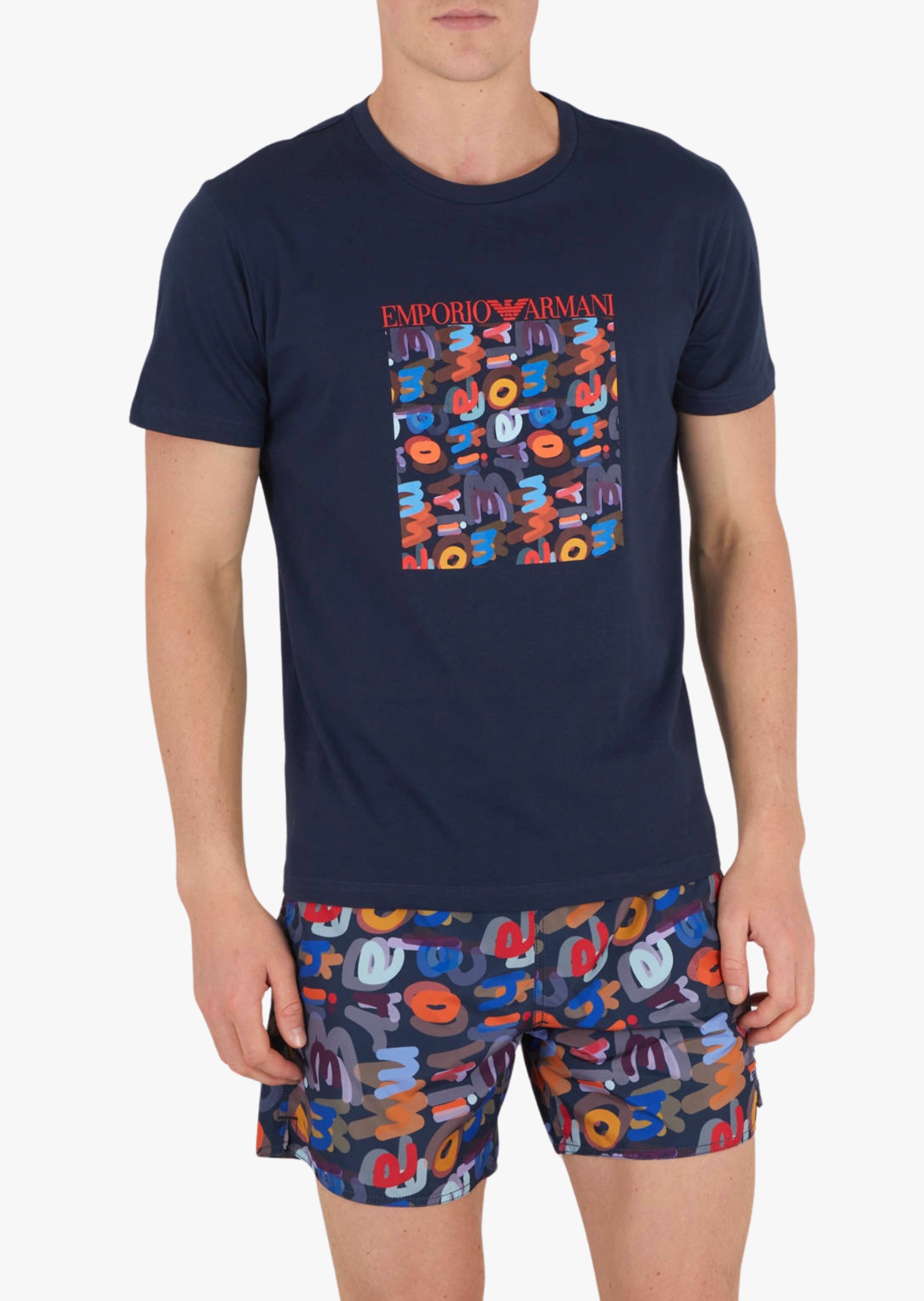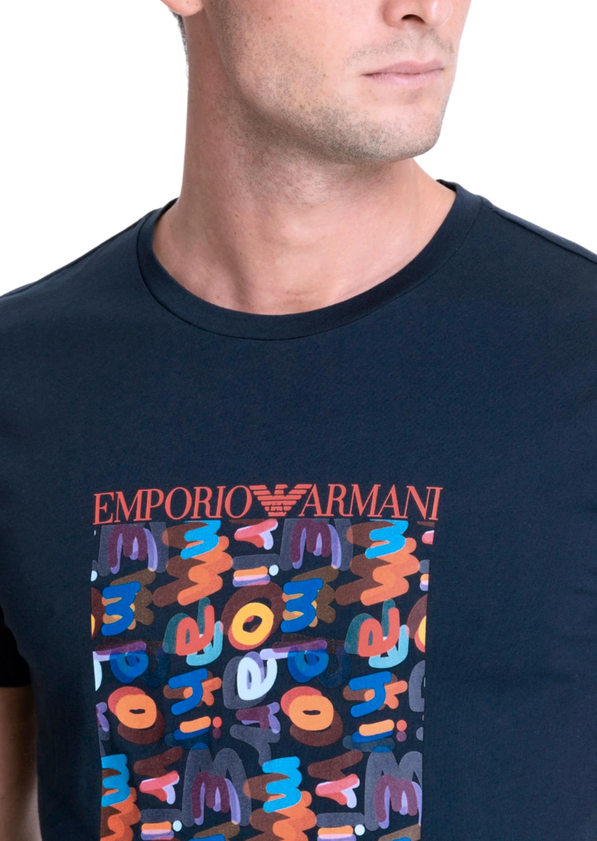 Чоловіча темно-синя футболка EA swimwear із легкої бавовни . Яскравий принт з логотипом на грудях, круглий виріз горловини, короткий рукав, класична довжина