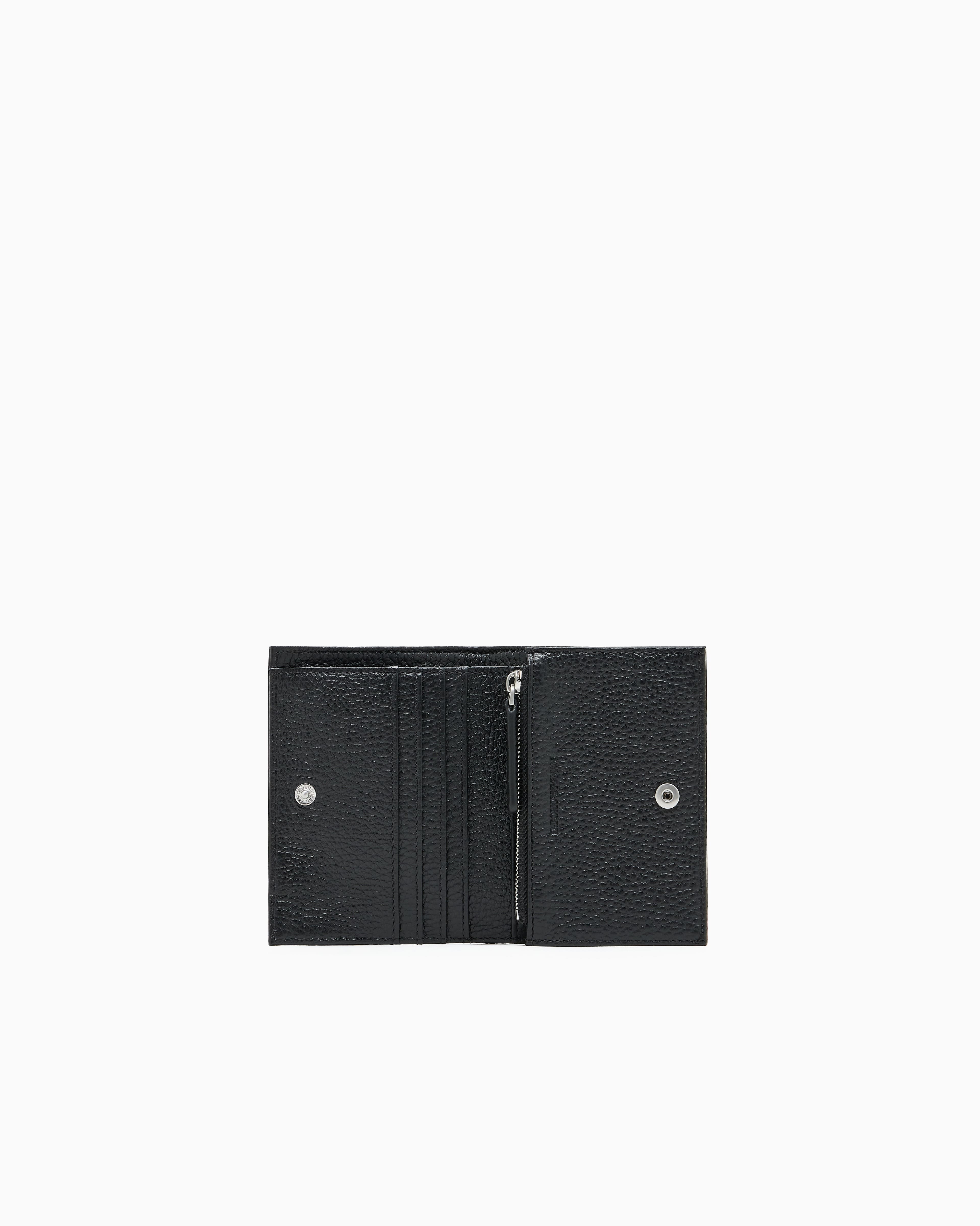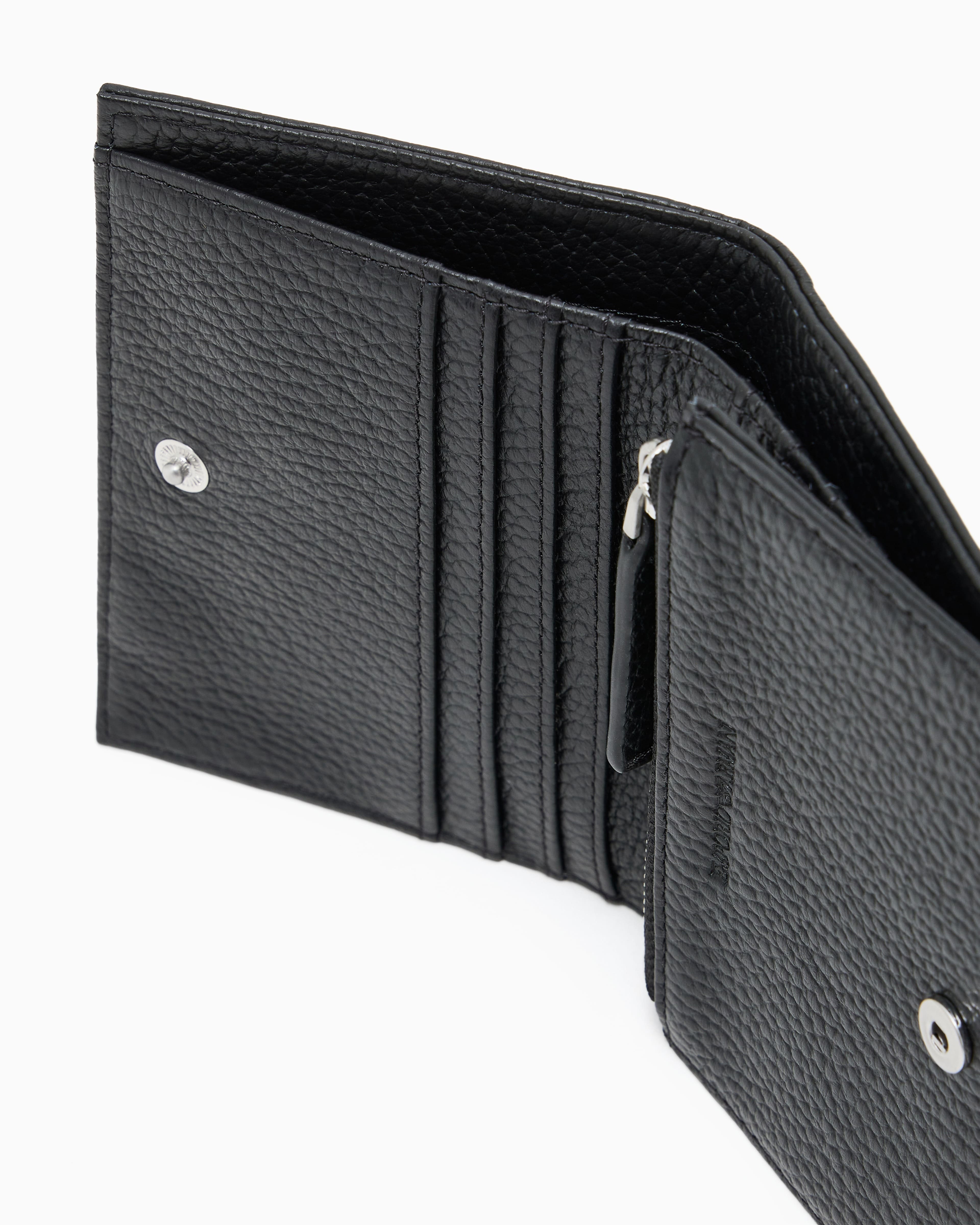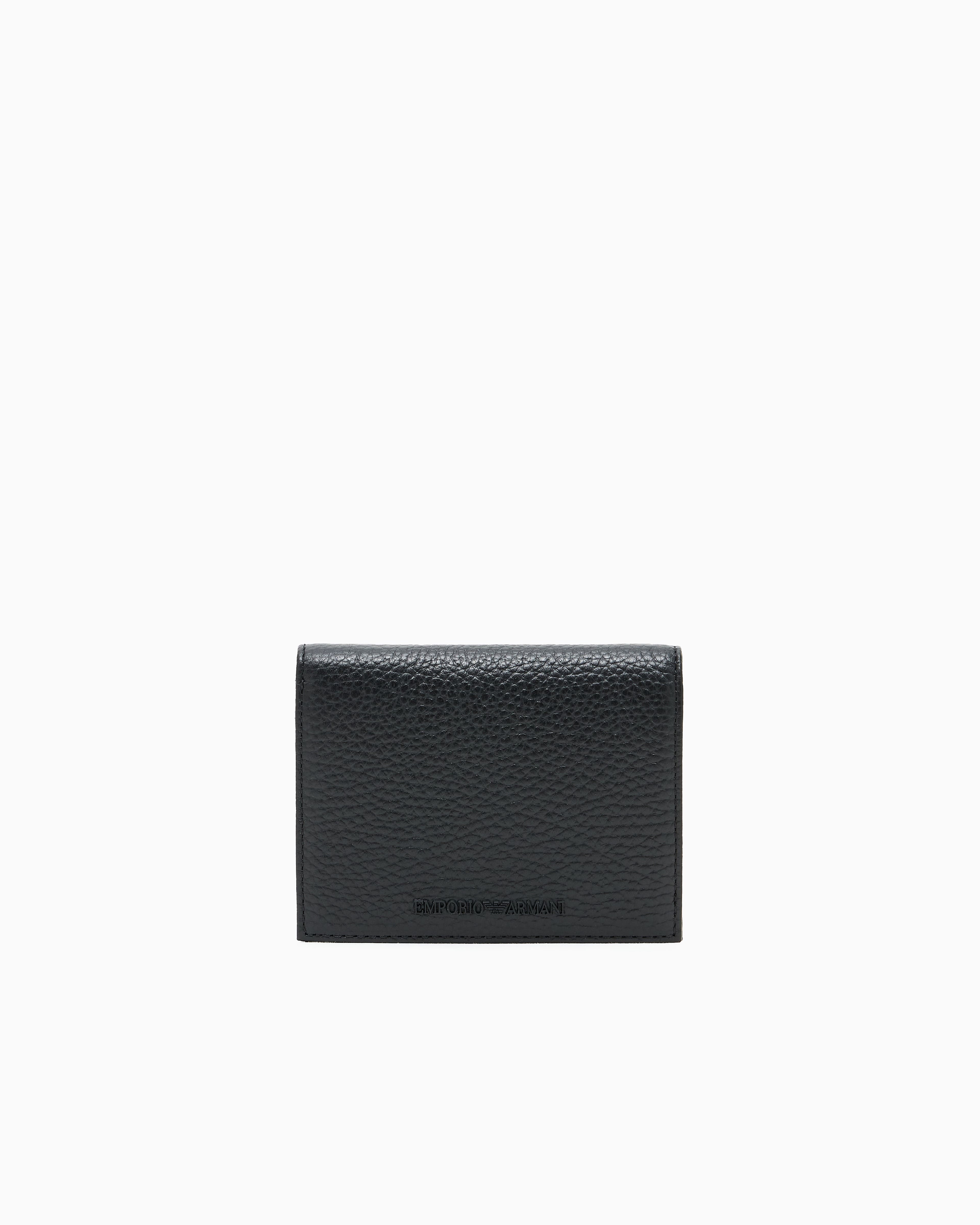 Компактний гаманець чорного кольору, виготовлений із надзвичайно м’якої телячої шкіри з зернистою фактурою, що надає виробу вишуканість і чіткі лінії. Всередині — відділення для карток та купюр, які роблять аксесуар незамінним у повсякденному житті. Логотип Emporio Armani виконаний об’ємною технікою, що підкреслює фірмовий стиль. Підкладка з міцного поліестеру забезпечує довговічність. Розміри: 12×9×1,5 см. Сучасний аксесуар для щоденного використання, який поєднує лаконічну форму і преміальні матеріали.