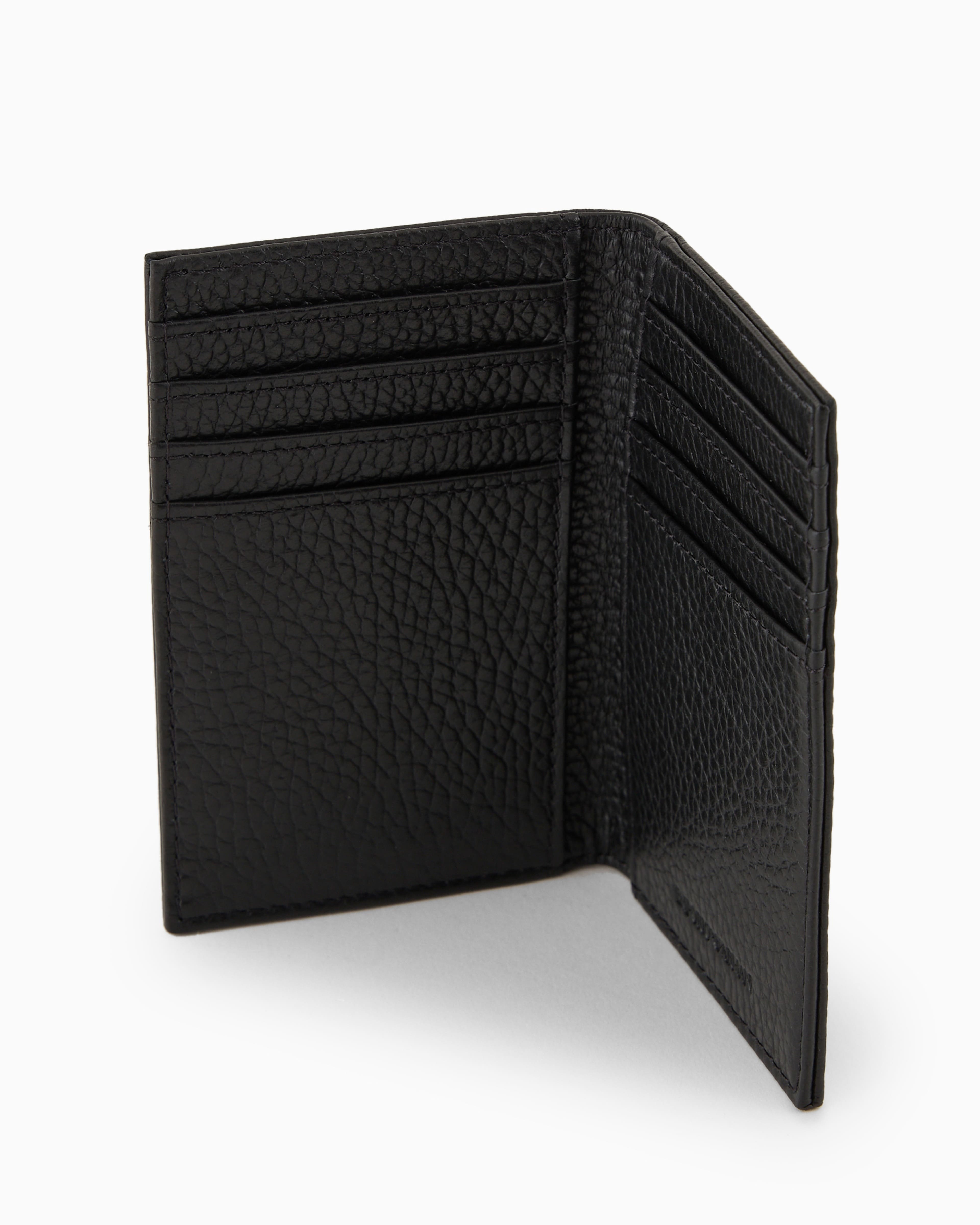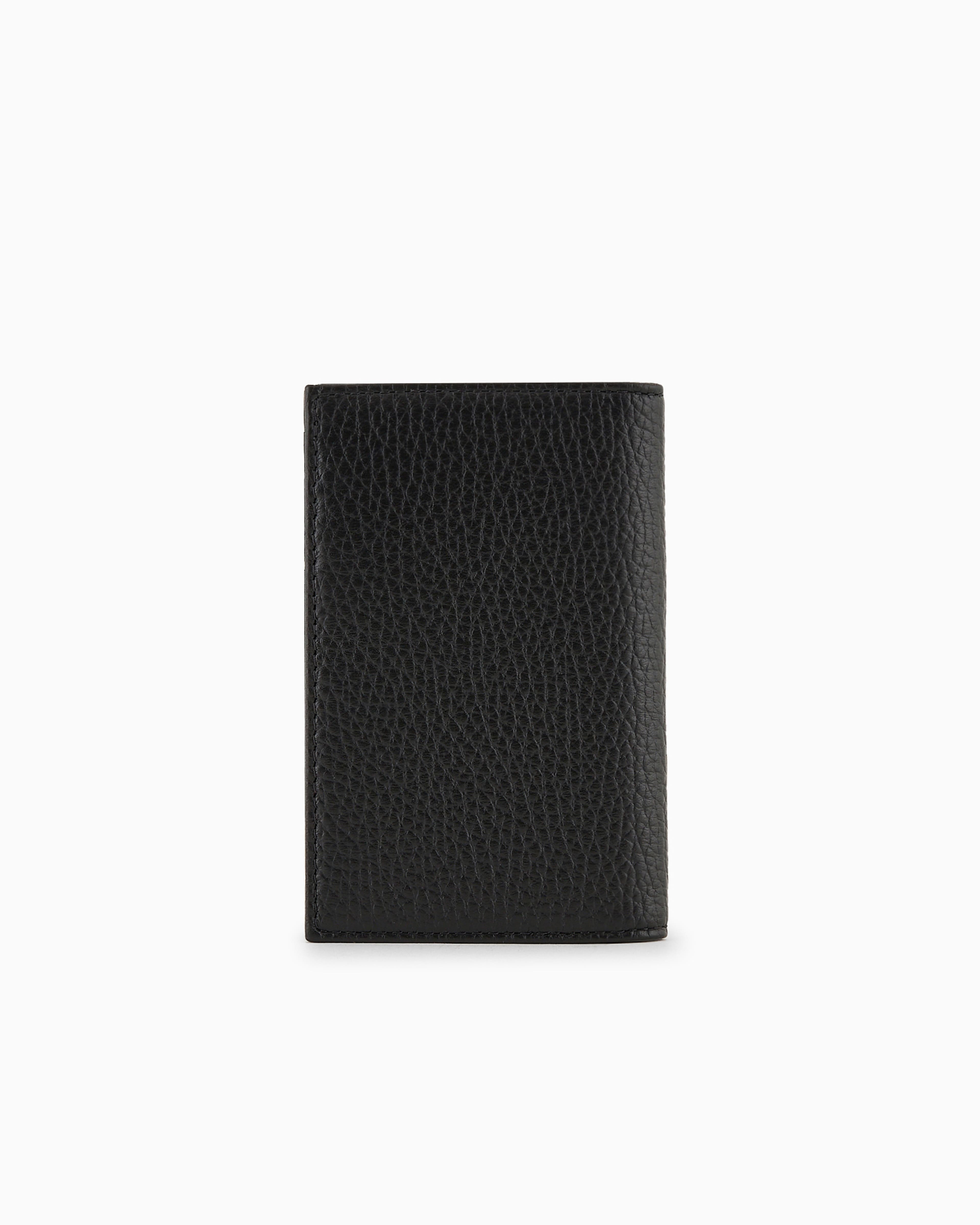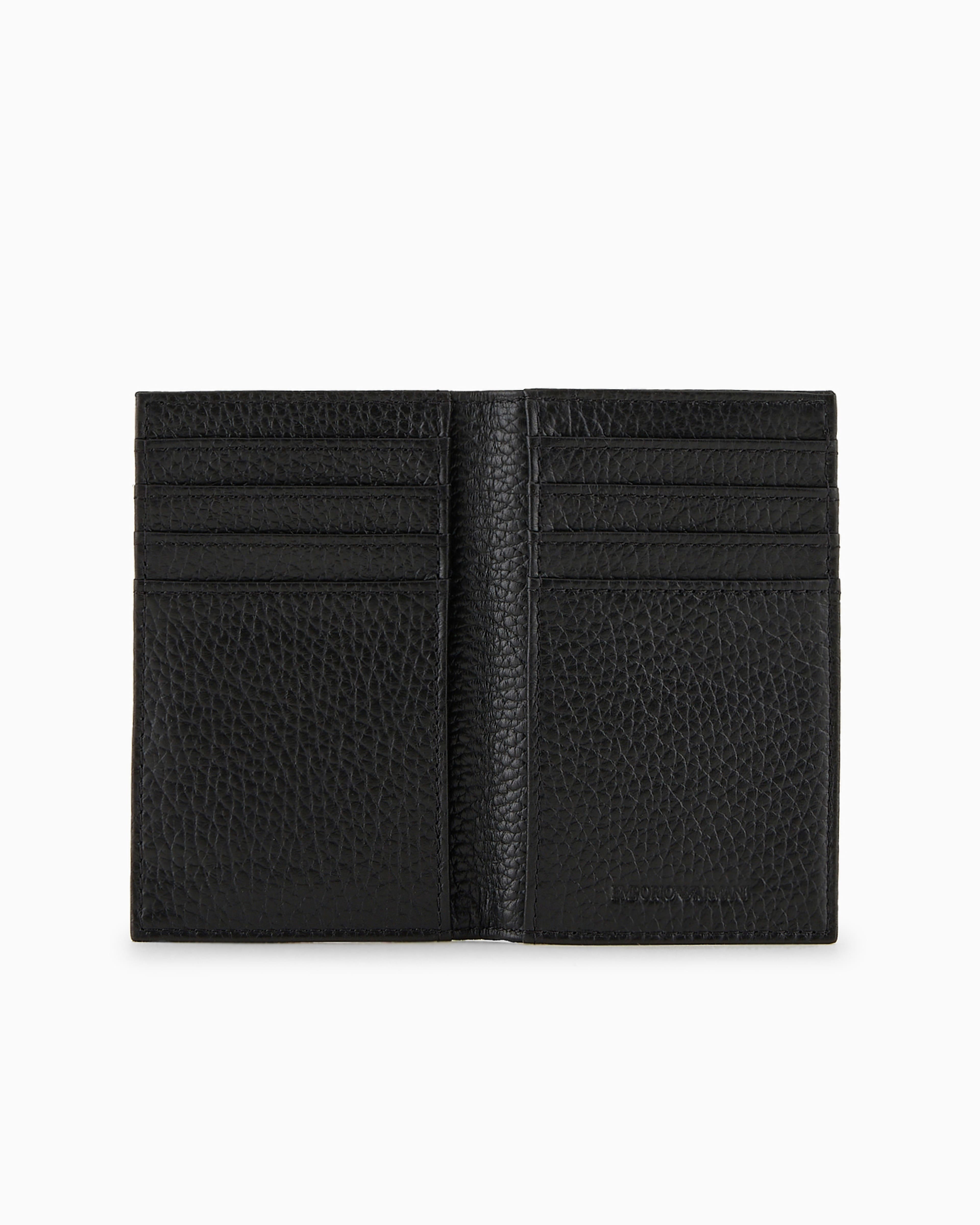 Вертикальний гаманець кардхолдер чорного кольору виготовлений із м’якої телячої шкіри з фактурною зернистістю, що додає аксесуару вишуканості та глибини. Чітка геометрія форм підкреслена об’ємним логотипом Emporio Armani. Усередині — зручні слоти для карт і документів, підкладка з міцного поліестеру.