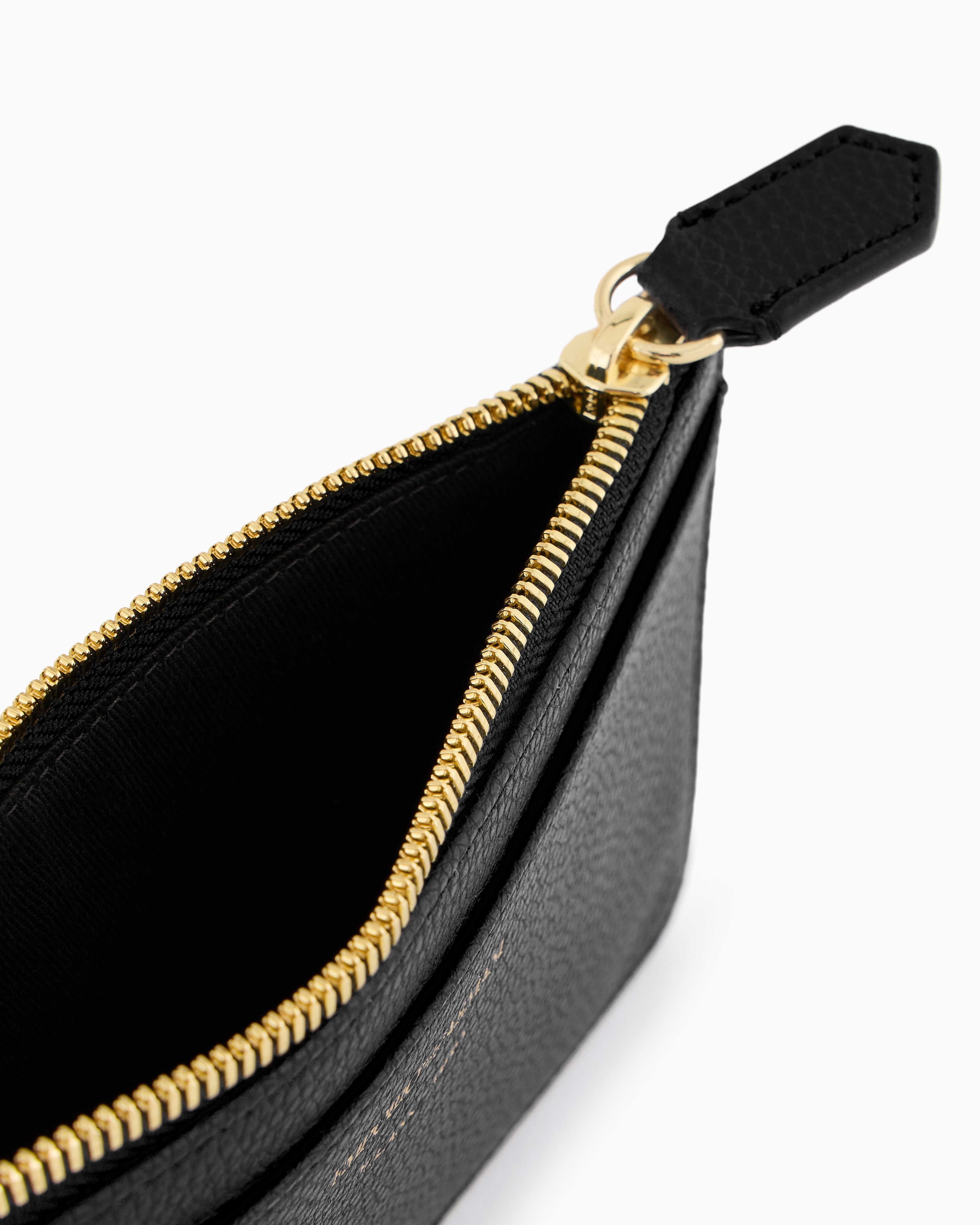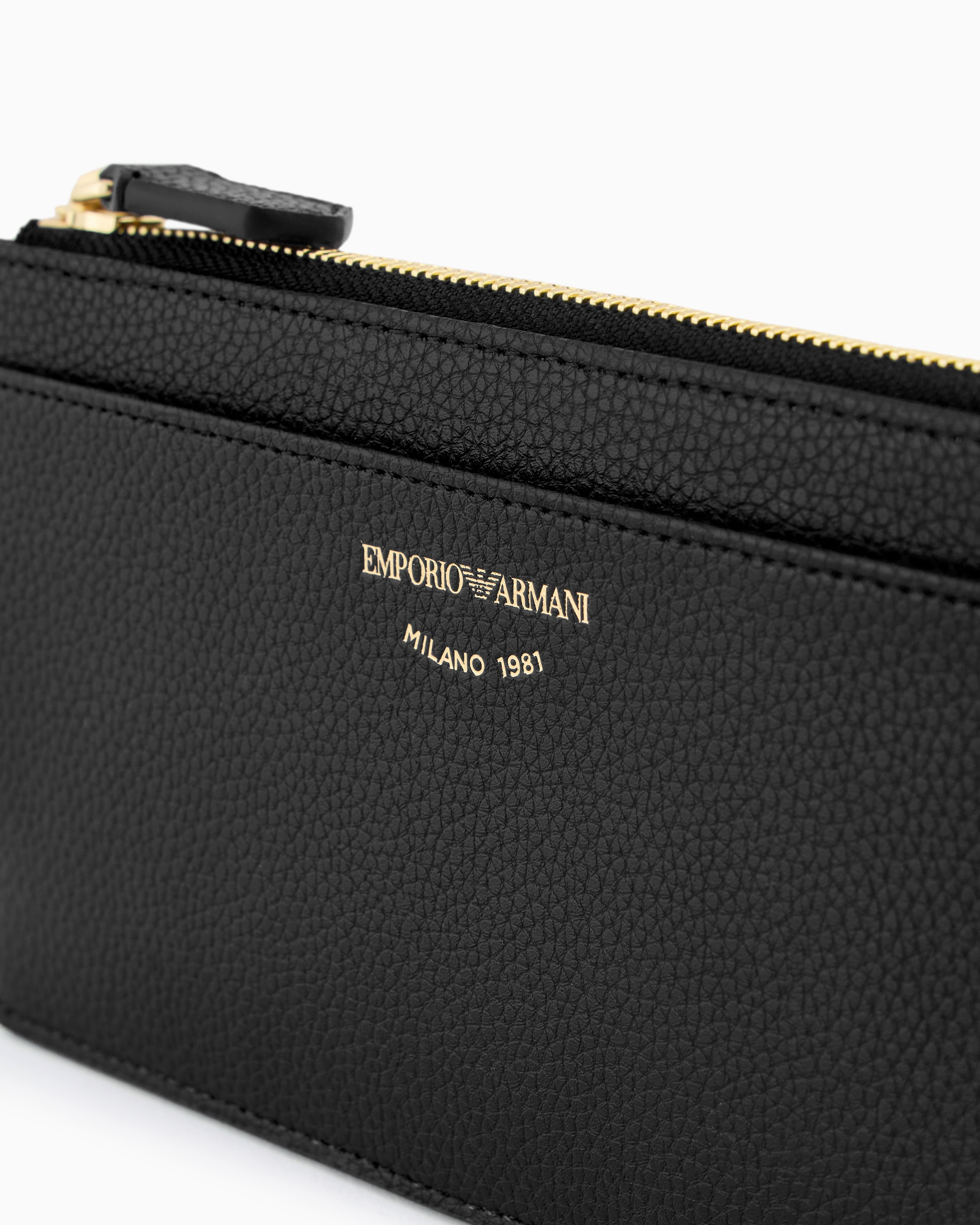 Картхолдер чорного кольору з тисненням під оленя і фірмовим шовкотрафаретним логотипом Emporio Armani поєднує практичність і стриману елегантність. Компактні розміри (18 × 10 × 2 см) роблять його зручним для зберігання карток і дрібниць: аксесуар доповнено основним відділенням на блискавці й зовнішньою відкритою кишенею.