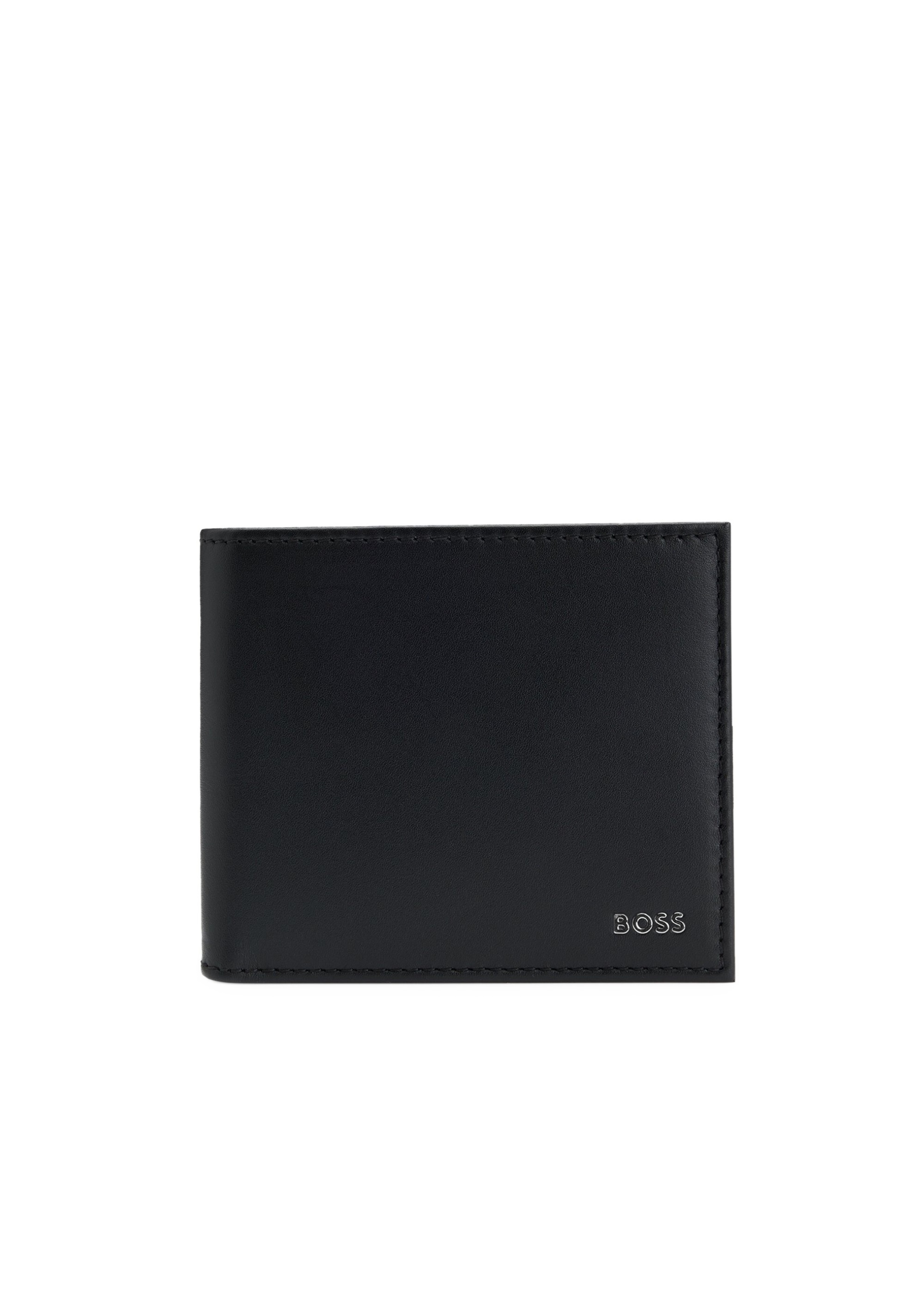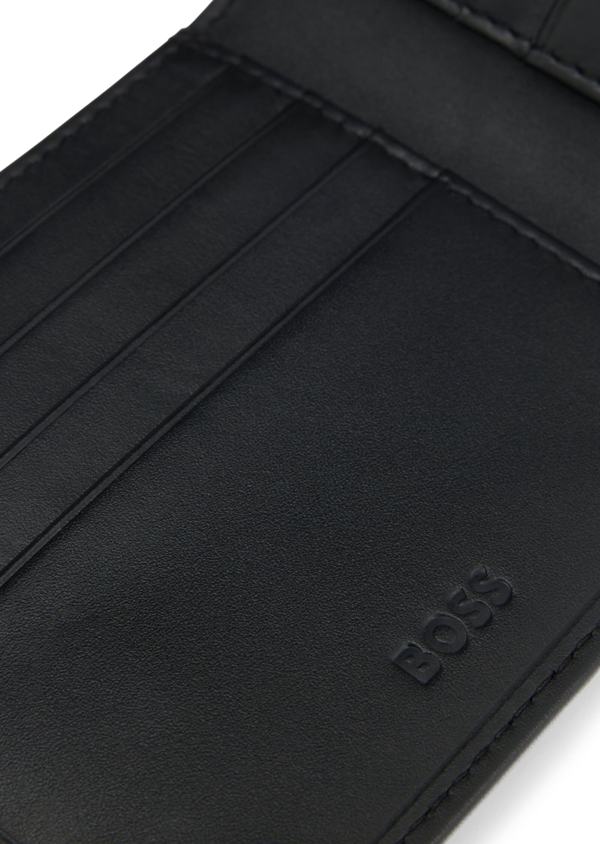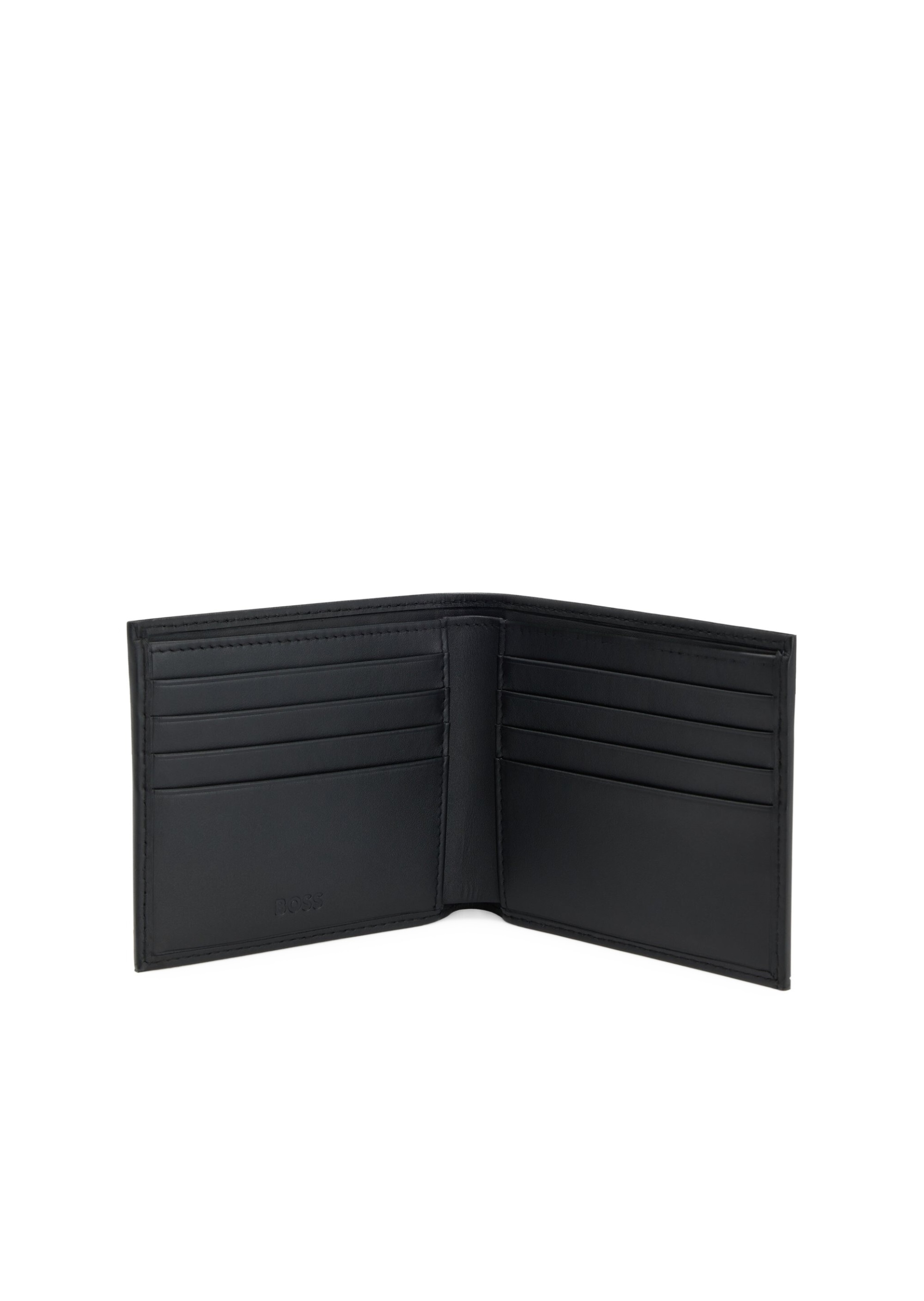 Гаманець BOSS виготовлений з гладкої шкіри чорного кольору, що підкреслює його елегантний та сучасний стиль. Розмір виробу робить його компактним та зручним для повсякденного використання. Всередині передбачені кілька слотів для карток та відділення для купюр, забезпечуючи порядок та зручність зберігання. Тиснений логотип BOSS на зовнішній стороні додає аксесуару преміальний акцент.